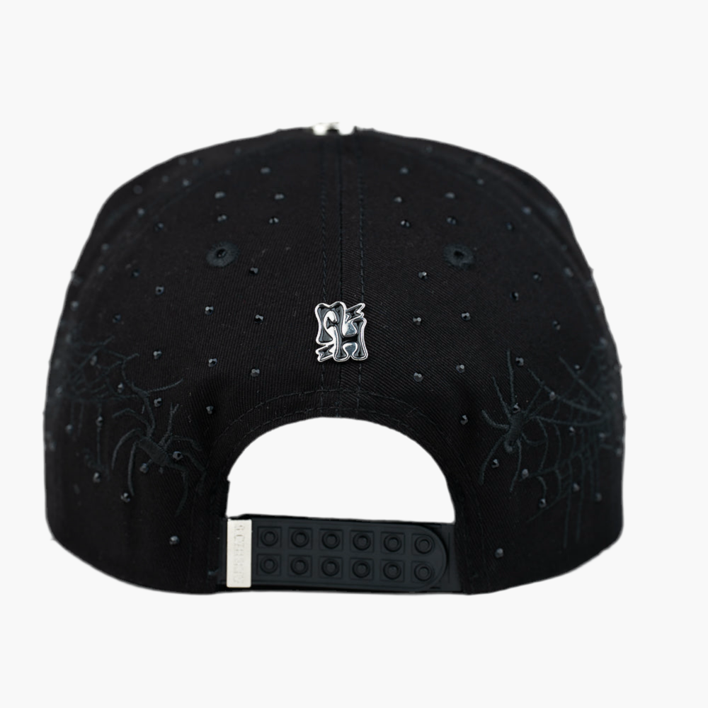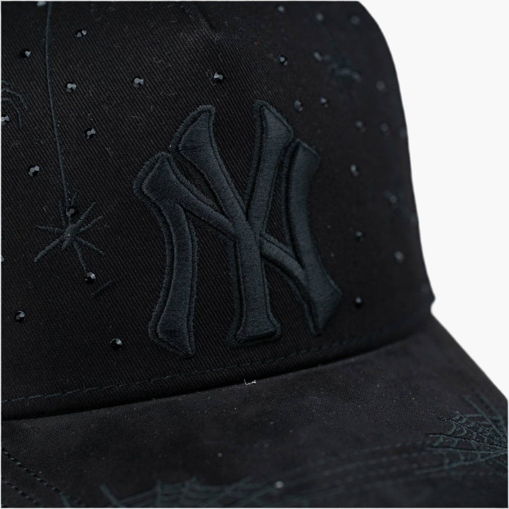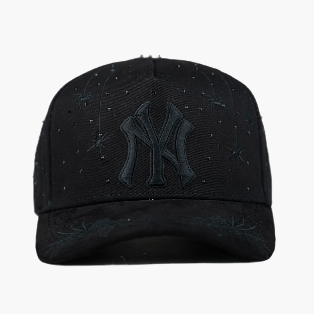 Esta gorra negra "NEY YORK " presenta el logo NY bordado en negro en el frente. Todo el diseño está decorado con piedras brillantes que resaltan su estilo único. Además, incluye detalles sutiles de telarañas y pequeñas arañas, aportando un toque original y atrevido a la prenda.