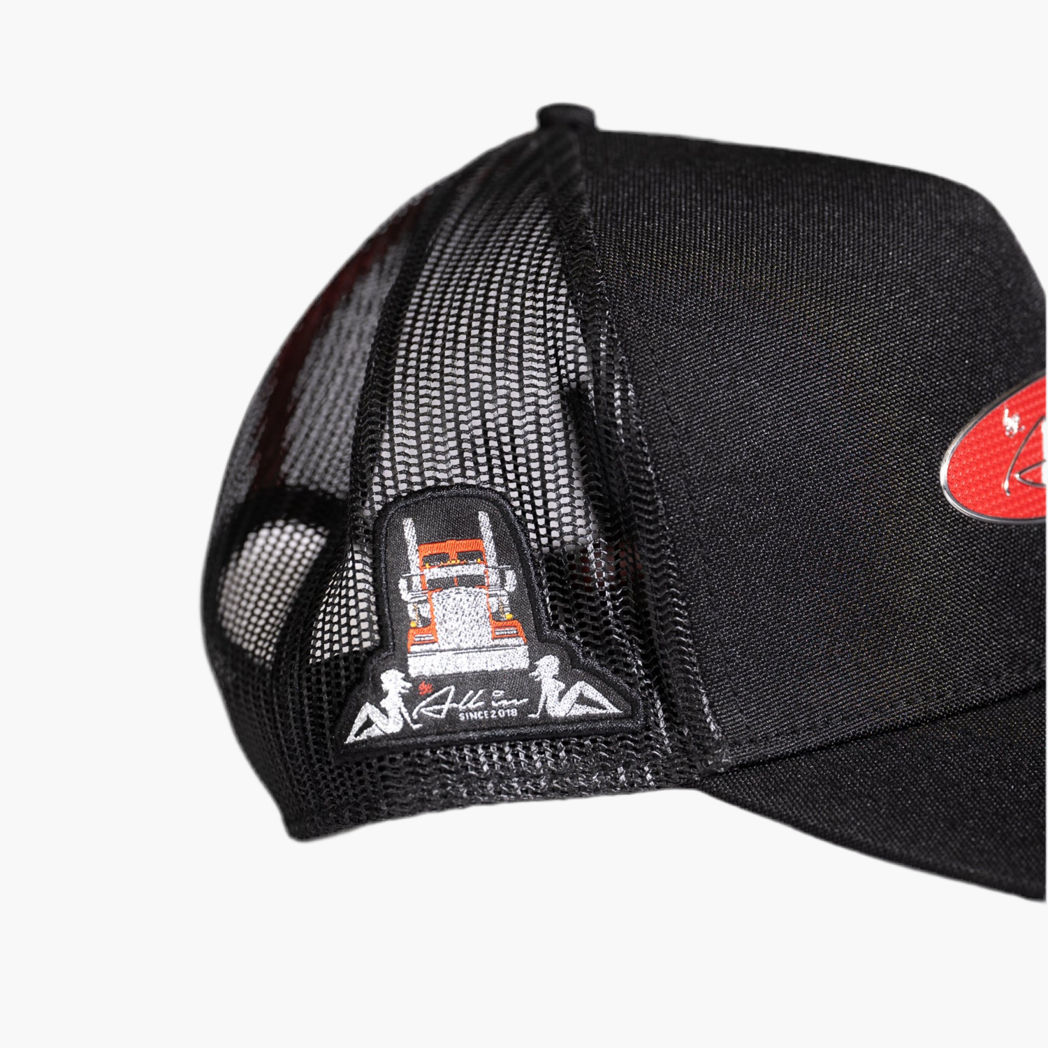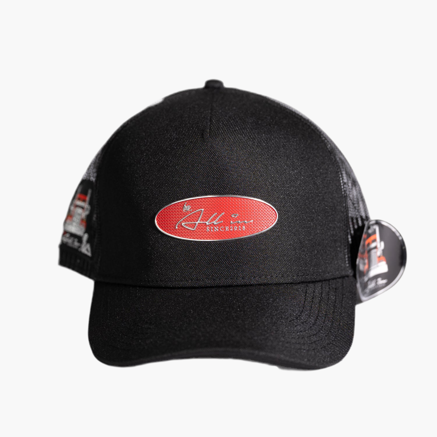Gorra de malla negro con una placa Roja en el centro, que destaca por el texto "ALL IN" grabado en la placa. Este diseño combina colores vibrantes y detalles modernos, ofreciendo un accesorio fresco y llamativo, ideal para complementar looks atrevidos y deportivos con estilo único.