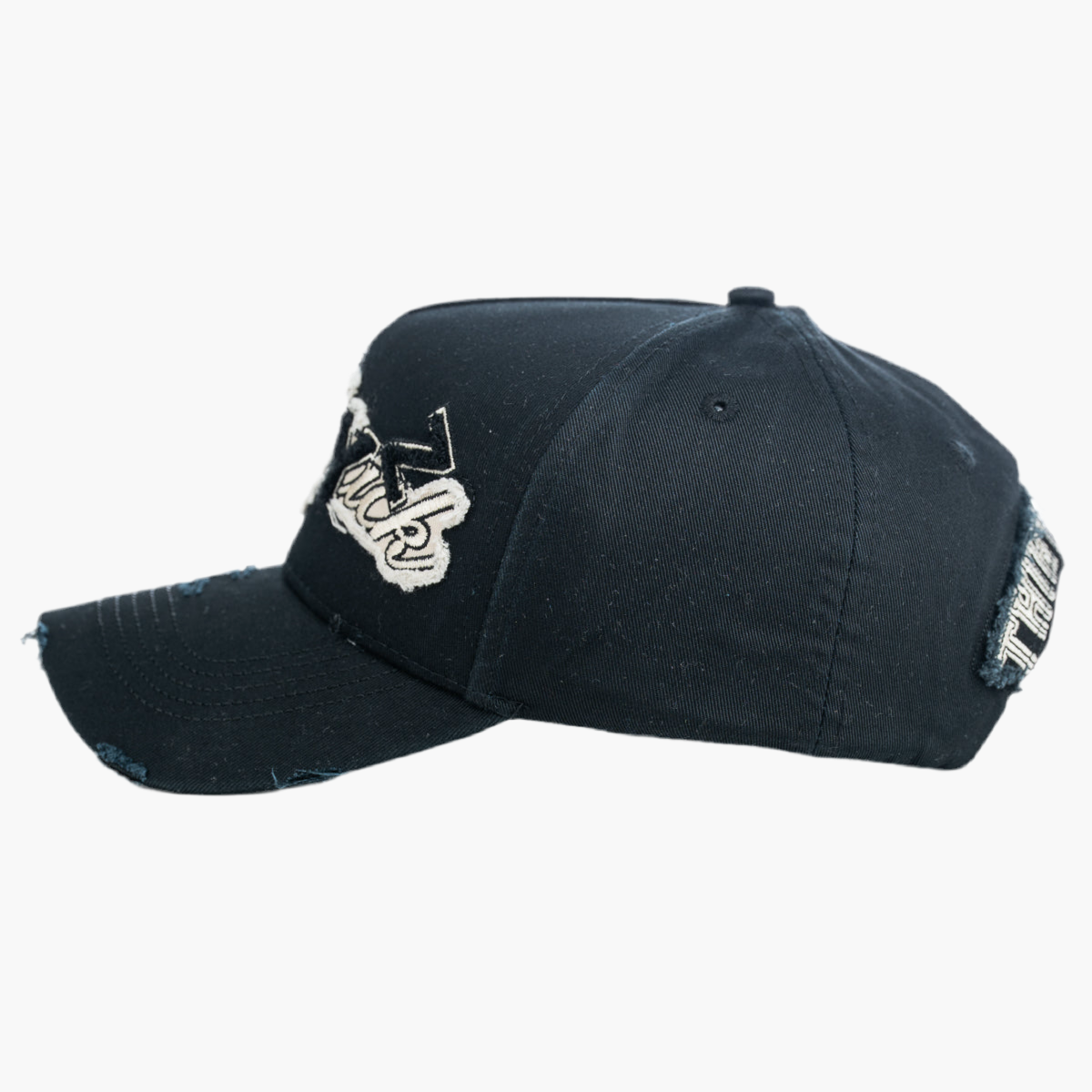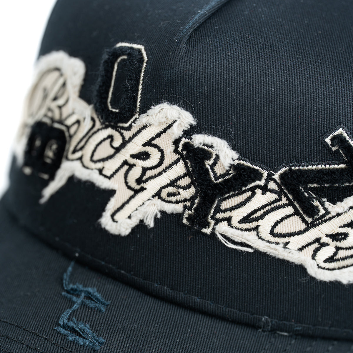 Esta gorra negra destaca por la palabra "backpacks" en blanco con textura pelusa y efecto desgastado. La palabra "Boyz" aparece bordada en negro, con cada letra posicionada de forma dispersa, creando un diseño dinámico y moderno que aporta un estilo urbano y único a la prenda.