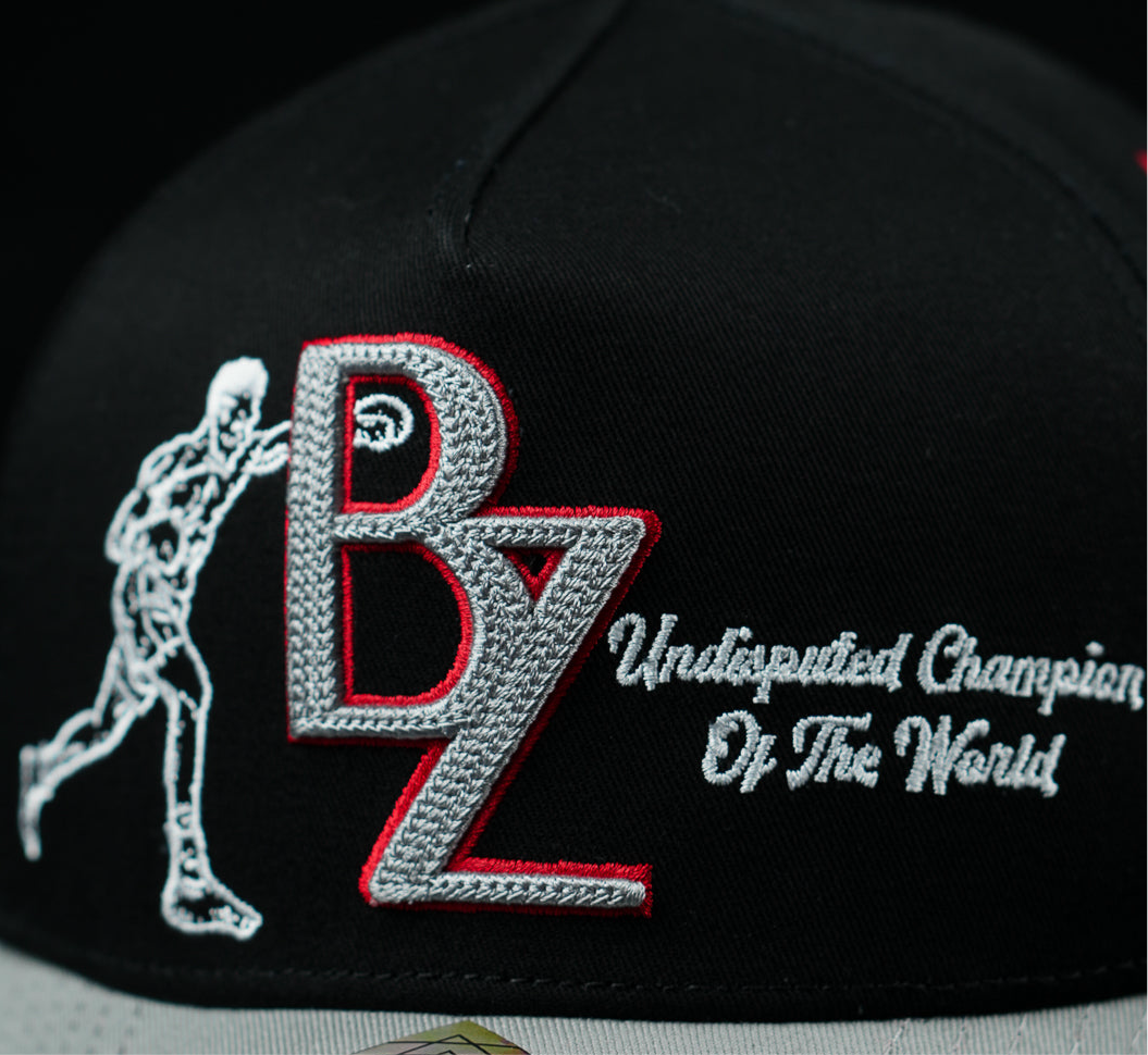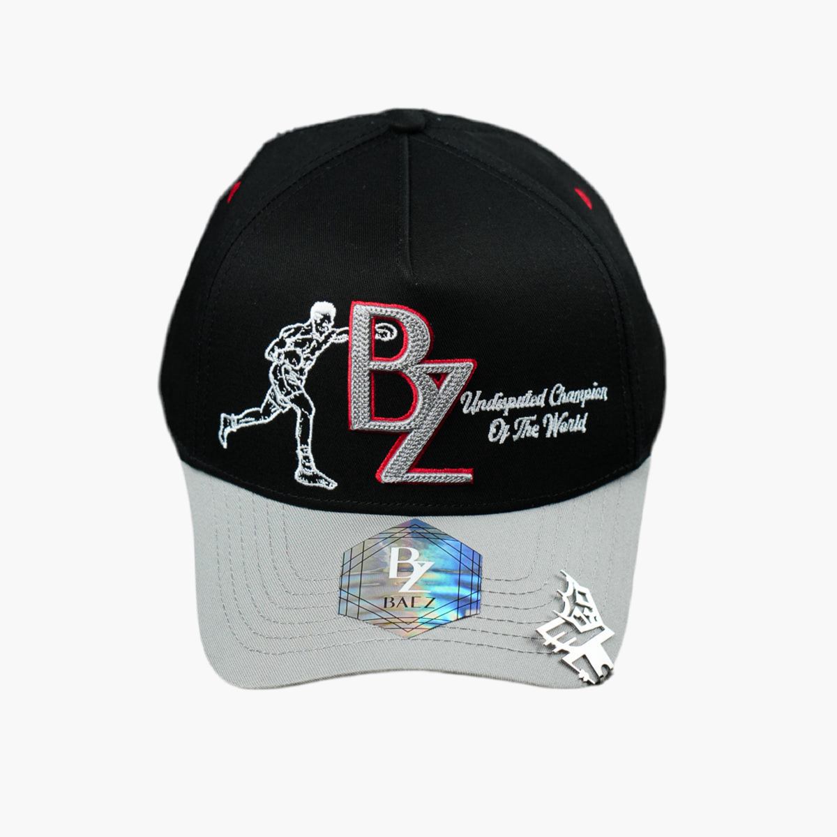 Gorra negra con el logo "BZ" bordado en gris y borde rojo en el centro. En la parte derecha, destaca una persona bordada lanzando un fuetazo hacia el logo, creando un diseño dinámico y llamativo. Perfecta para quienes buscan estilo con un toque único y audaz.