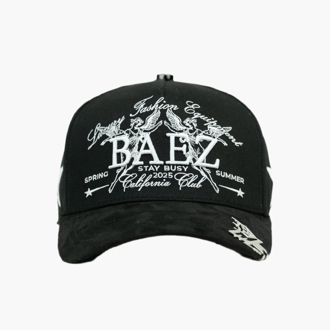 Esta gorra negra presenta el texto "BAEZ" bordado en blanco en el centro. Detrás, dos ángeles blancos adornan el lado derecho, mientras que una estrella gris decora el lado izquierdo. Su diseño equilibrado combina elegancia y estilo, perfecto para quienes buscan un toque distinguido en su look.