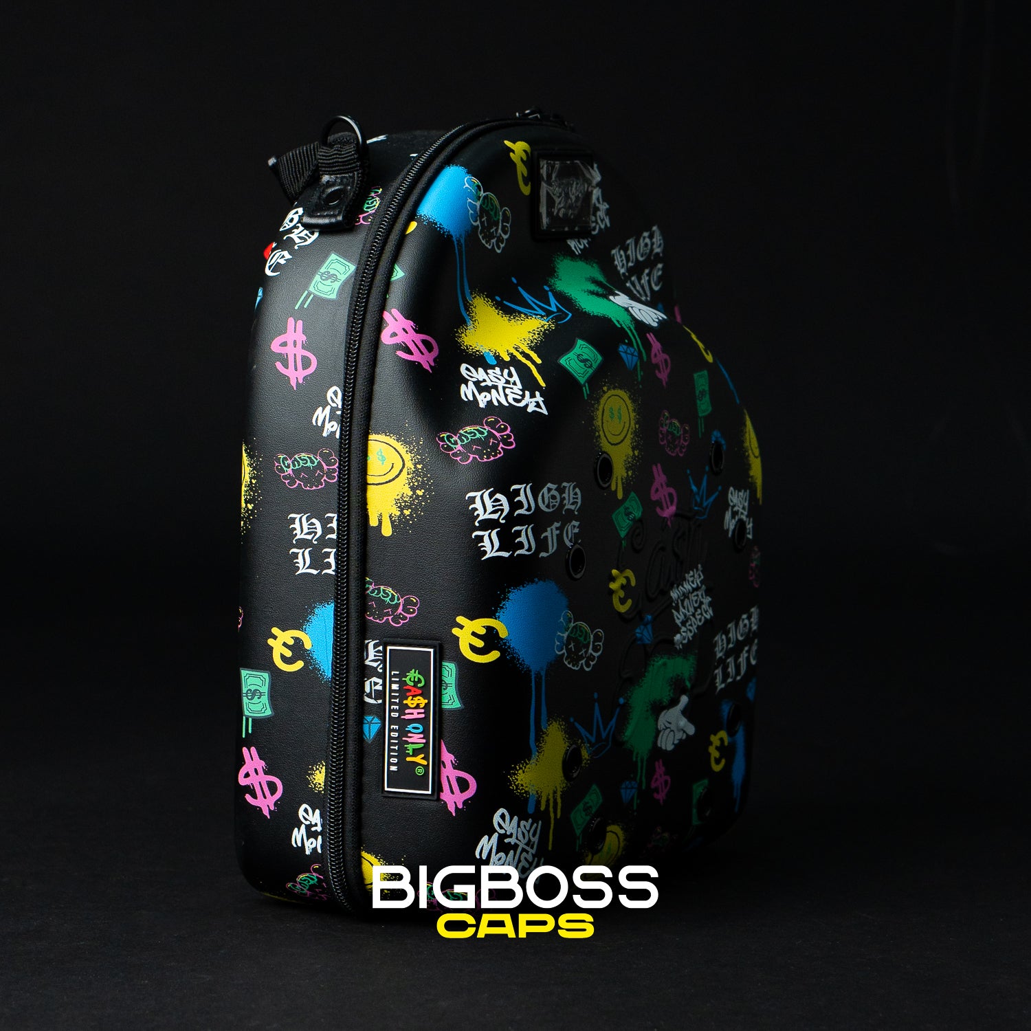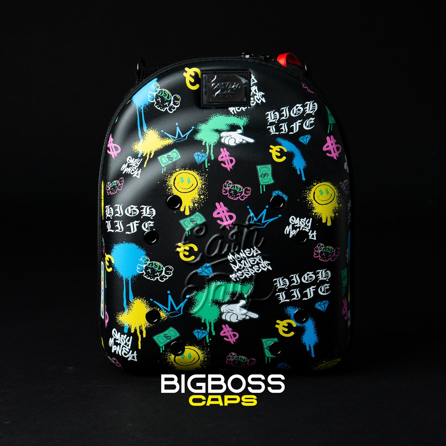 Este cap carrier negro destaca por su vibrante diseño de grafiti en colores amarillo, azul y rosa, que aporta un toque urbano y moderno. Perfecto para transportar y proteger tus gorras con estilo, combina funcionalidad y personalidad en un accesorio práctico y llamativo para uso diario.