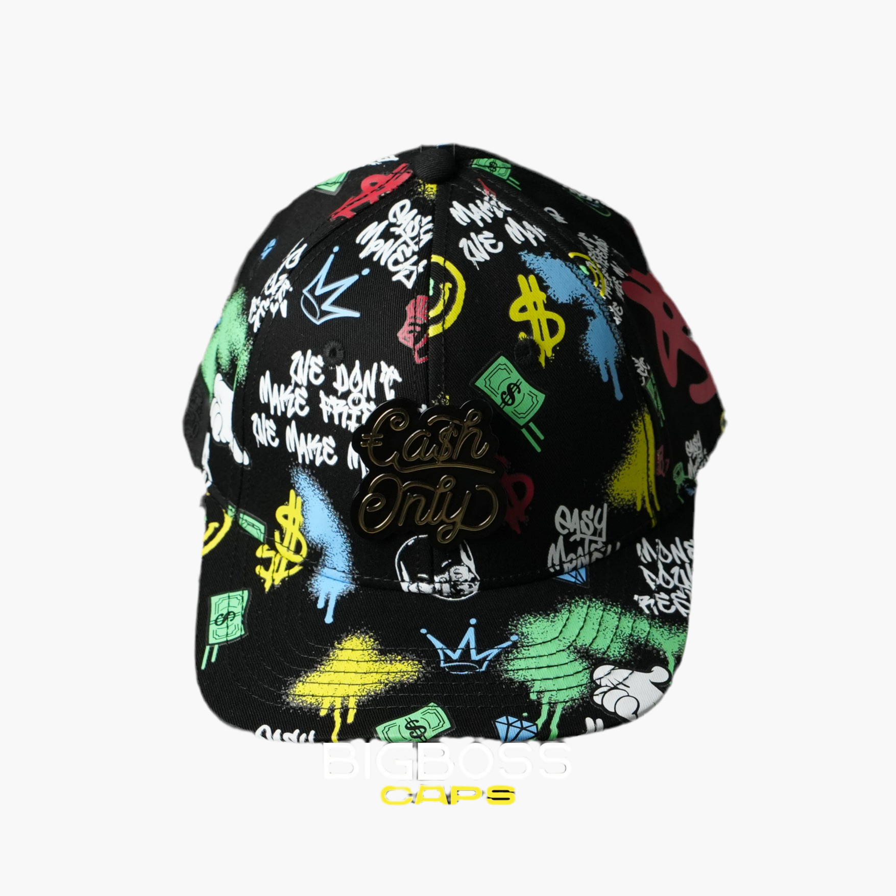 Esta gorra negra destaca por su diseño vibrante en grafito de colores, que aporta un toque moderno y llamativo. En la parte frontal, luce una placa dorada con la frase "Cash Only", que resalta con elegancia y le da un carácter exclusivo y único a la prenda.