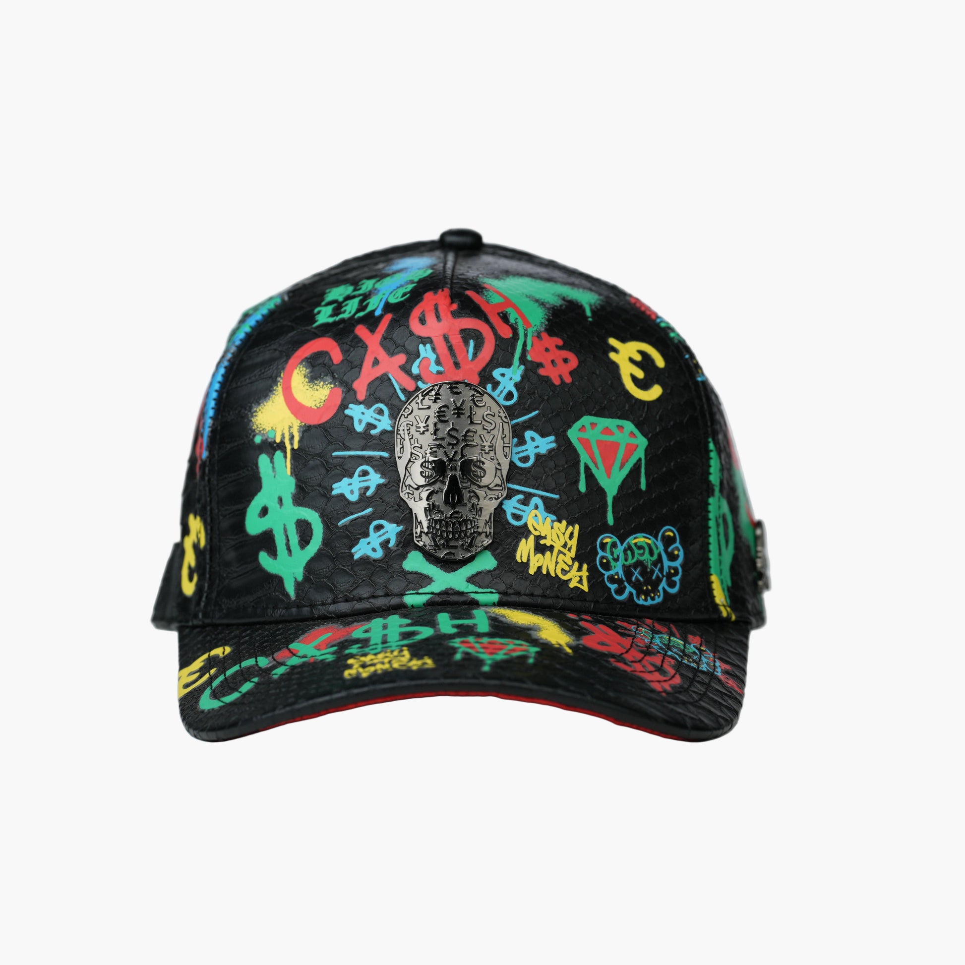 La gorra Black Grafiti de color negro presenta un diseño vibrante de grafitis en rosa, verde y azul que cubre toda la prenda. En la parte frontal destaca una placa negra con una calavera, aportando un estilo urbano y audaz ideal para quienes buscan impresionar con un look único y moderno.