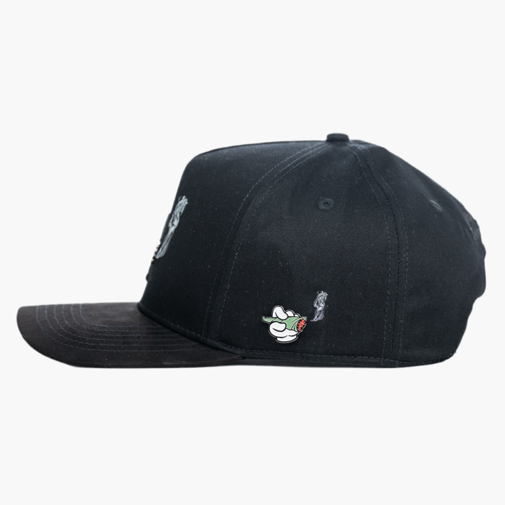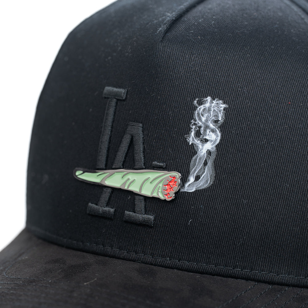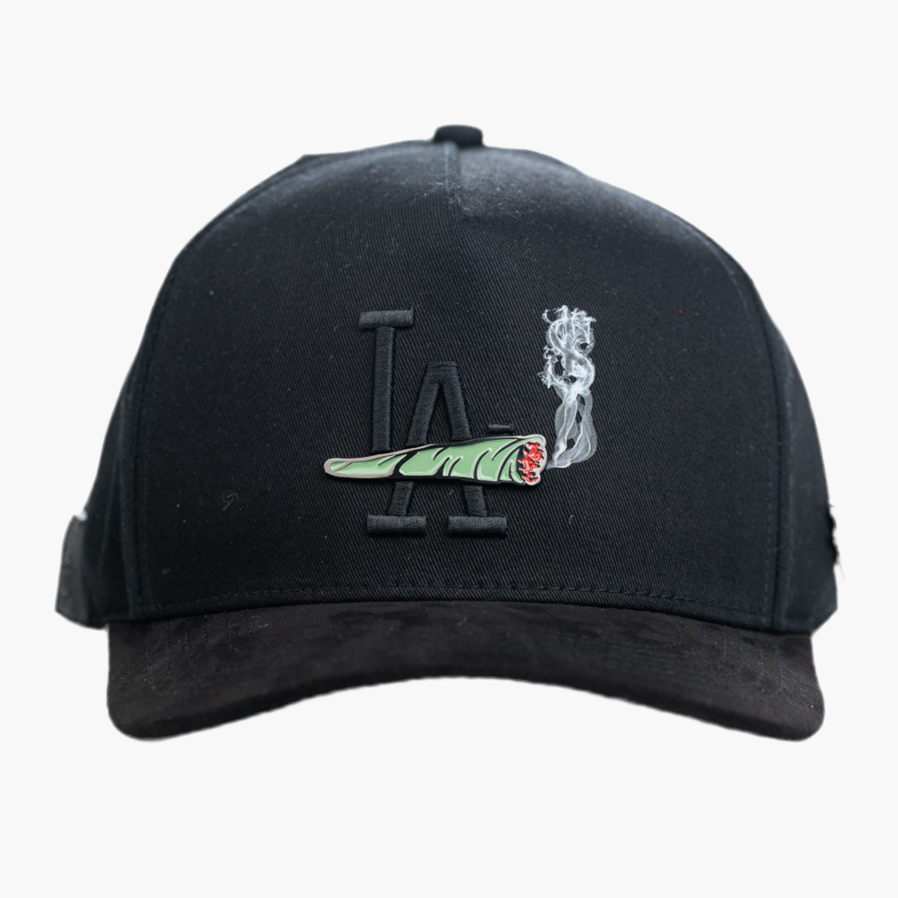 Esta gorra negra muestra en la parte frontal un pin con un churro de mota, destacando por su diseño atrevido. Detrás del pin, un logo bordado en negro con las letras "LA" añade un detalle urbano y distintivo, combinando estilo y personalidad en un accesorio único.