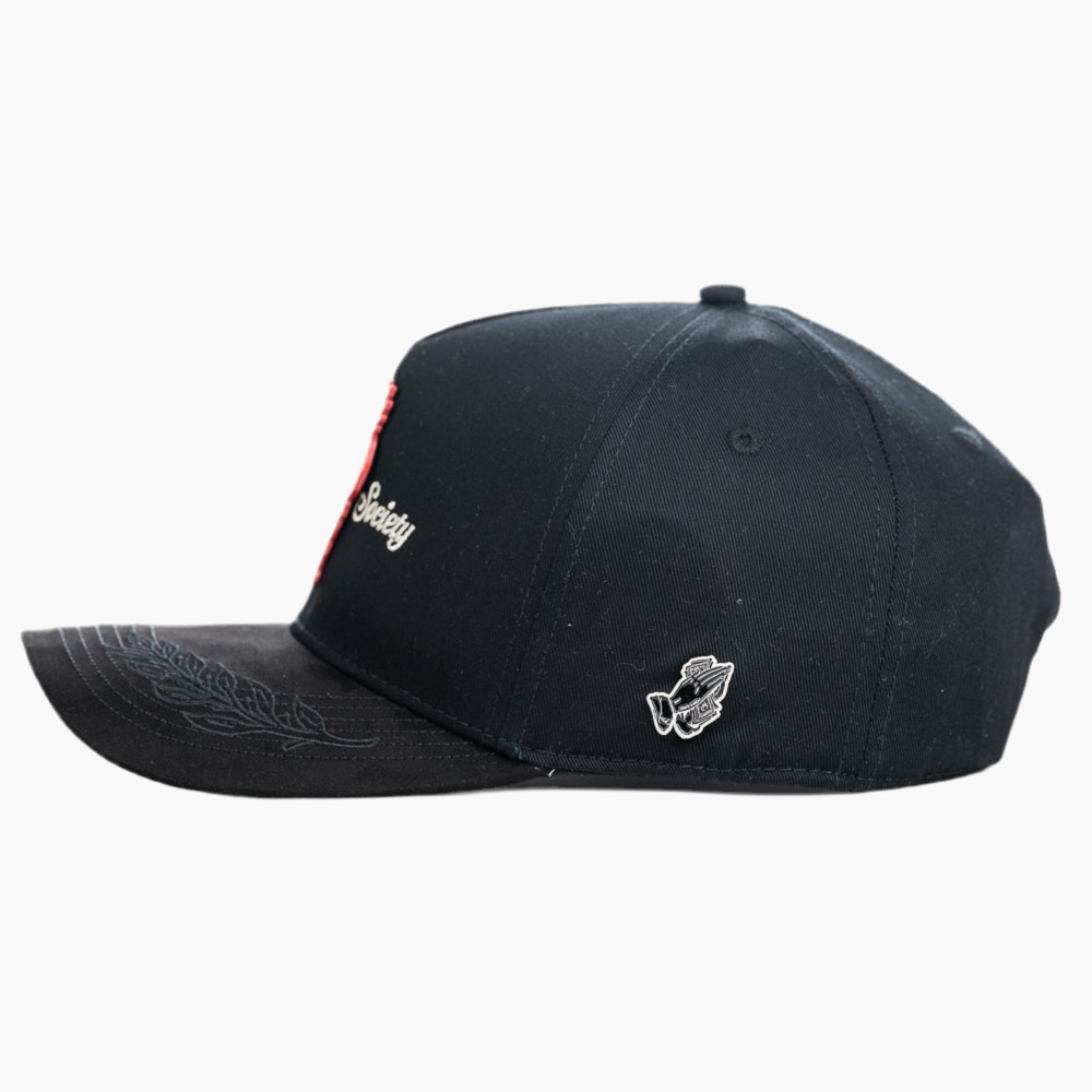Esta gorra negra presenta un pin de ángel blanco con bordes rojos, creando un contraste llamativo. Justo detrás del pin, un texto bordado en blanco dice "Crime Society", aportando un detalle único y audaz que combina estilo y personalidad para un look urbano e impactante.