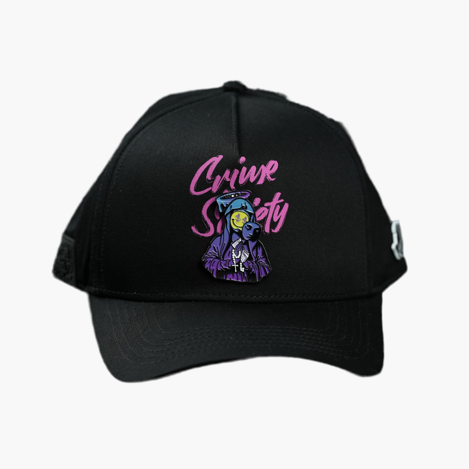 Esta gorra negra presenta en el centro una placa metálica con un diseño de esqueleto cubierto por una capa morada, que añade un toque oscuro y llamativo. Su estilo único y detalles cuidados hacen de esta pieza un accesorio perfecto para quienes buscan un look atrevido y original.