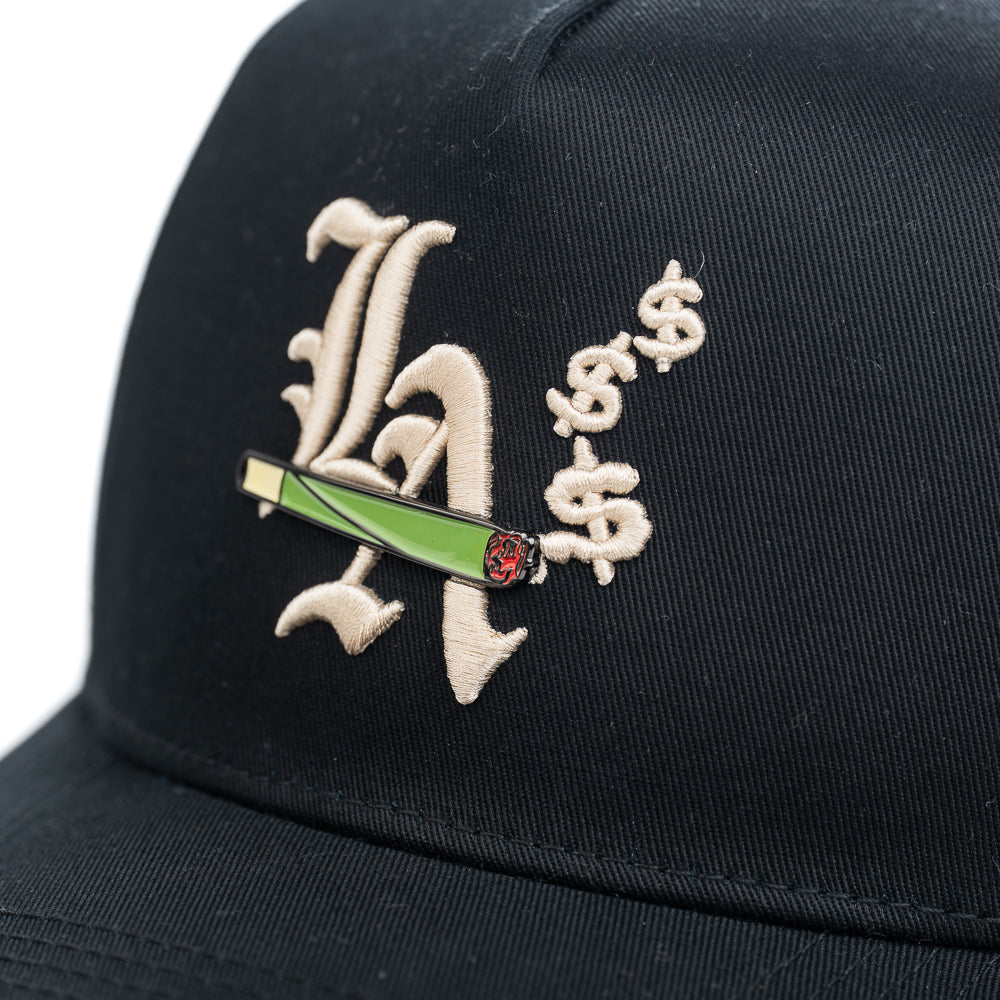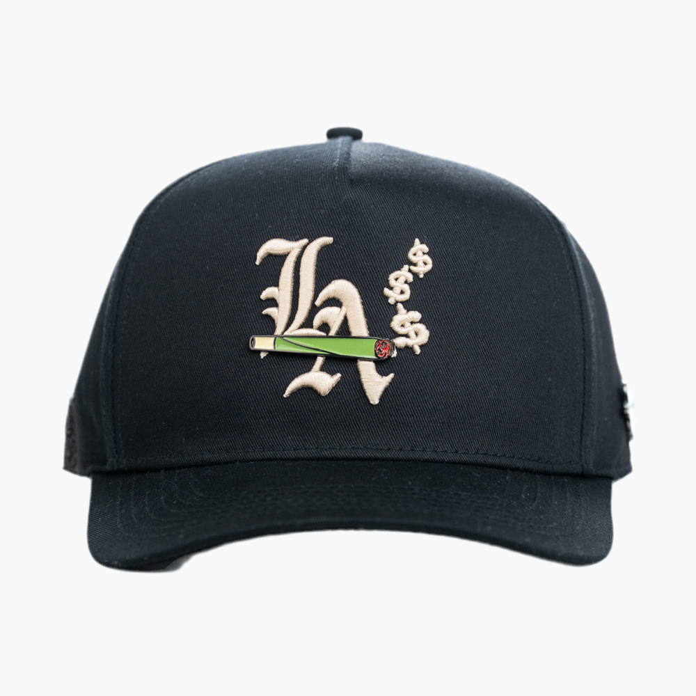 Esta gorra negra muestra en la parte frontal un pin con un churro de mota, destacando por su diseño atrevido. Detrás del pin, un logo bordado en blanco con las letras "LA" añade un detalle urbano y distintivo, combinando estilo y personalidad en un accesorio único.