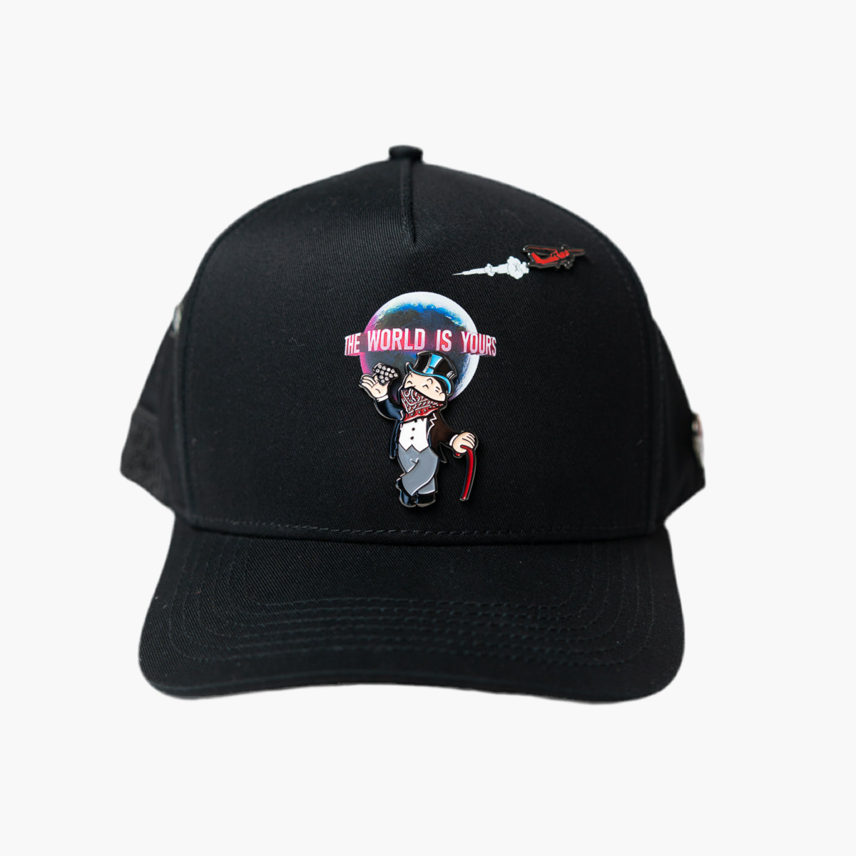 Esta gorra negra destaca por una placa de metal en el centro con el icónico diseño de Monopoly, que añade un toque sofisticado y original. Su acabado elegante y sobrio convierte a este accesorio en una pieza única que combina estilo urbano con un guiño al clásico juego de mesa.