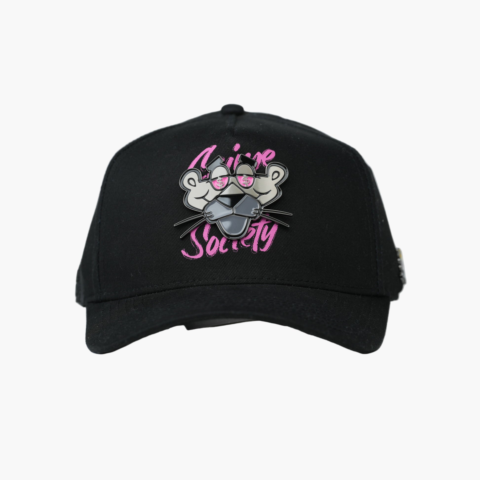 Gorra negra con placa frontal de la Pantera Rosa en gris, destacando sus ojos en rosa vibrante. Diseño cautivador que captura la esencia del personaje legendario. Accesorio ideal para quienes aman los clásicos animados con estilo contemporáneo. Prenda versátil que añade personalidad a cualquier atuendo casual.