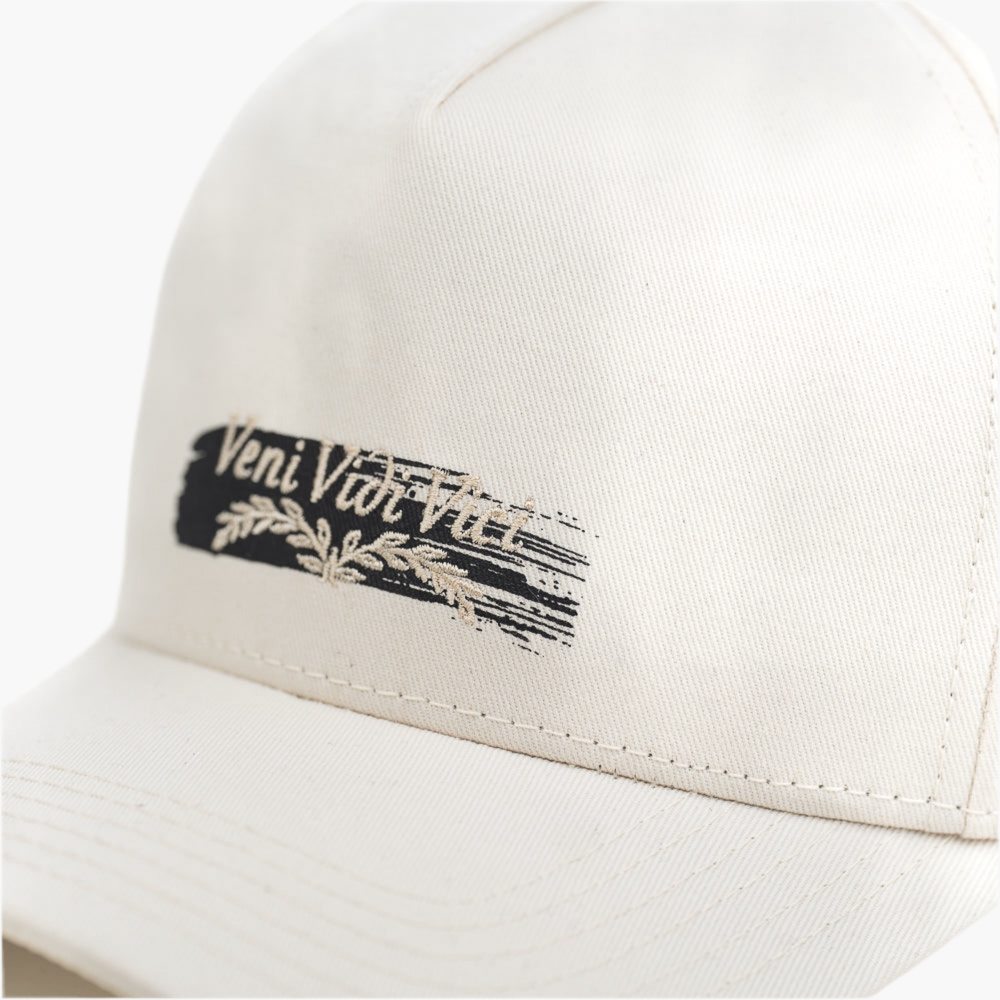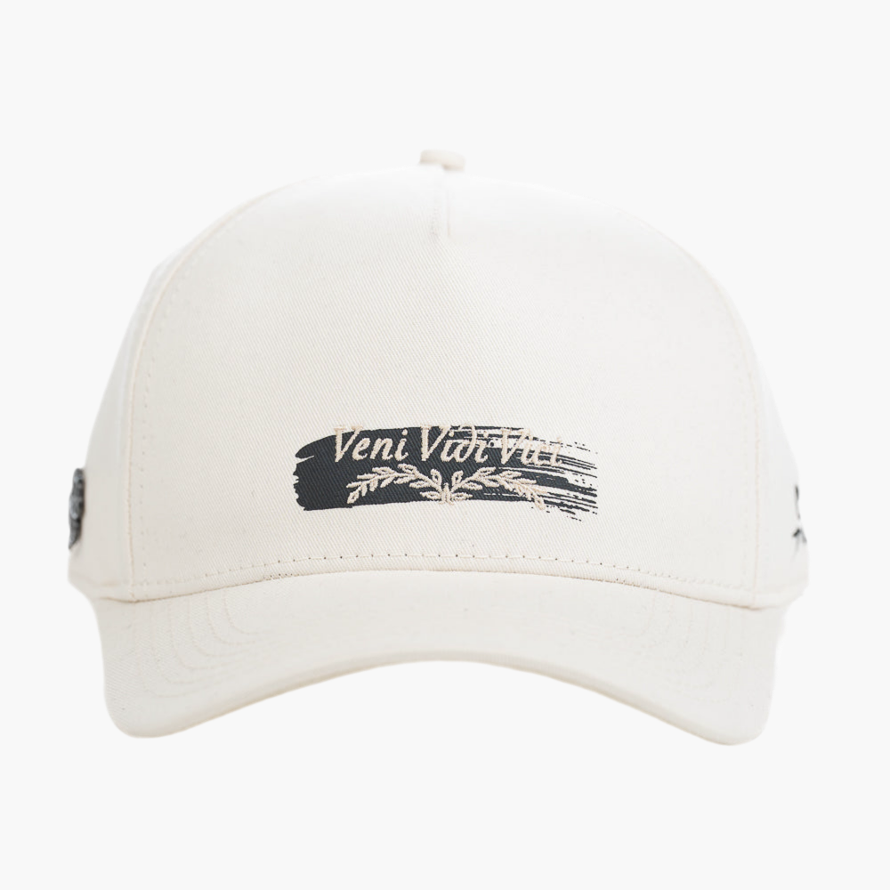 Esta gorra blanca presenta un diseño minimalista con un logo pintado en negro en la parte inferior que dice "Veni Vidi Vici". Su estilo sencillo pero poderoso transmite confianza y determinación, convirtiéndola en un accesorio elegante y motivador para cualquier look casual.