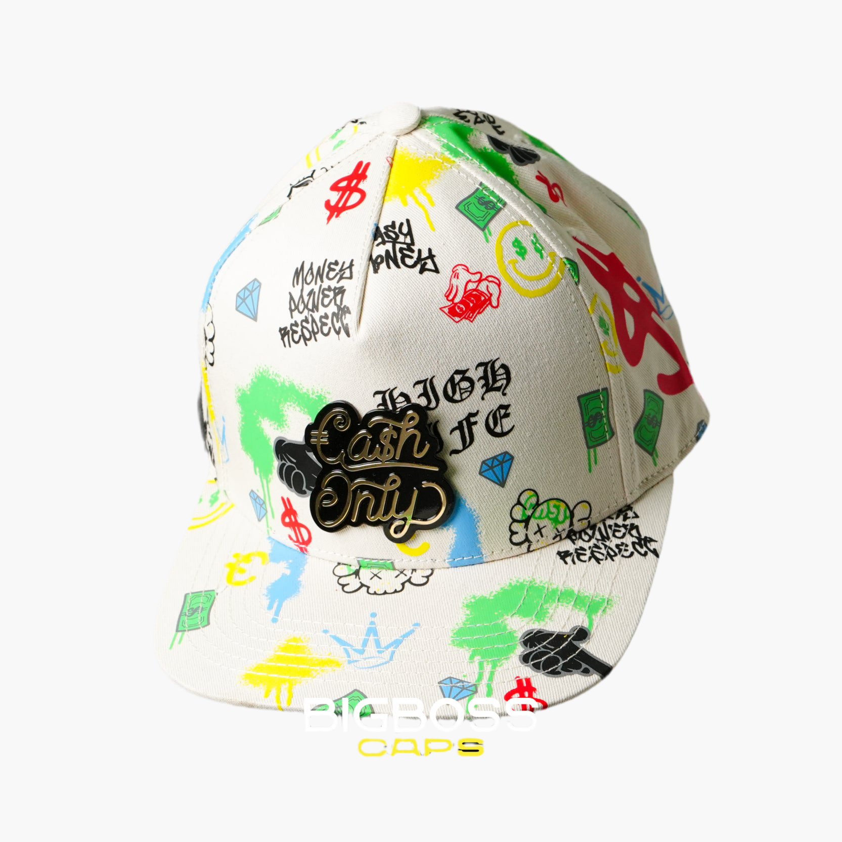 Esta gorra blanca destaca por su diseño vibrante en grafito de colores, que aporta un toque moderno y llamativo. En la parte frontal, luce una placa dorada con la frase "Cash Only", que resalta con elegancia y le da un carácter exclusivo y único a la prenda.