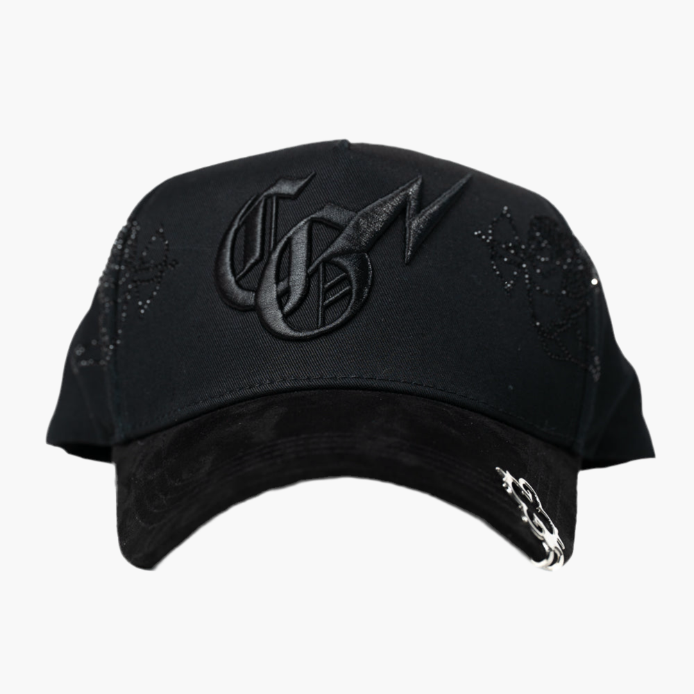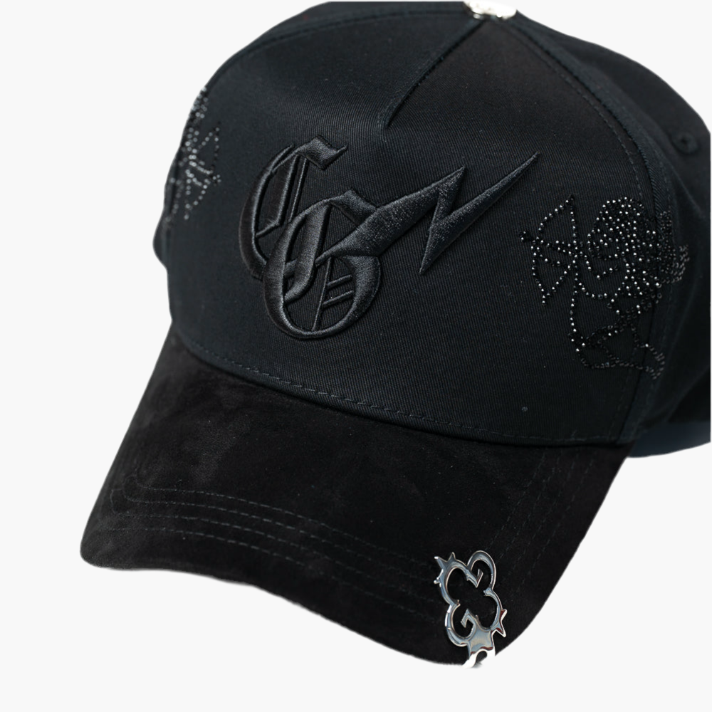 Gorra negra “ANGELS CRYSTAL” con un logo bordado en negro al frente, elegante y sobrio. A cada lado, dos ángeles están representados con piedras negras brillantes, aportando un toque sofisticado y llamativo. Este diseño combina discreción y brillo para un estilo único y moderno.