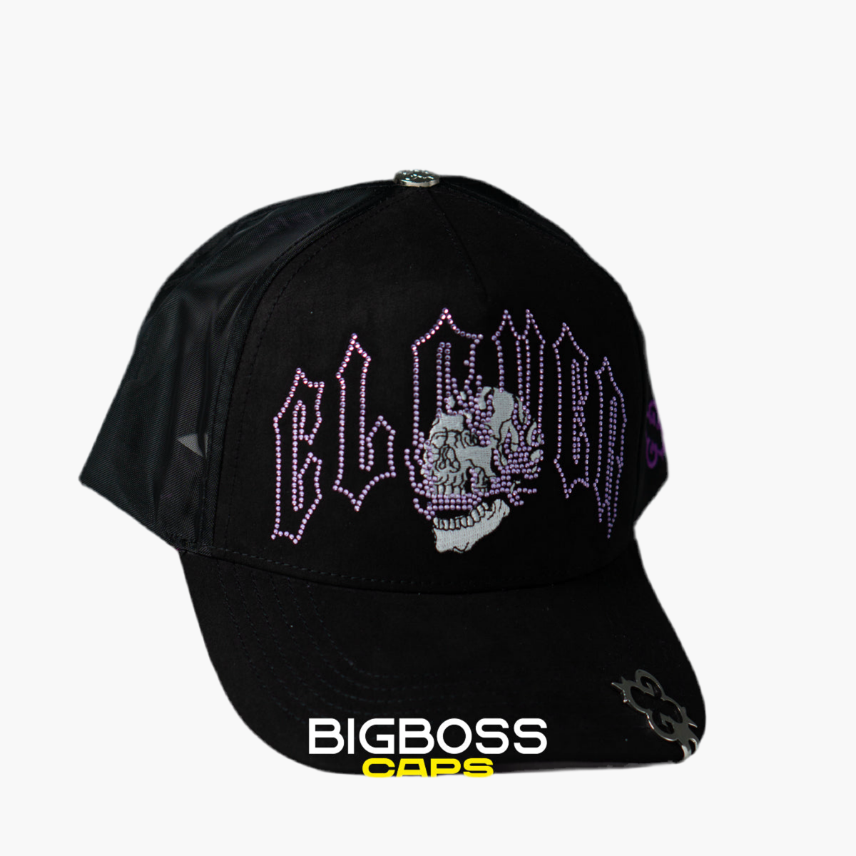 La gorra de malla CALAVERA PEDRERÍA en color negro presenta la palabra CLOVER adornada con piedras moradas en la parte frontal, aportando brillo y sofisticación. A un lado, destaca una calavera blanca bordada que añade un toque atrevido y único, combinando estilo y detalle en un diseño llamativo.