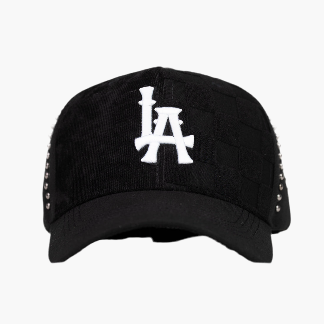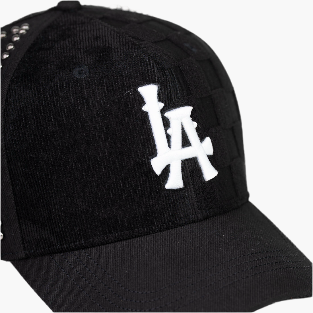 La gorra 50/50 de pana negra destaca por su textura suave y moderna. En el centro lleva bordado el logo "LA" en blanco, creando un contraste elegante. Este diseño exclusivo forma parte del drop de Dandy Hats, ideal para quienes buscan un accesorio distintivo y con estilo contemporáneo.