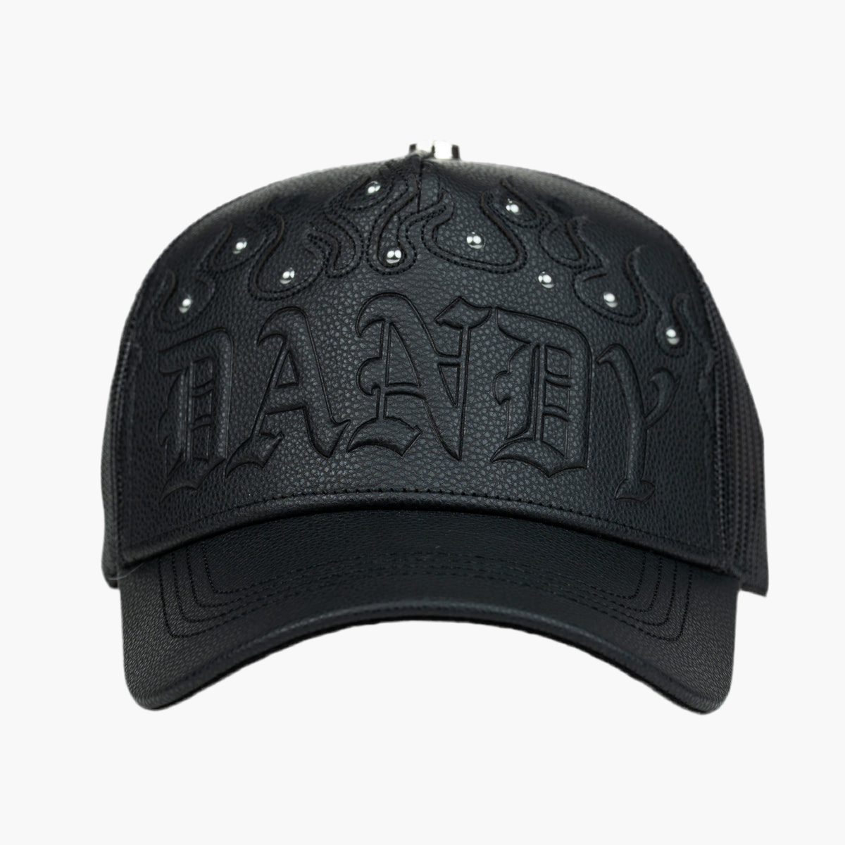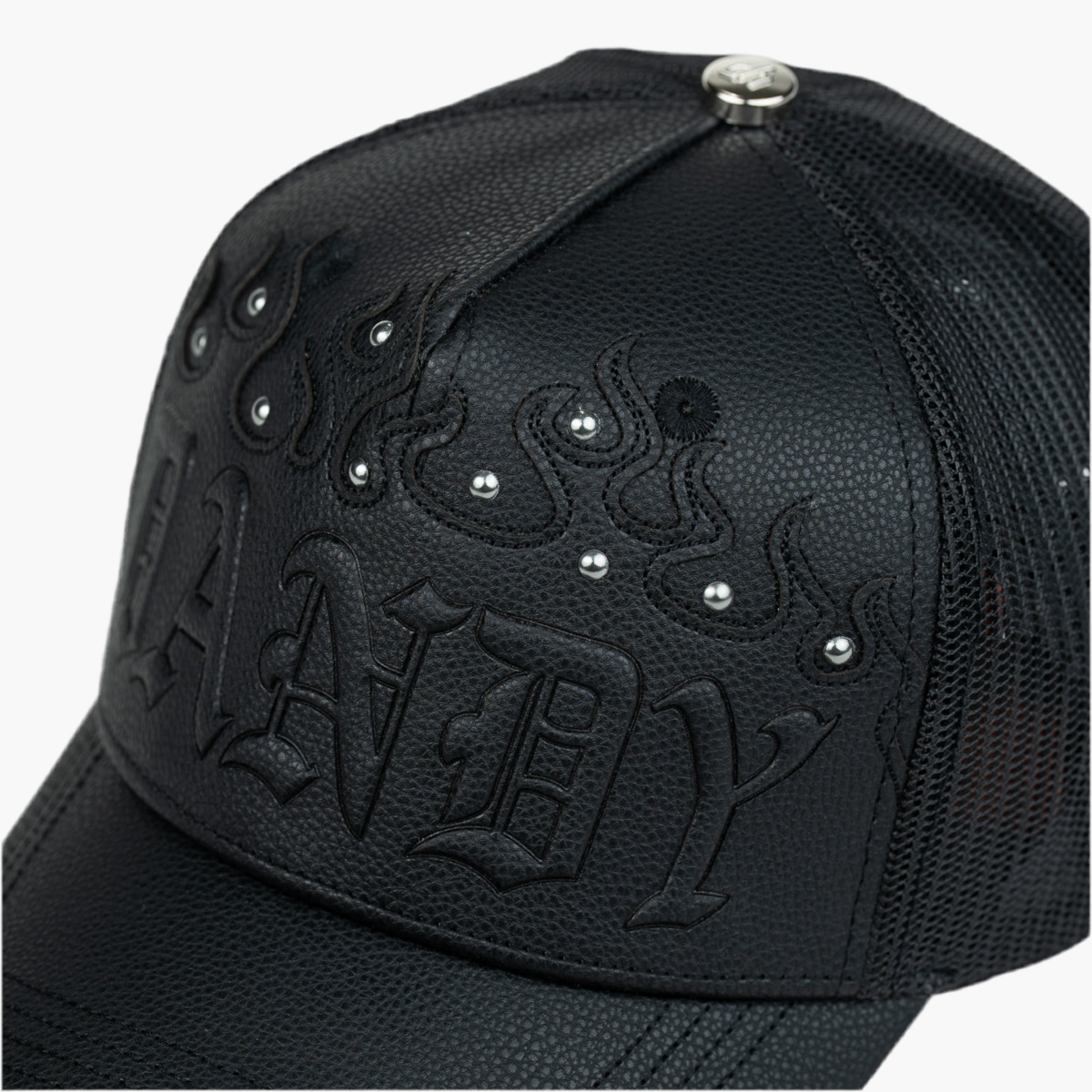Esta gorra negra de malla destaca por su frente en cuero con la palabra "DANDY" y piedras brillantes sobre el texto, agregando un toque elegante y llamativo. Parte del drop de Dandy Hats, combina estilo sofisticado con comodidad para un look urbano y moderno.