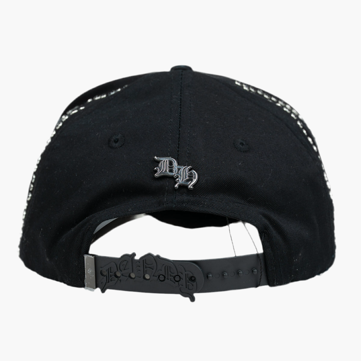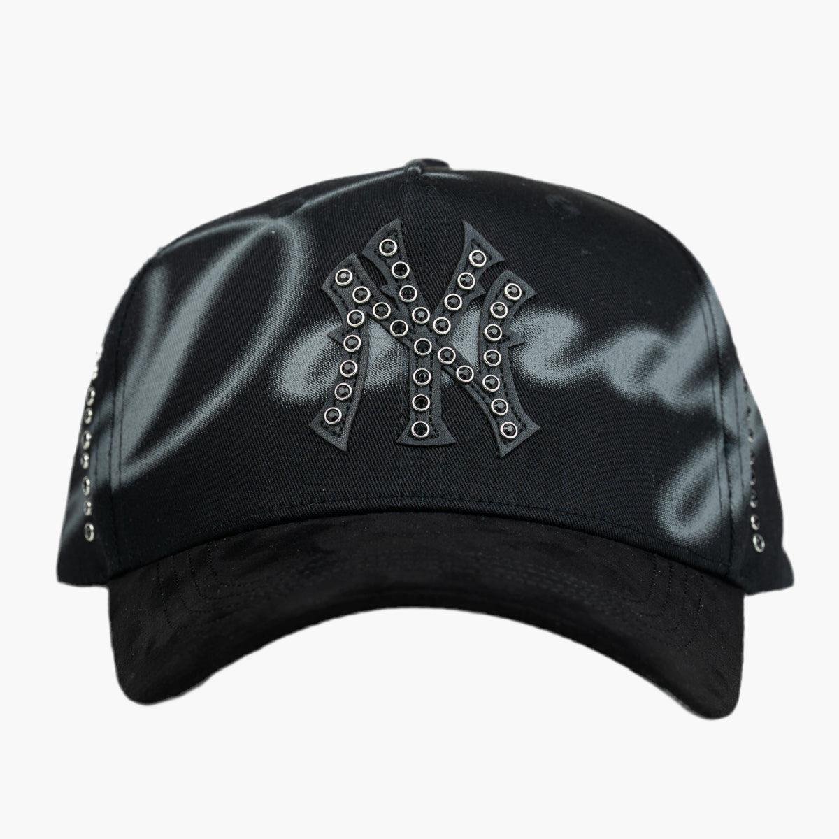 Esta gorra negra presenta el logo de NY en la parte trasera viene acompañado por la palabra "DANDY" en grande y estilo grafiti gris. A ambos lados, derecho e izquierdo, se sitúan piedras brillantes que aportan un toque sofisticado y llamativo, combinando urbanidad y elegancia en un diseño único este es un Drop de dandy hats