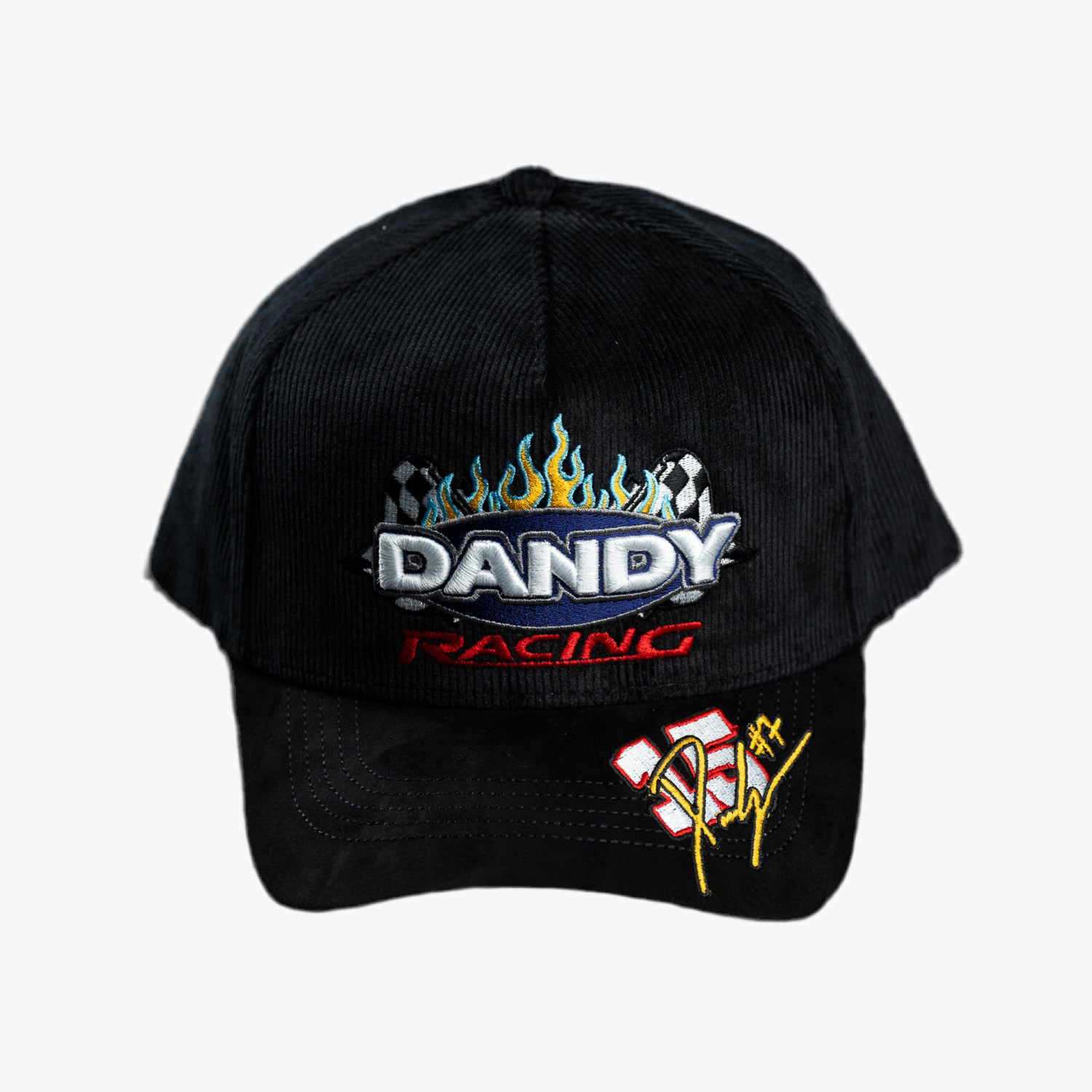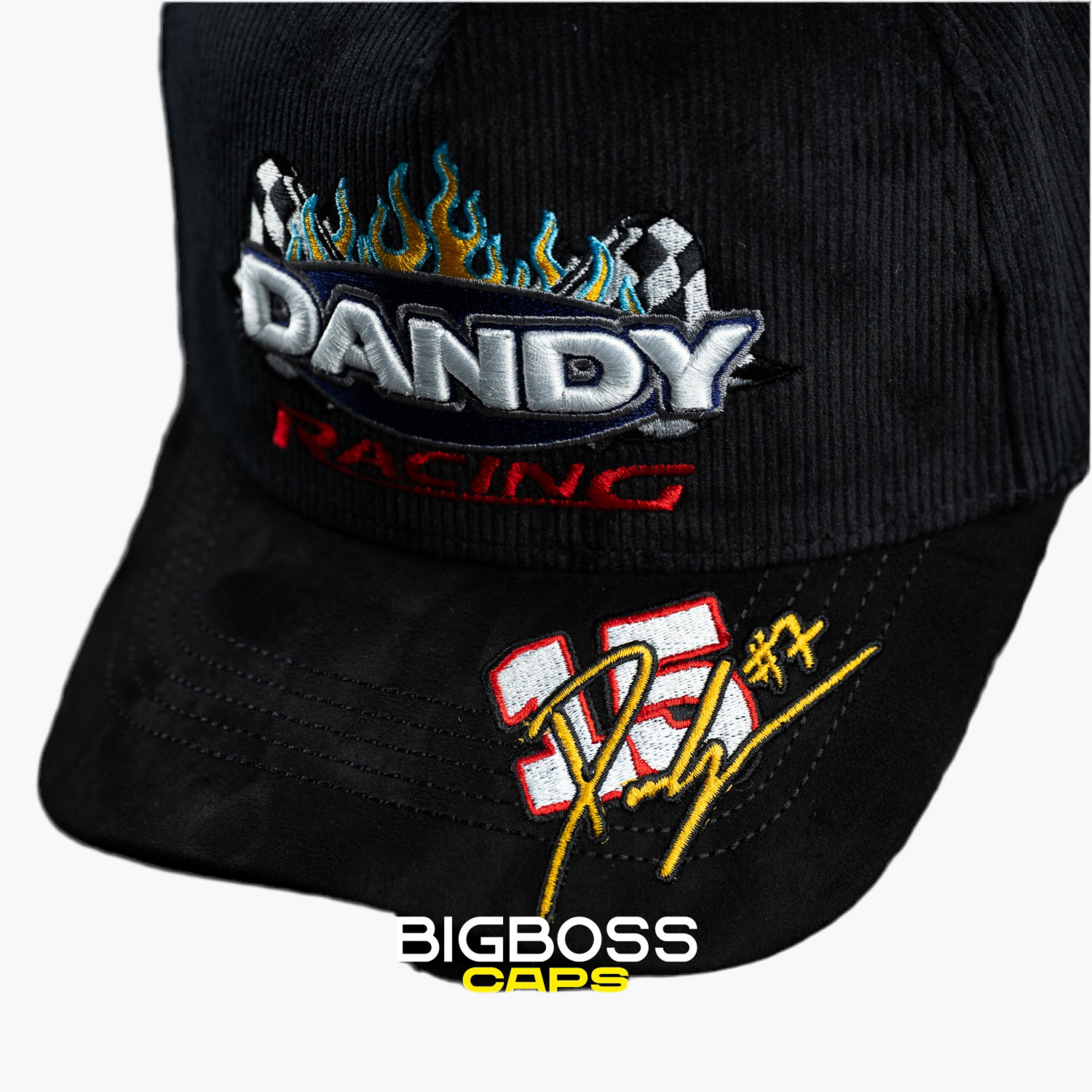 Esta gorra negra presenta un frente de pana suave y resistente, con el logo bordado de Dandy Racing en blanco y rojo. Su diseño combina elegancia y deportividad, ideal para quienes buscan un accesorio duradero y con estilo que refleje pasión por las carreras y la moda urbana.