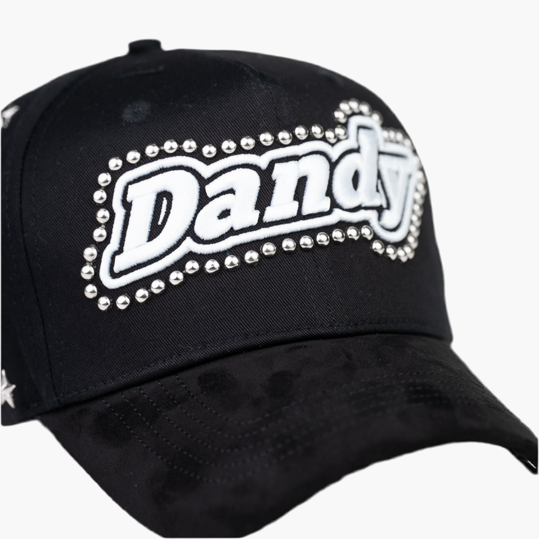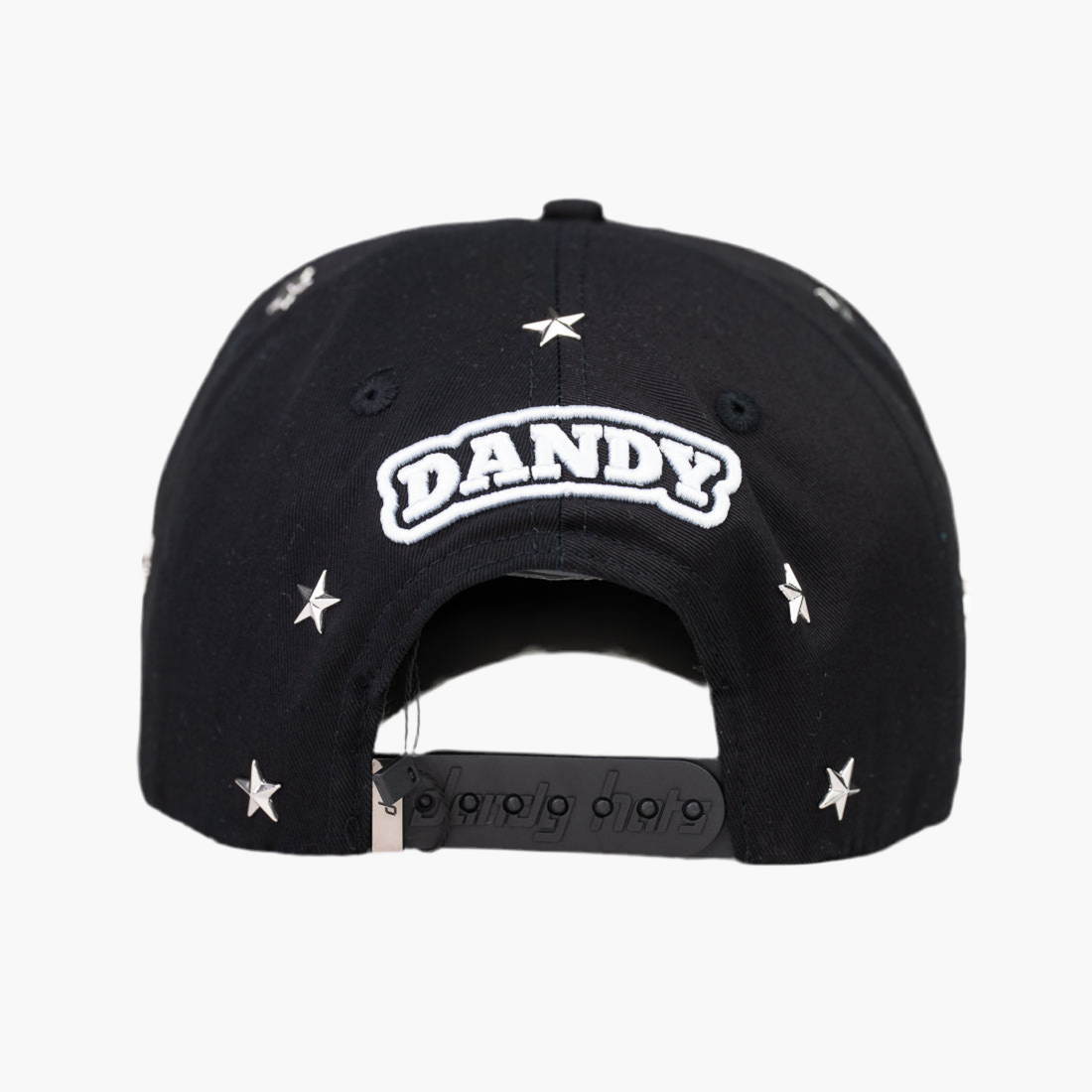 La gorra STARS & STUDS en color negro presenta el texto "dandy" bordado en blanco con un elegante borde de perlas grises. Toda la gorra está decorada con estrellas en tonos grises, creando un diseño sofisticado y llamativo que combina estilo clásico y moderno con un toque distintivo.