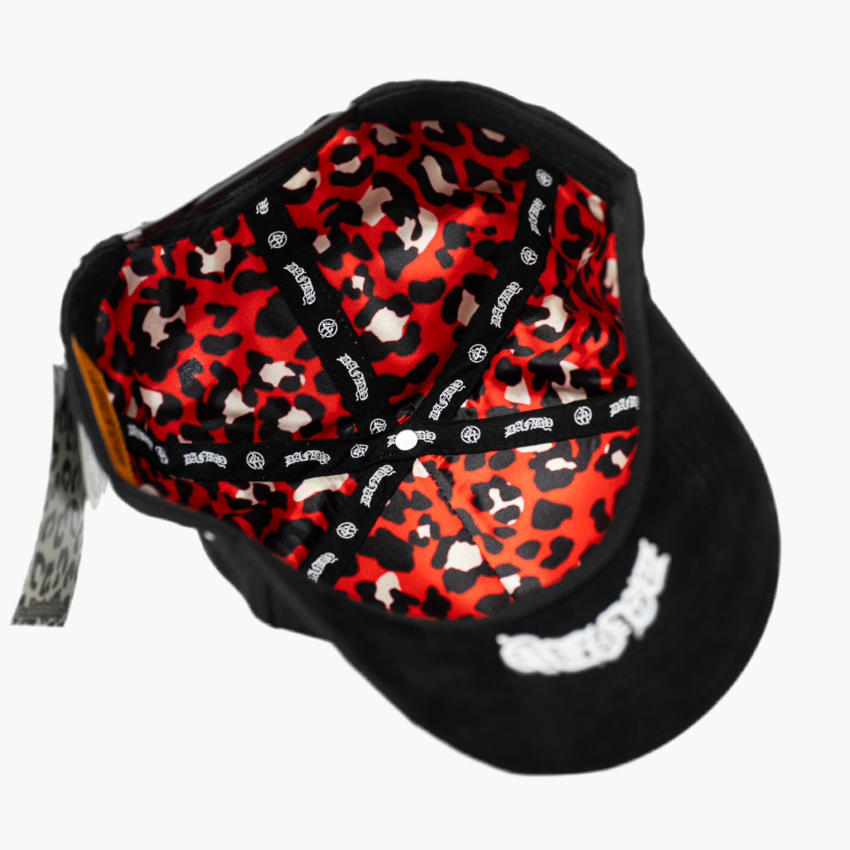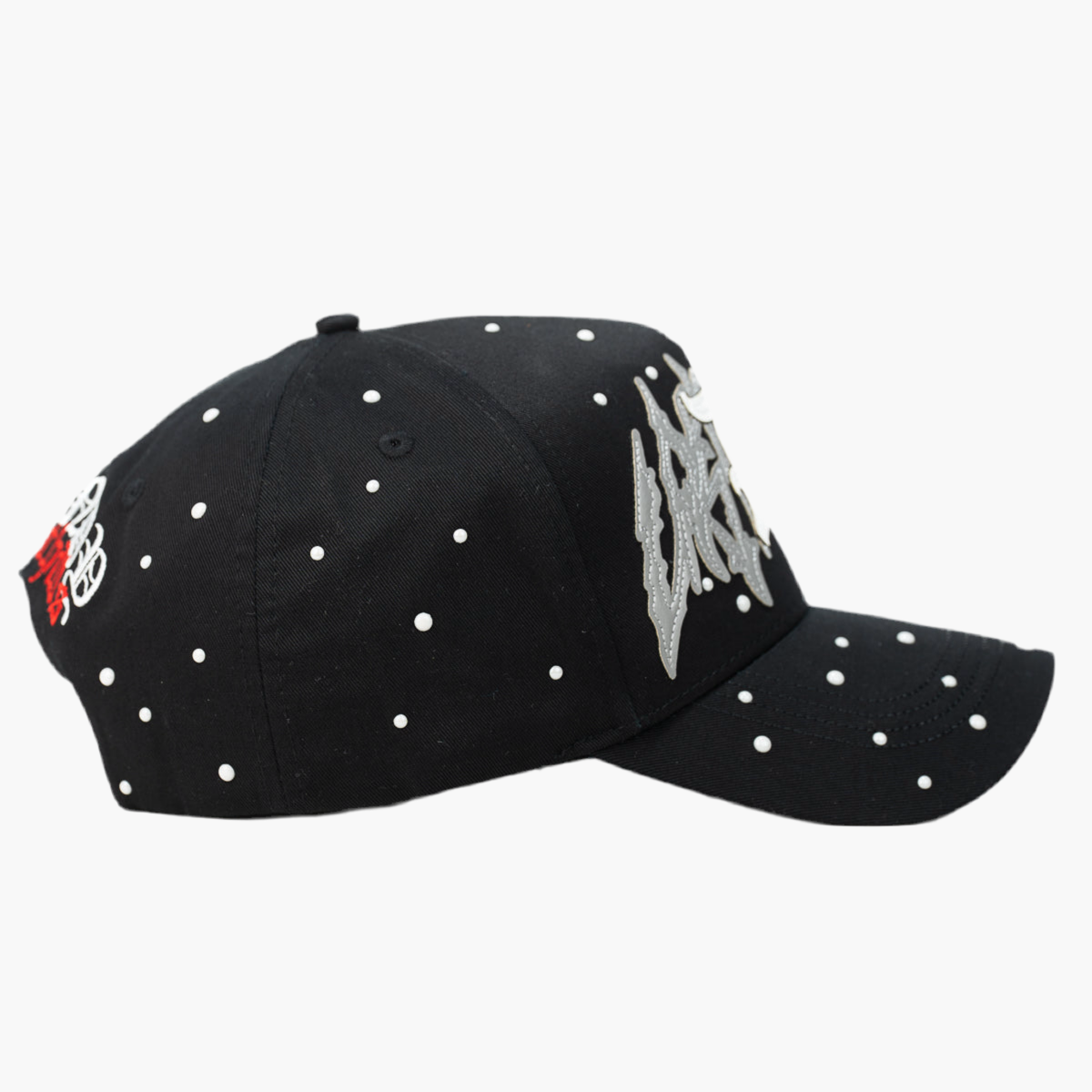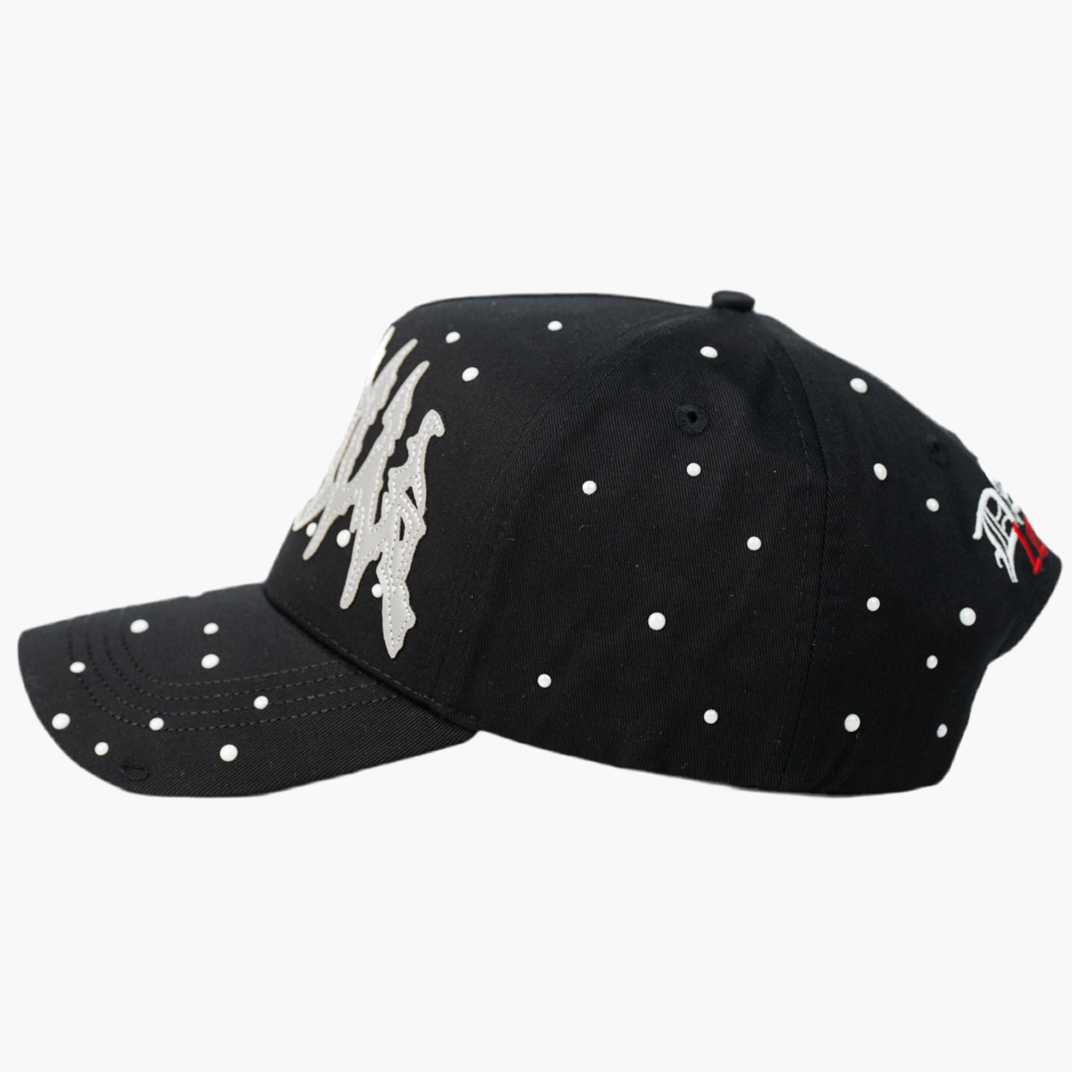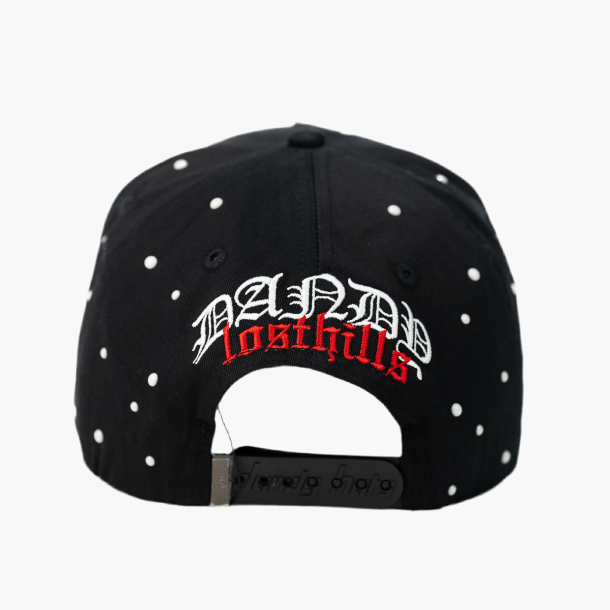 La gorra LOST DANDY en negro presenta parches blancos y grises distribuidos por toda la superficie. Está decorada con piedras cristalinas y brillantes que aportan un toque sofisticado y luminoso. Su diseño combina textura y brillo para un estilo moderno y exclusivo, ideal para destacar con elegancia.
