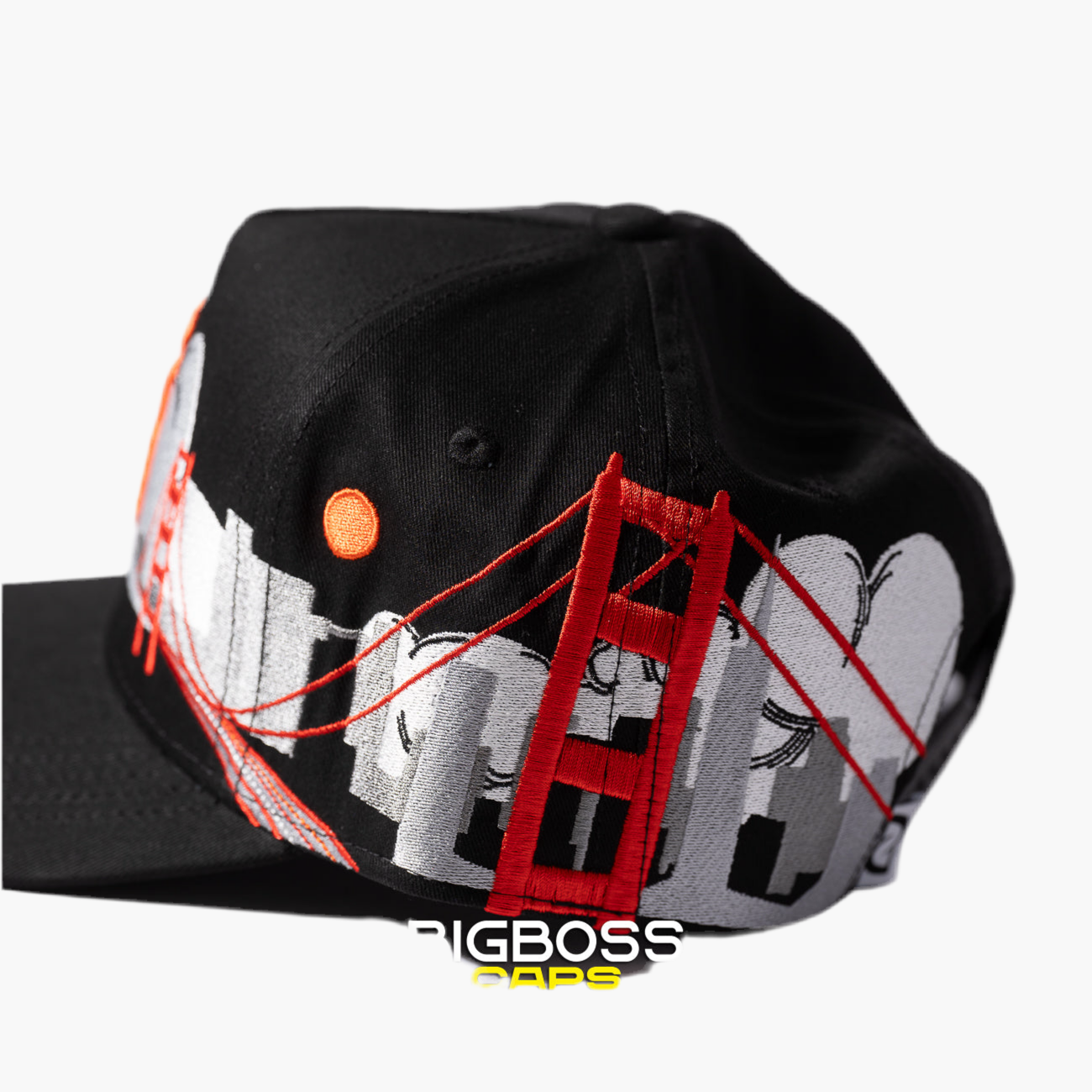 Esta gorra negra presenta el logo SF bordado en color naranja en el frente, dando un toque vibrante y distintivo. En el lado derecho, destaca una ola, mientras que en el izquierdo se aprecia el icónico Puente de San Francisco, creando un diseño único que celebra la esencia de la ciudad.