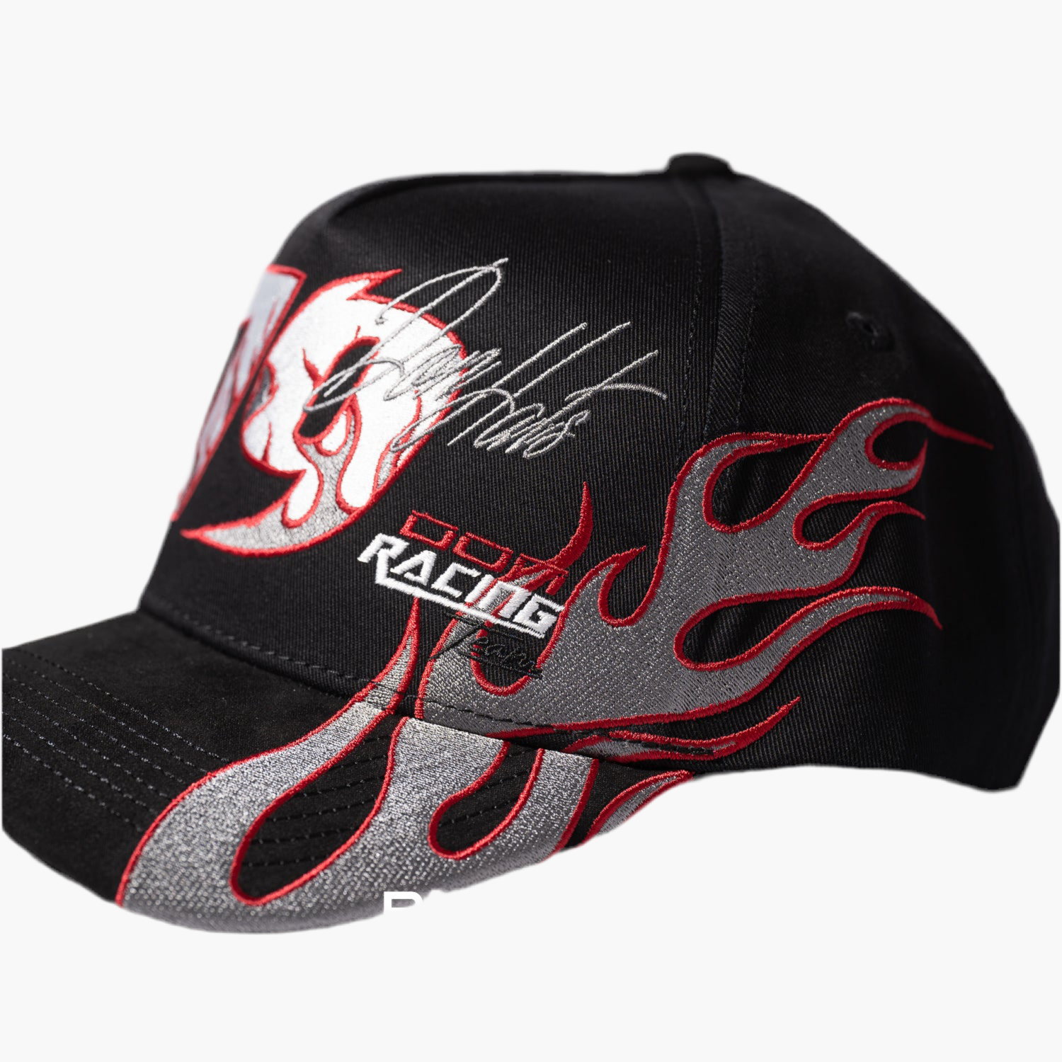 Gorra negra con el número blanco 79 en el centro, que le da un estilo deportivo. En el lado izquierdo, un bordado de fuego gris aporta dinamismo y carácter. El borde rojo complementa el diseño, creando un contraste vibrante y llamativo ideal para los amantes de la velocidad.