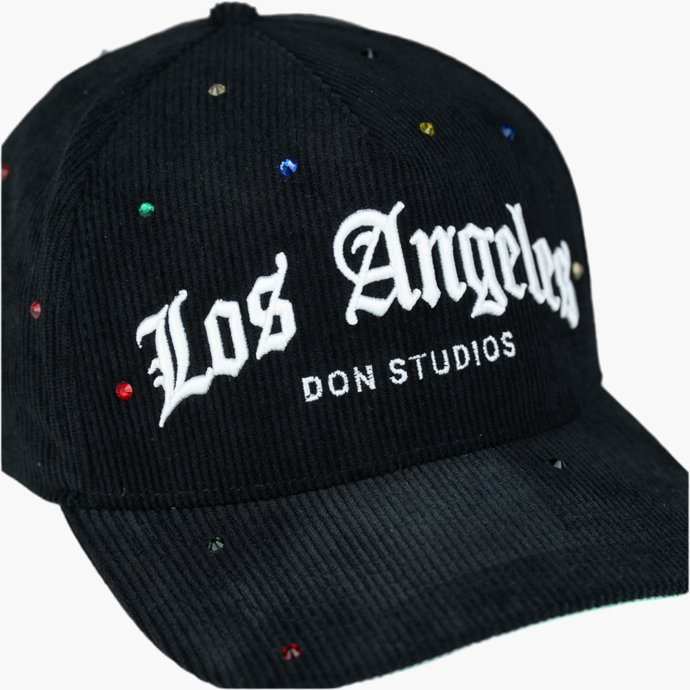 Esta gorra negra "LA GEMS" destaca por el texto "Los Angeles" en blanco al frente, rodeado por piedras brillantes de colores que cubren toda la superficie. Su diseño combina estilo urbano con un toque llamativo y vibrante, ideal para quienes buscan complementar su look con accesorios únicos y llenos de personalidad.
