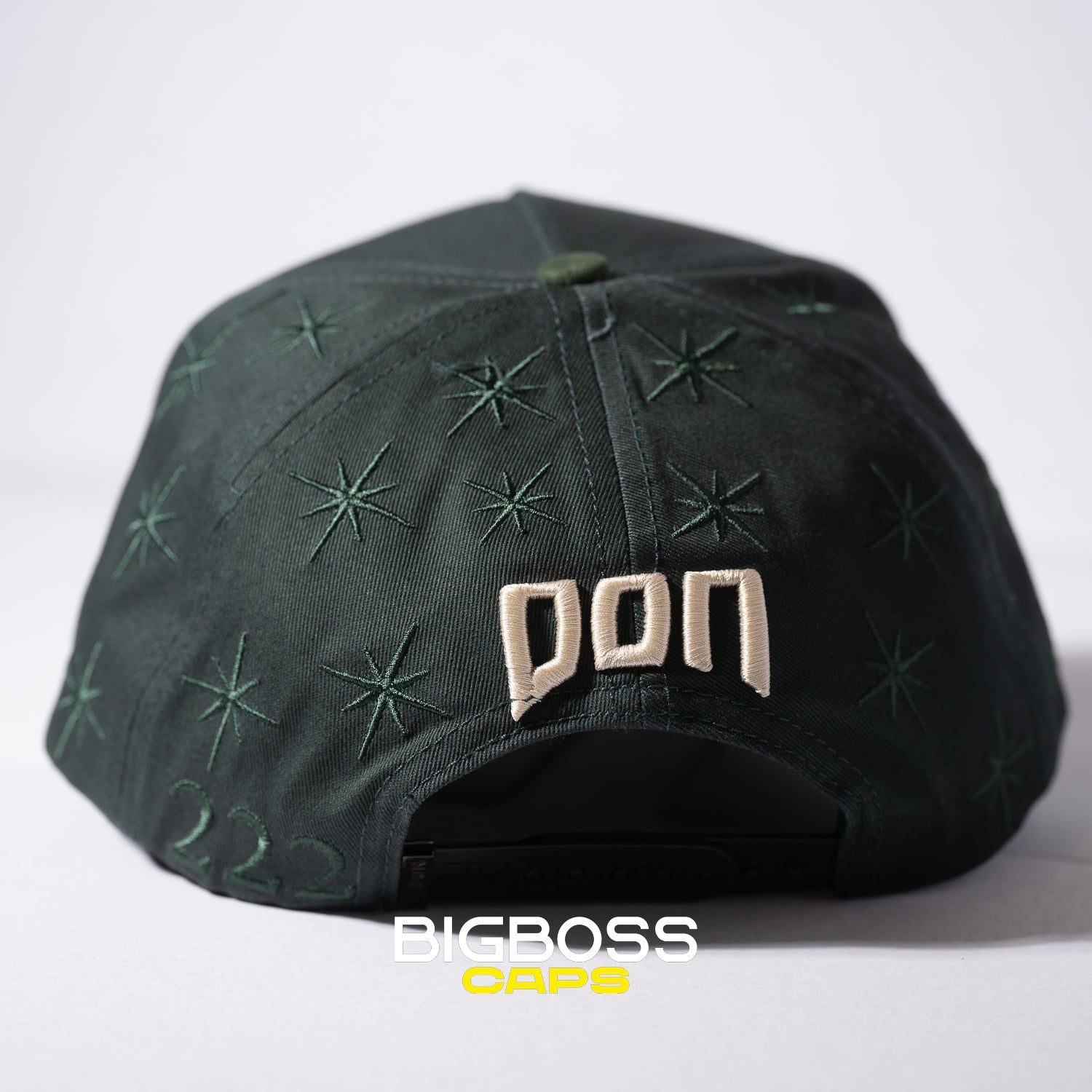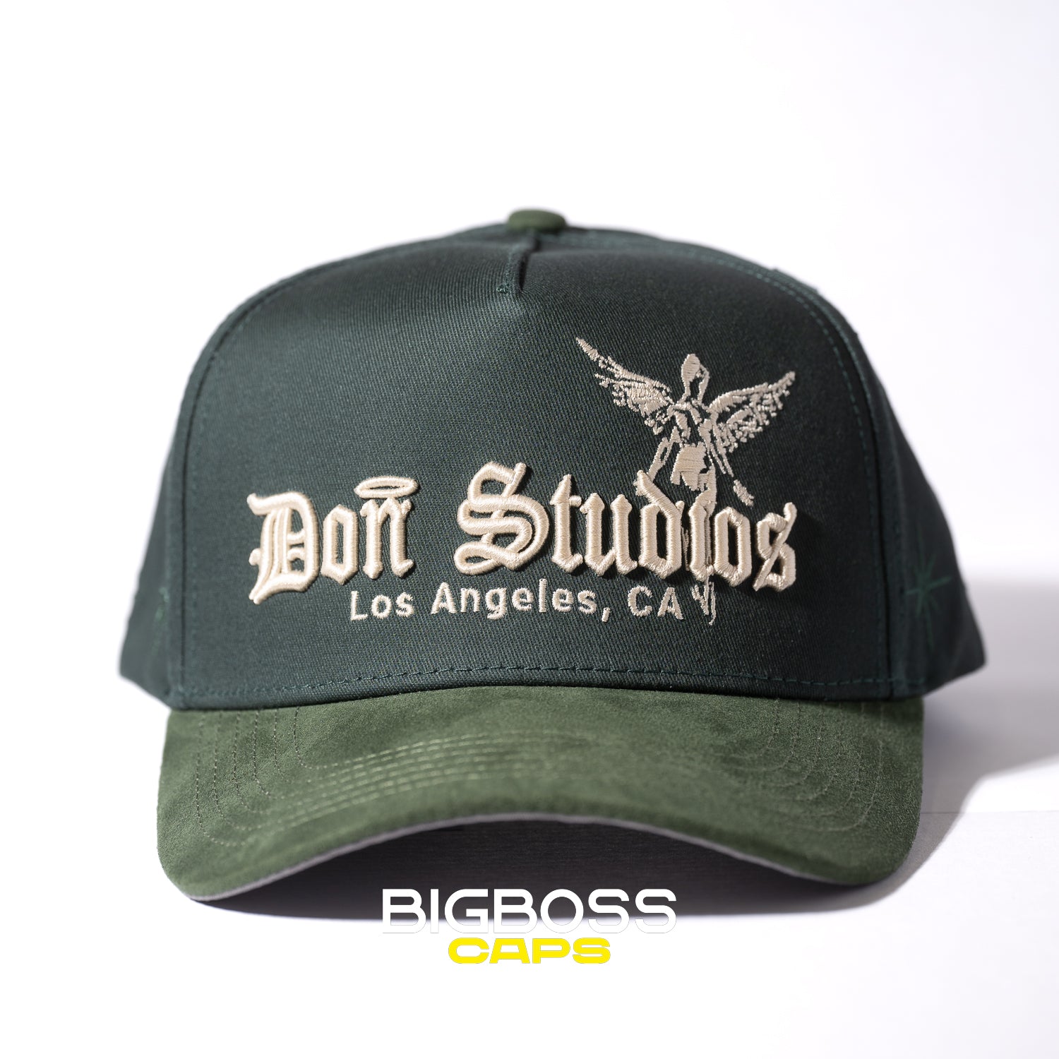 Gorra verde con el texto bordado en blanco "DON STUDIOS" en el centro. Debajo, aparece "Los Angeles CA" también en blanco, mientras que en la parte superior destaca un ángel bordado en el mismo tono. Este diseño combina estilo urbano con detalles sofisticados y llenos de carácter.