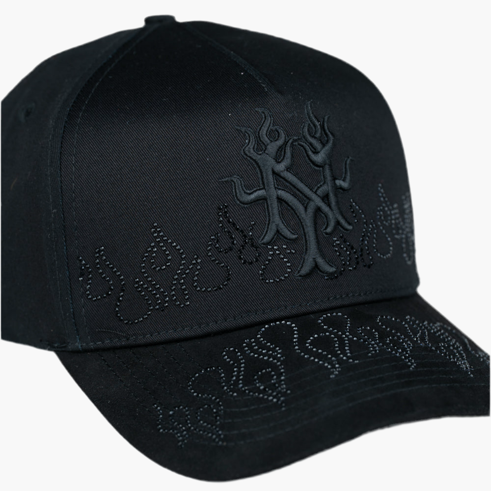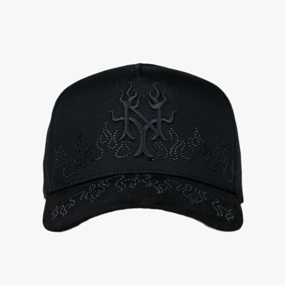Esta gorra negra destaca por el logo "NY" en el frente, acompañado en su parte inferior por llamas decoradas con piedras brillantes negras que aportan un toque sofisticado y llamativo. Su diseño combina elegancia y estilo urbano, ideal para quienes buscan un accesorio único y moderno.