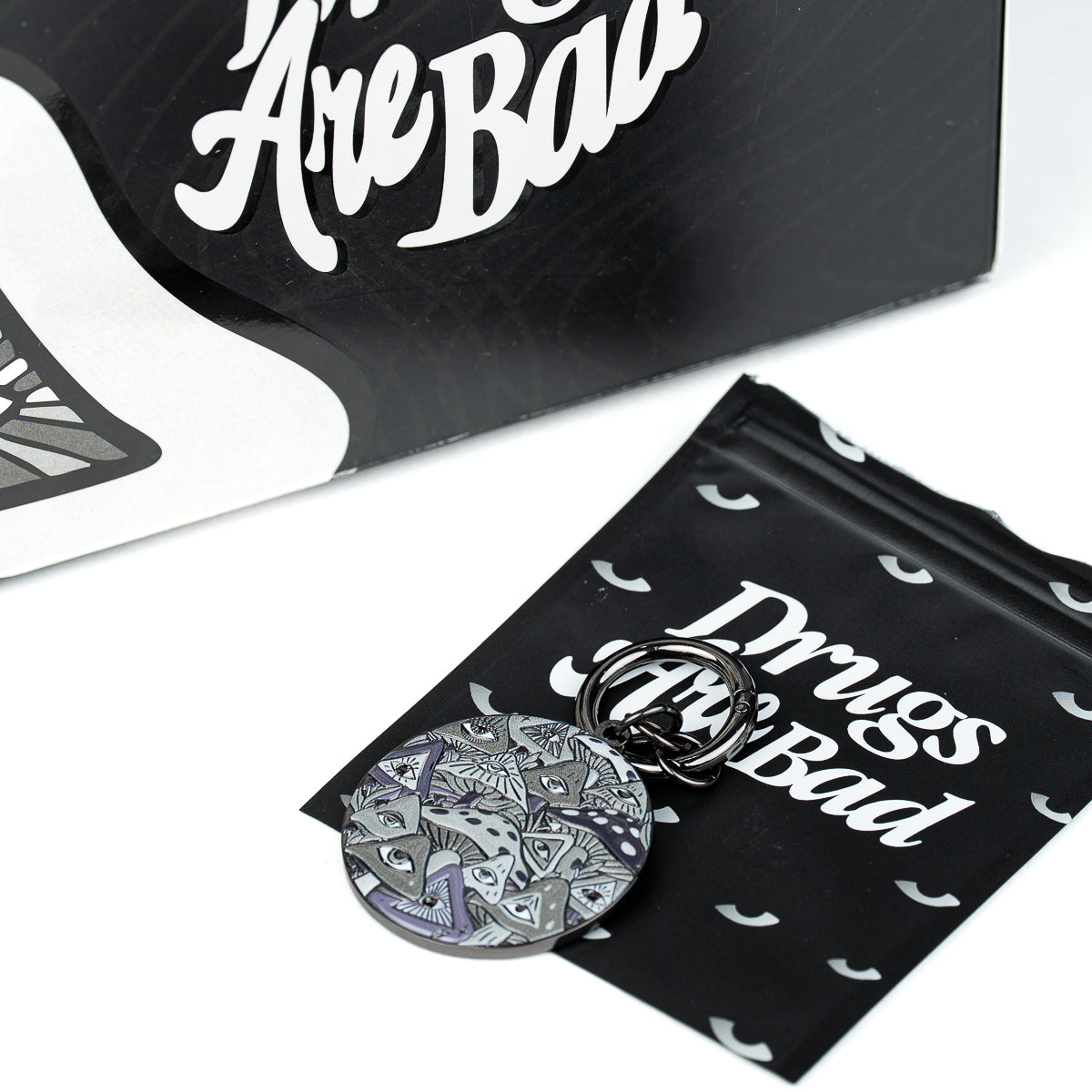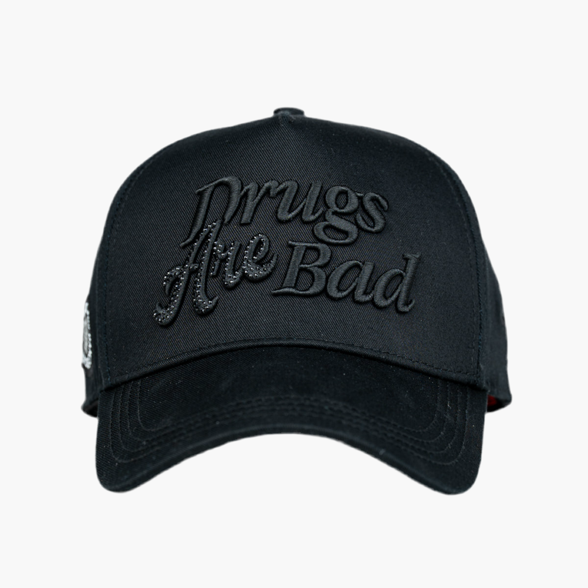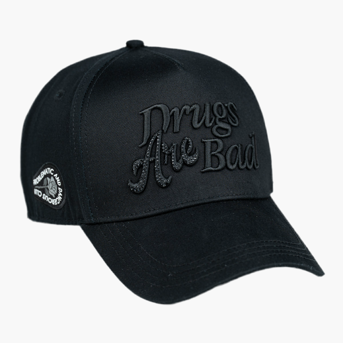 Esta gorra de la marca Problematic and Dangerous Club destaca por su bordado "drugs are bad" y detalles únicos de hongos en la parte trasera. Los toques de pedrería añaden un estilo original y llamativo, ideal para quienes buscan un accesorio con mensaje y diseño distintivo.