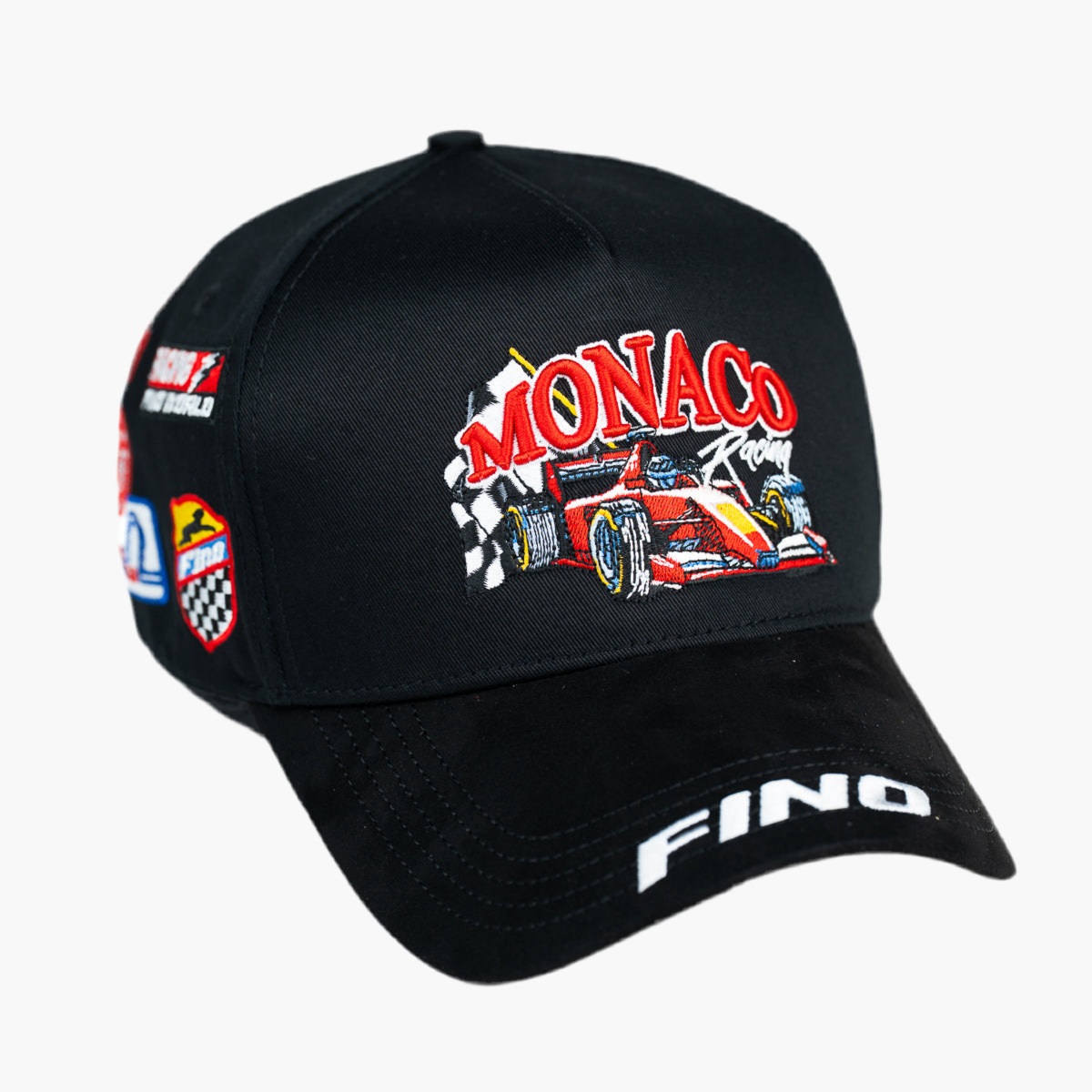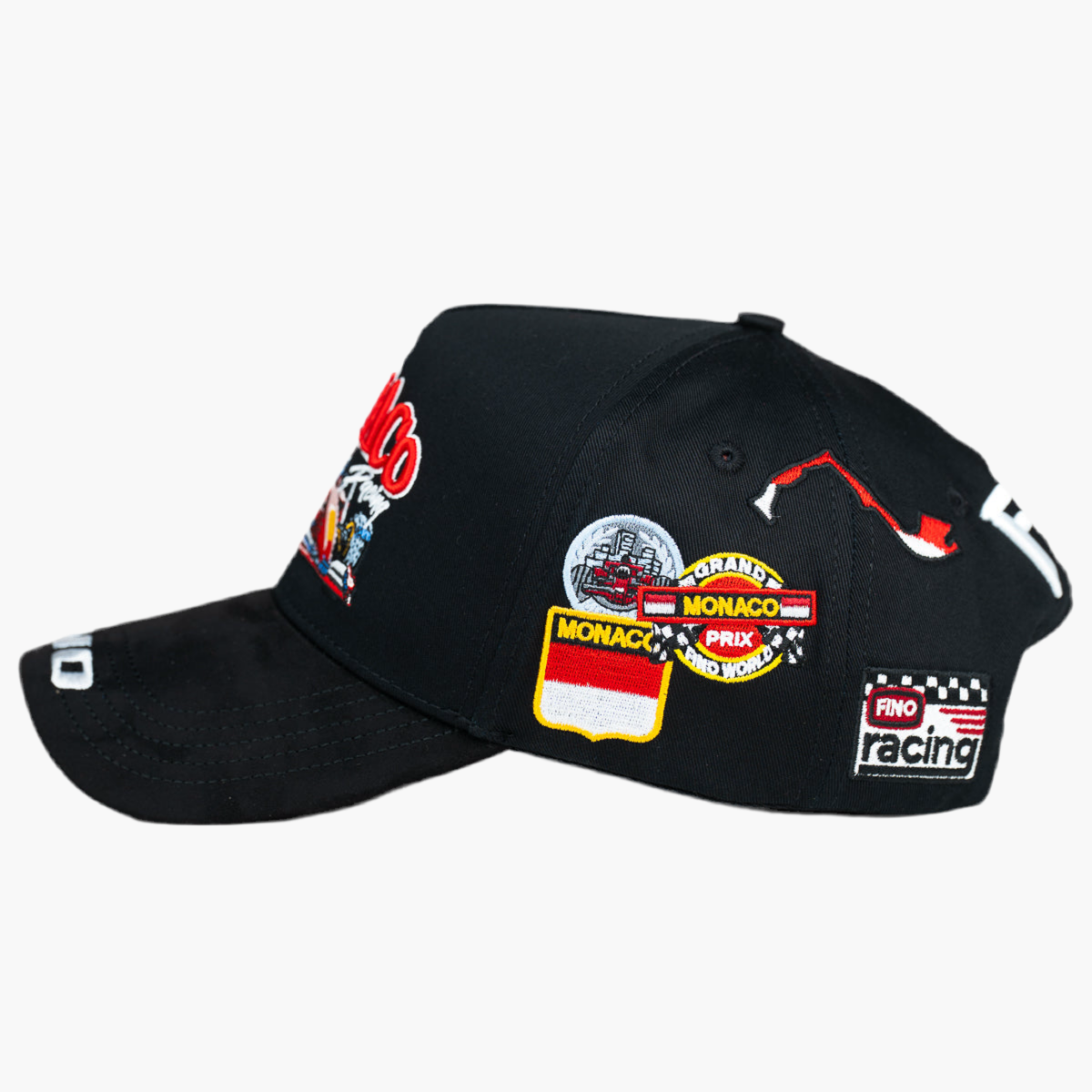 La gorra negra MONACO presenta la palabra "Monaco" bordada en rojo al frente, acompañada por un elegante bordado de un coche de F1. En ambos lados cuenta con stickers bordados que realzan su diseño deportivo, ofreciendo un estilo dinámico y exclusivo para los amantes de la velocidad y el motor.