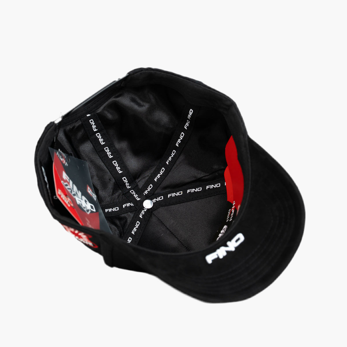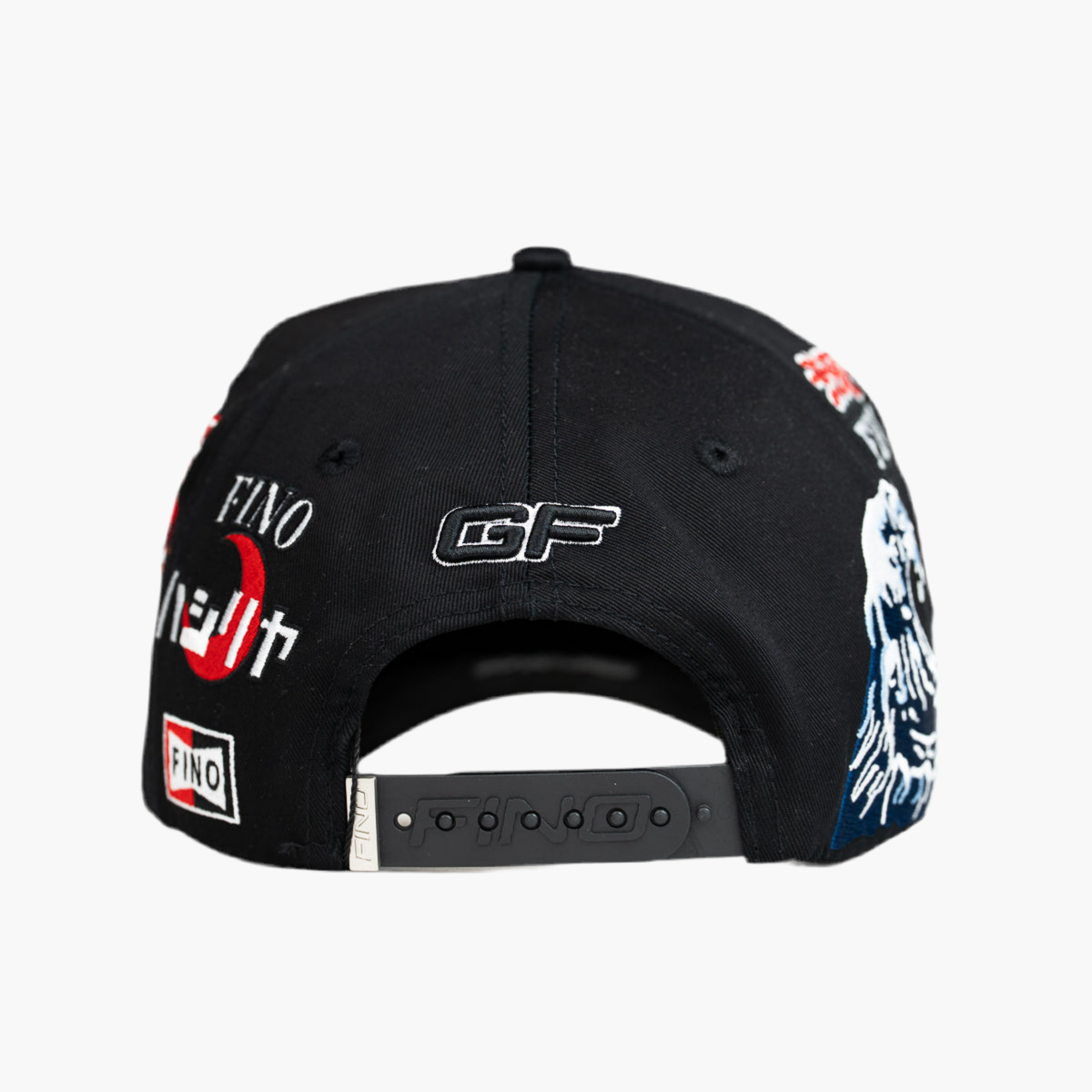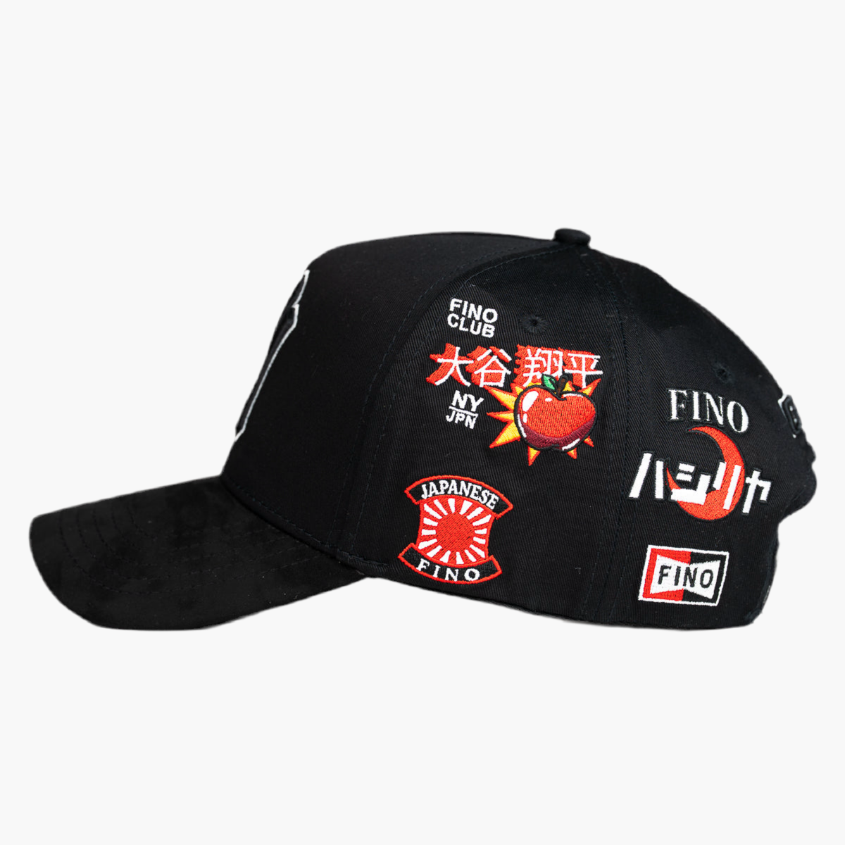 Gorra negra con logo "NY" bordado en negro al frente. En el lado derecho luce un bordado de olas, mientras que el izquierdo presenta parches de un tomate y una luna roja. Este diseño exclusivo del drop FINO X JAPAN combina detalles únicos que resaltan su estilo contemporáneo.