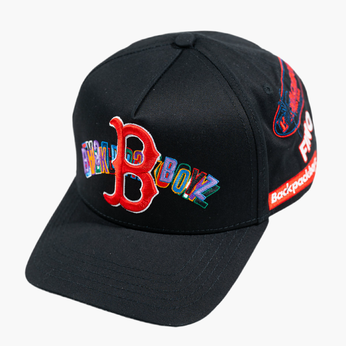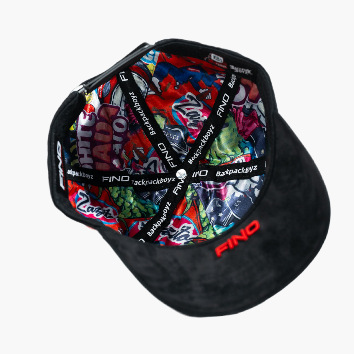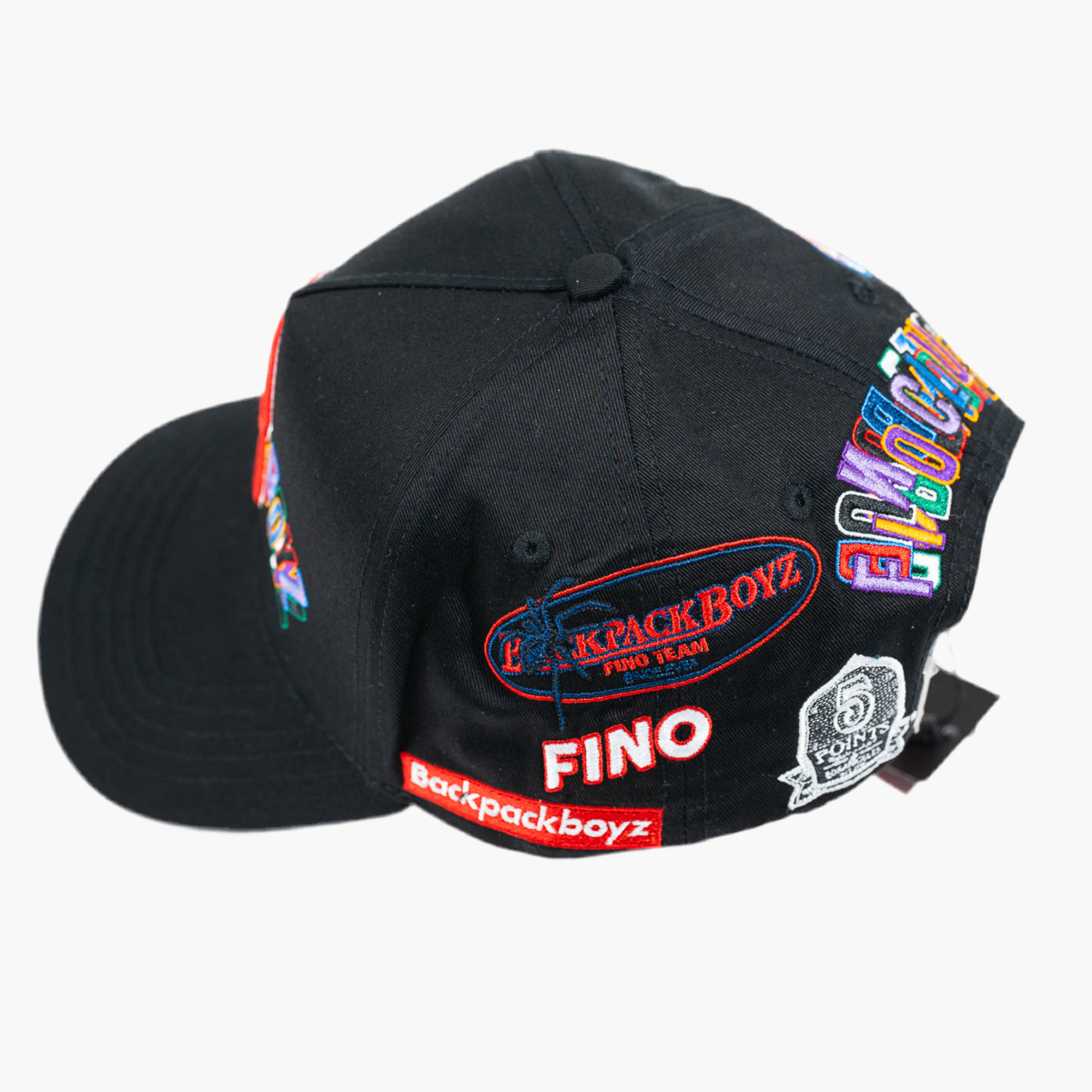 Gorra negra con logo bordado en rojo al frente, que destaca por sus detalles únicos. En la parte trasera presenta varios parches variados, resultado de la colaboración exclusiva entre FINO y BACKPACKBOYZ. Combina estilo urbano y originalidad, ideal para quienes buscan una pieza auténtica y llamativa.