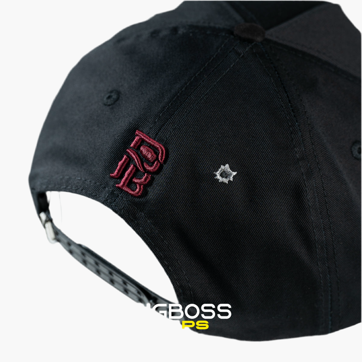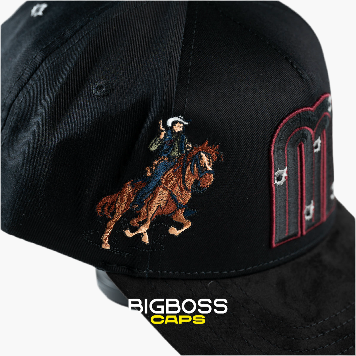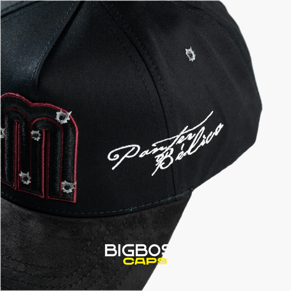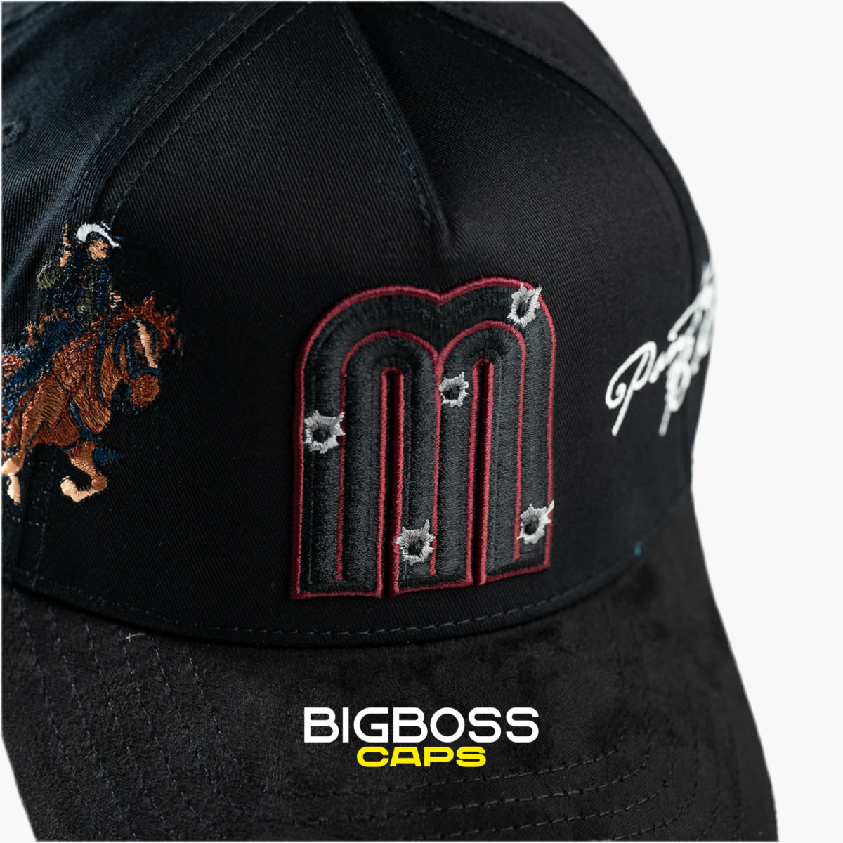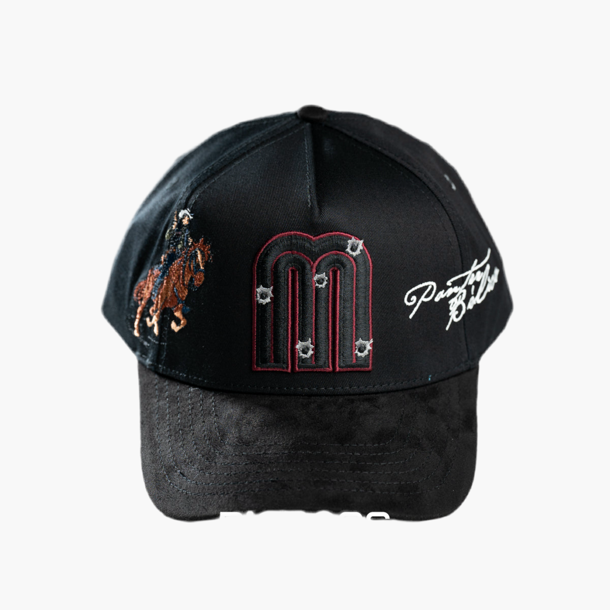 La gorra negra FINO x Panter Bélico lleva en el centro una "M" bordada en negro con borde vino, destacando sutilmente. En el lado derecho, un caballo bordado en tonos cálidos añade un detalle dinámico, reflejando el estilo único de esta colaboración exclusiva y moderna.