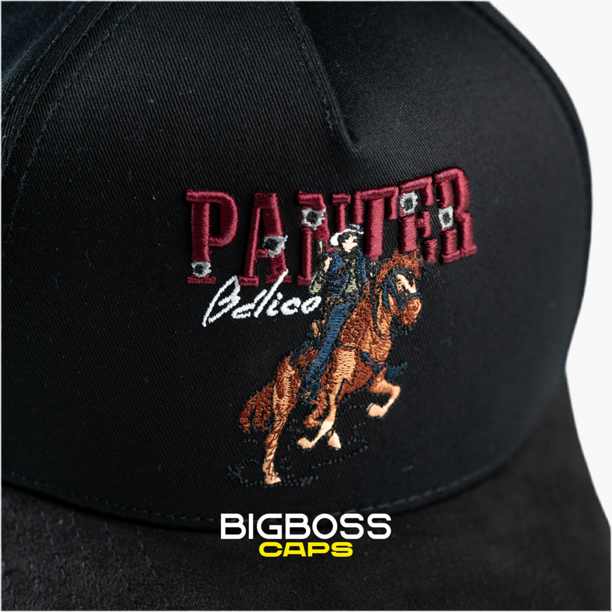 La gorra negra FINO x Panter Bélico presenta en el centro el bordado de la palabra "PANTER" en color vino, destacando con elegancia. Debajo, un caballo café bordado aporta un toque dinámico y distintivo, combinando estilo urbano con un diseño colaborativo único y llamativo.