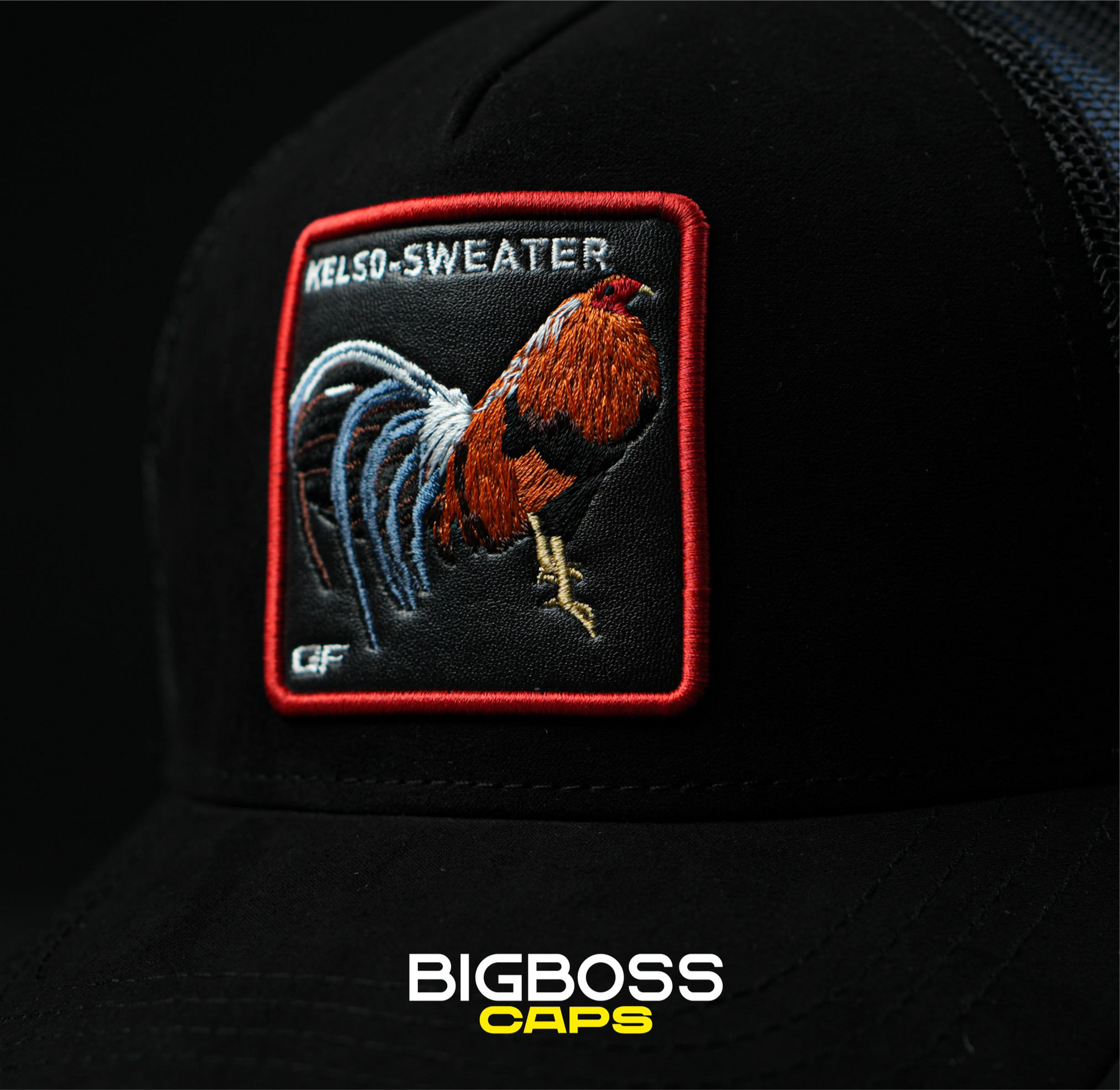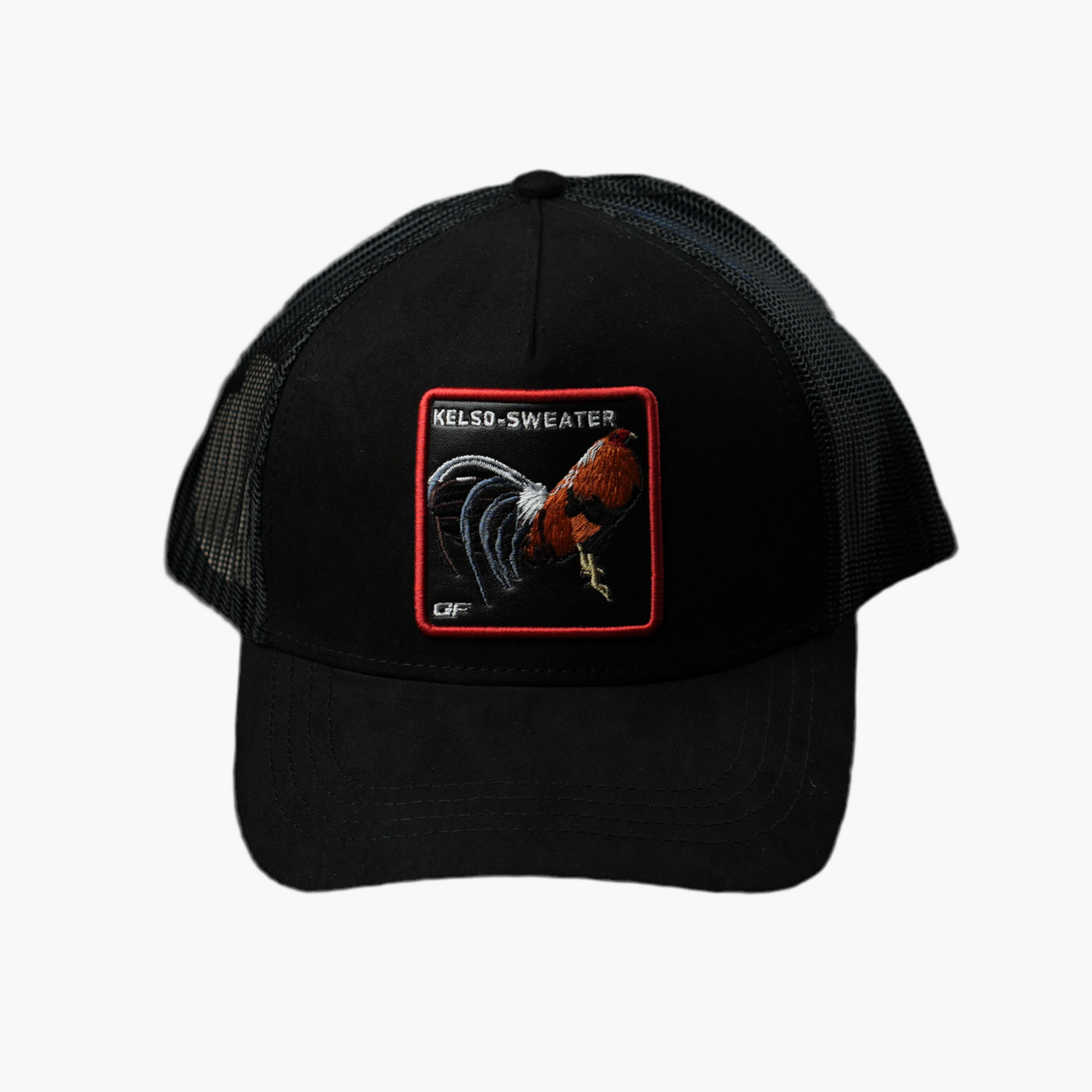 Gorra de malla negra con bordado frontal de un gallo en rojo vibrante. Su diseño combina estilo y frescura gracias a la malla que proporciona ventilación, mientras que el detallado bordado añade un toque audaz y distintivo, perfecta para complementar cualquier look casual con personalidad.