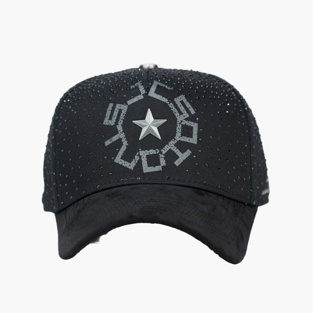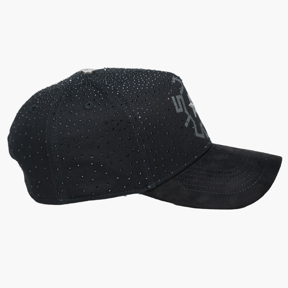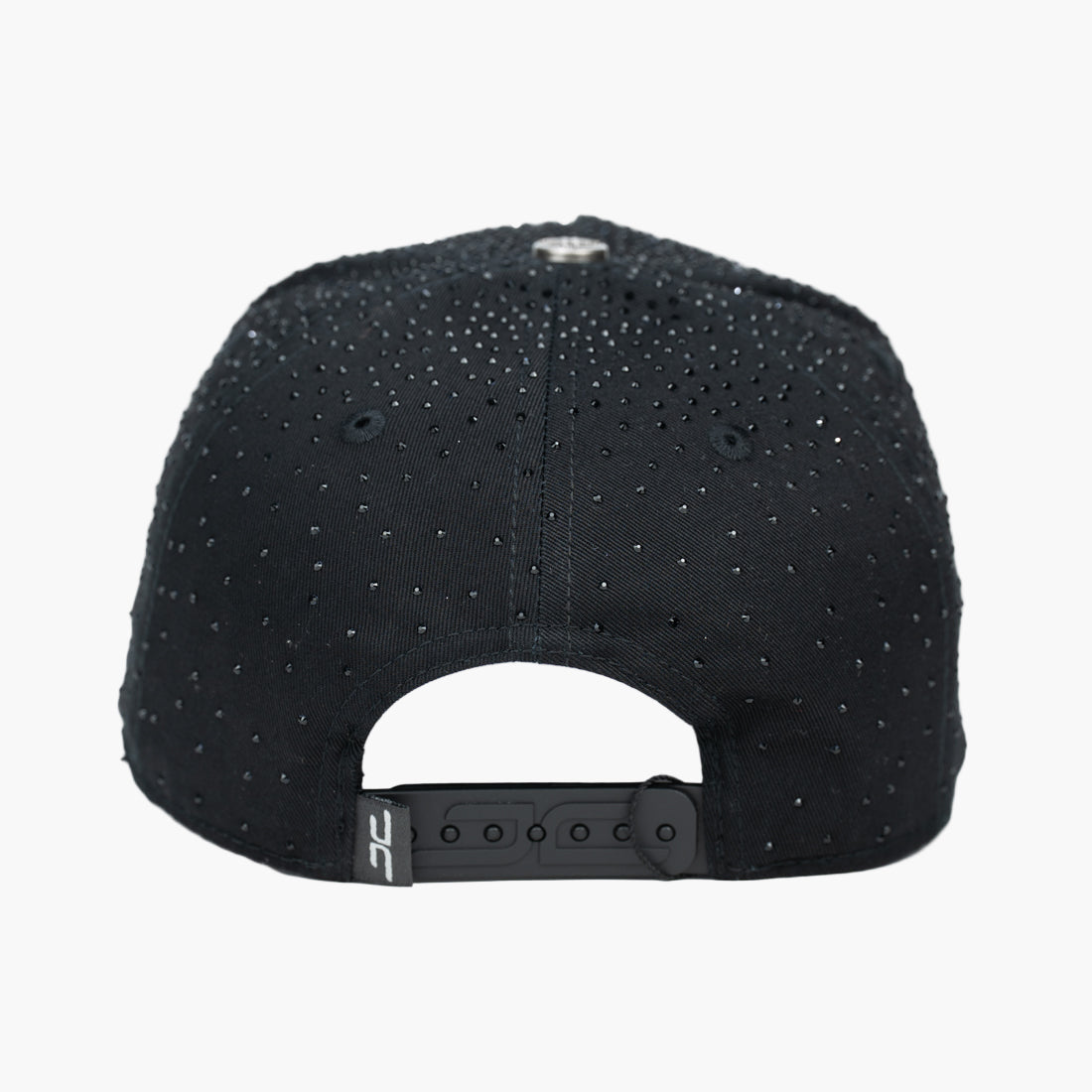 Gorra JC negra con detalles de pedrería que añaden brillo y elegancia. Diseño versátil perfecto para cualquier ocasión, combinando estilo urbano con un toque sofisticado y premium.