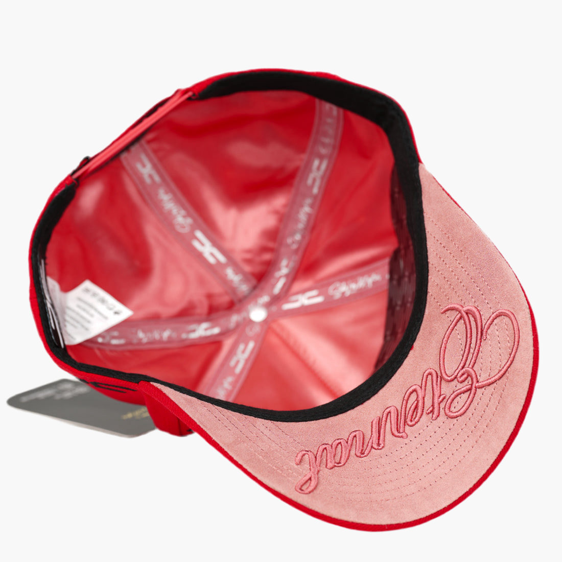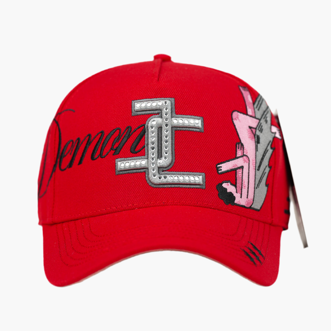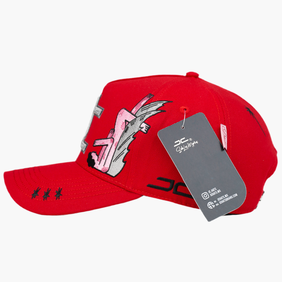 Gorra roja con bordado "JC" en gris al frente, decorada con piedras brillantes en el lado derecho. En ese mismo costado aparece la palabra "demon" en negro, mientras que en el lado izquierdo destaca un ángel volteado en rojo. Un diseño audaz que combina fuerza y estilo distintivo.
