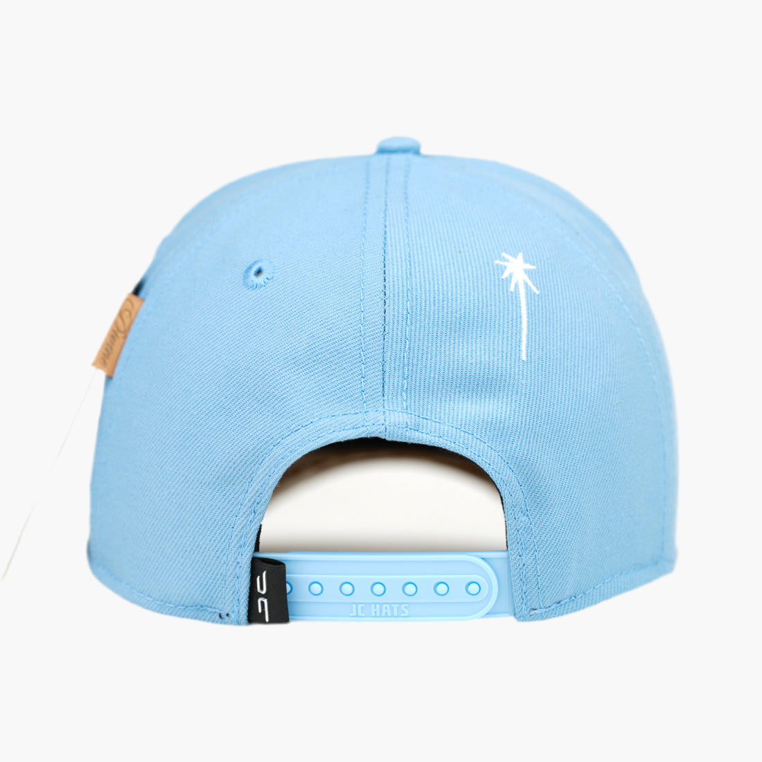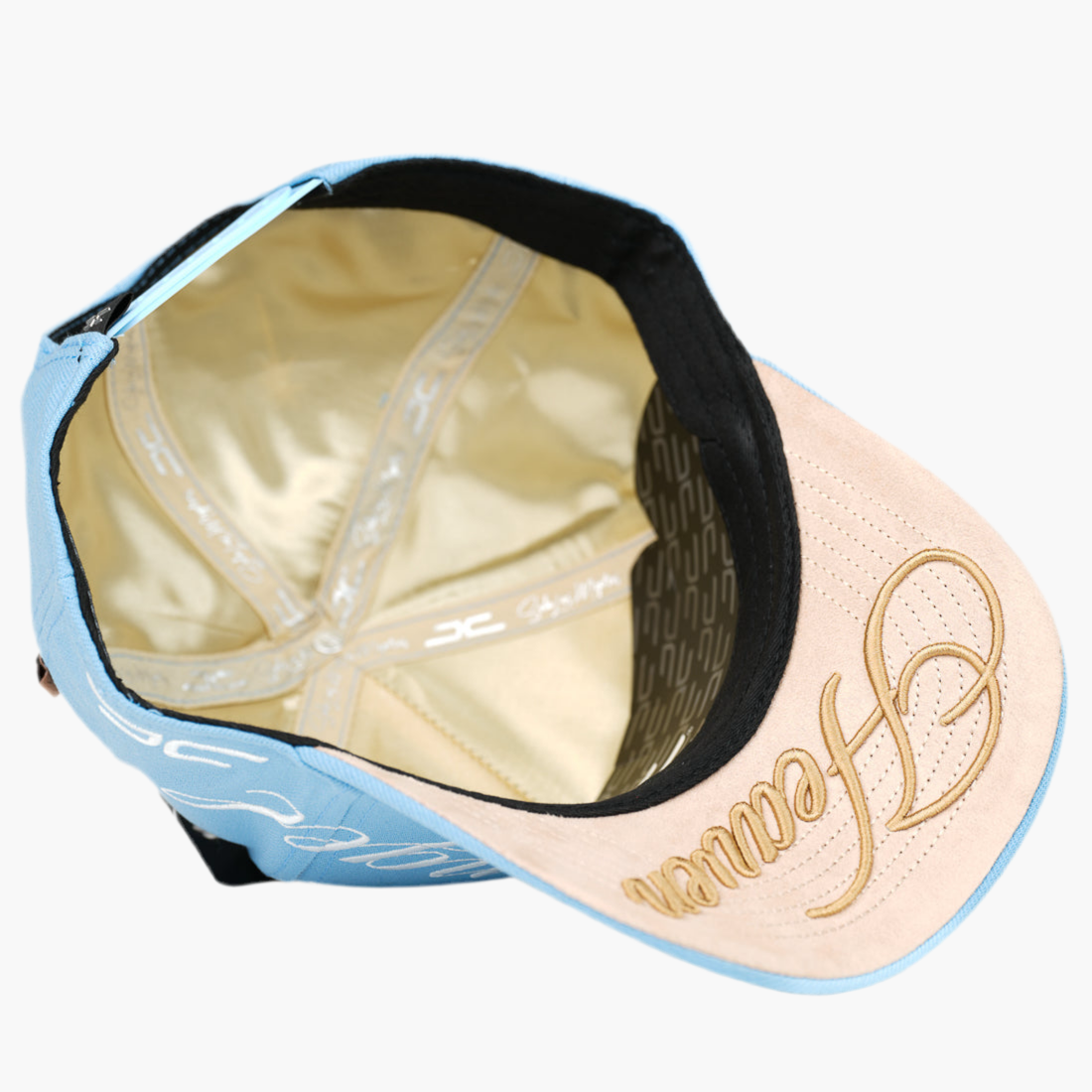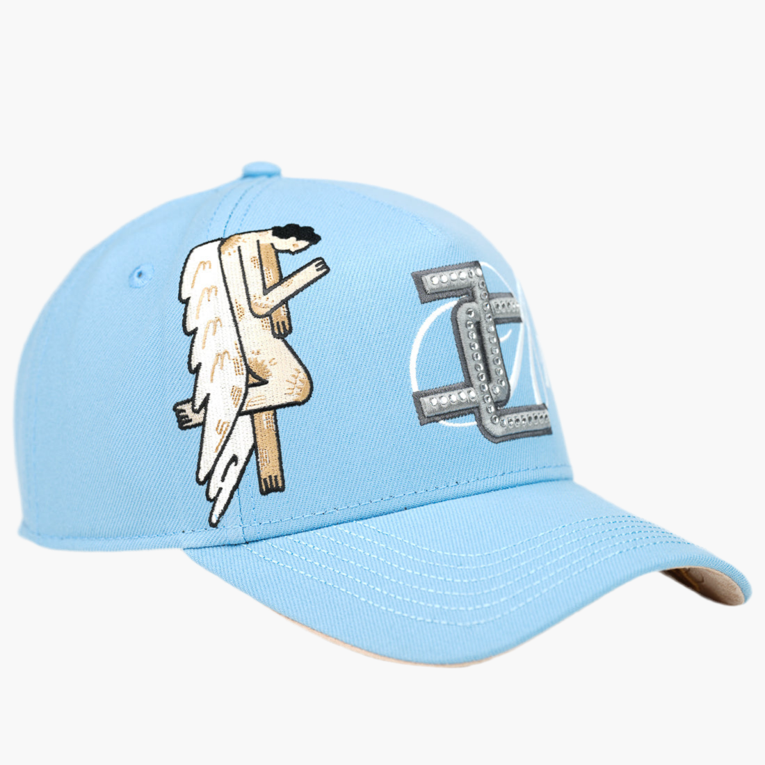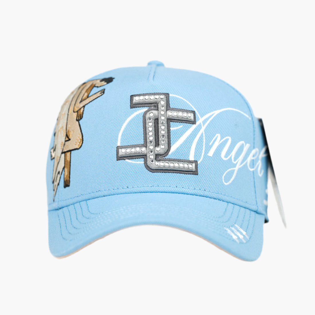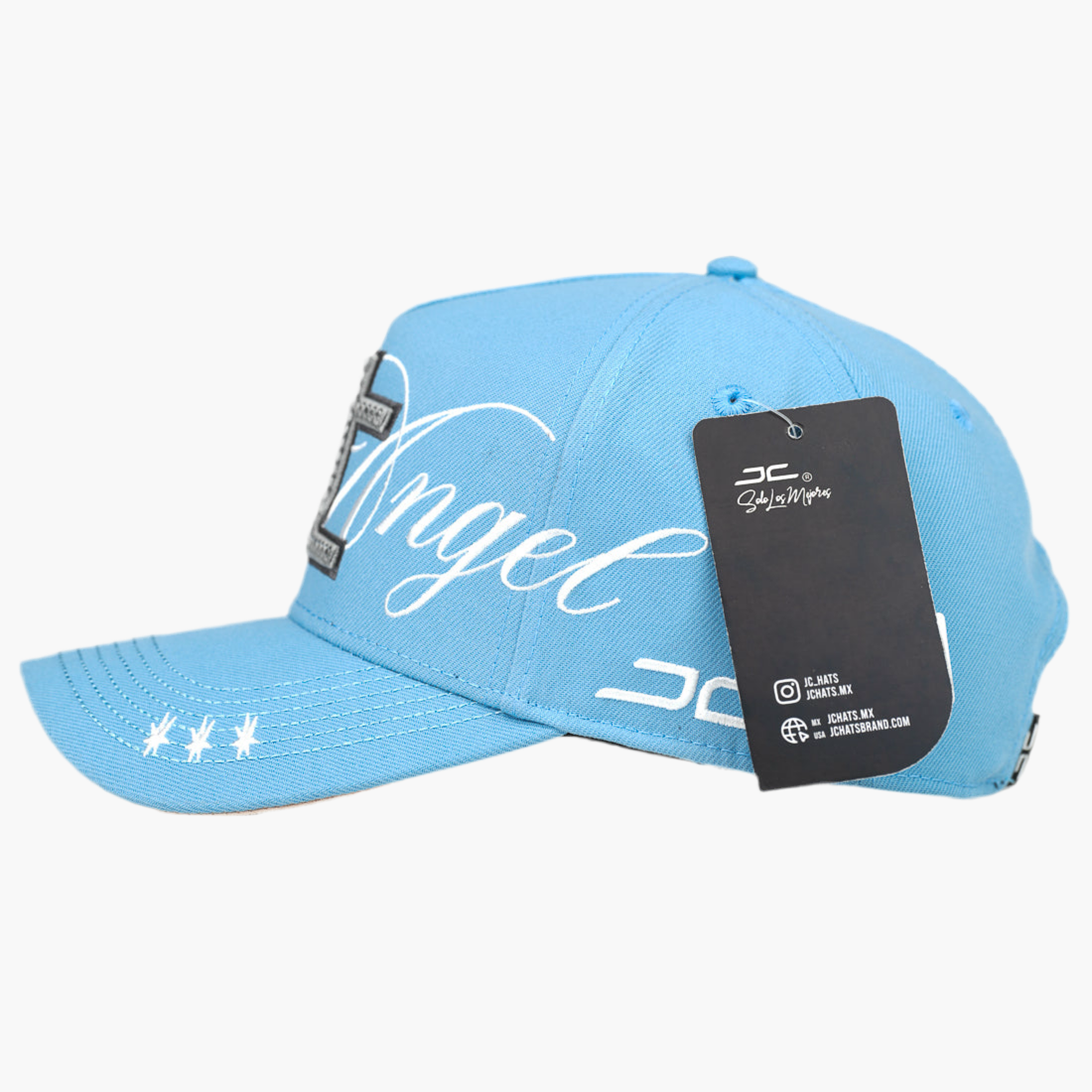 Gorra azul cielo con logo "JC" gris bordado al frente, adornada con piedras brillantes en el lado derecho. Destaca un ángel bordado con alas y, en el lado izquierdo, la palabra "ángeles" en blanco. Un diseño delicado que combina elegancia y un toque celestial único.