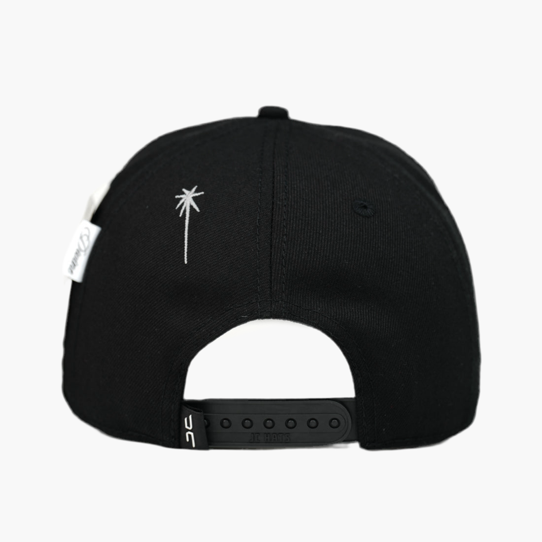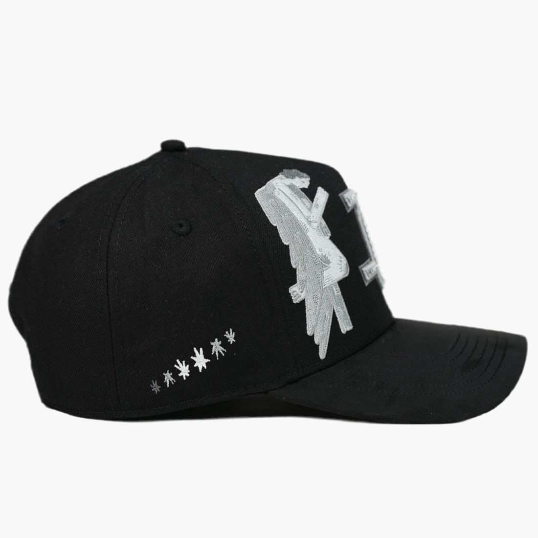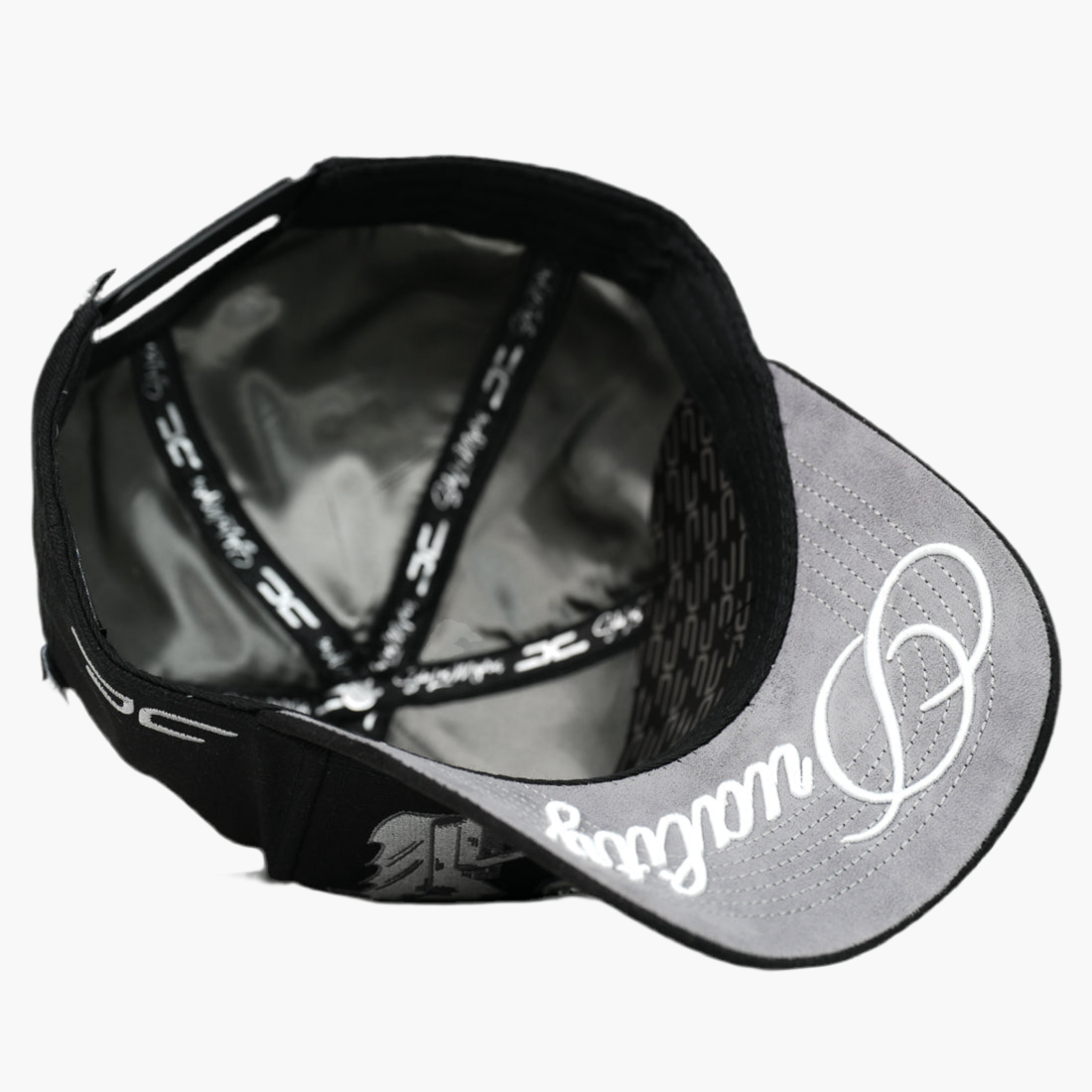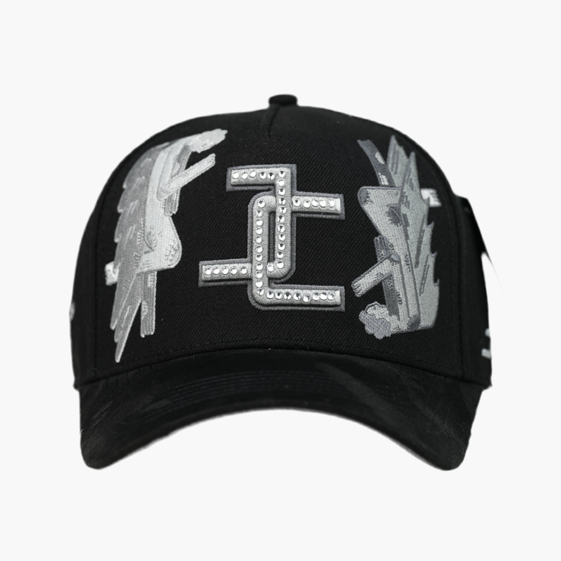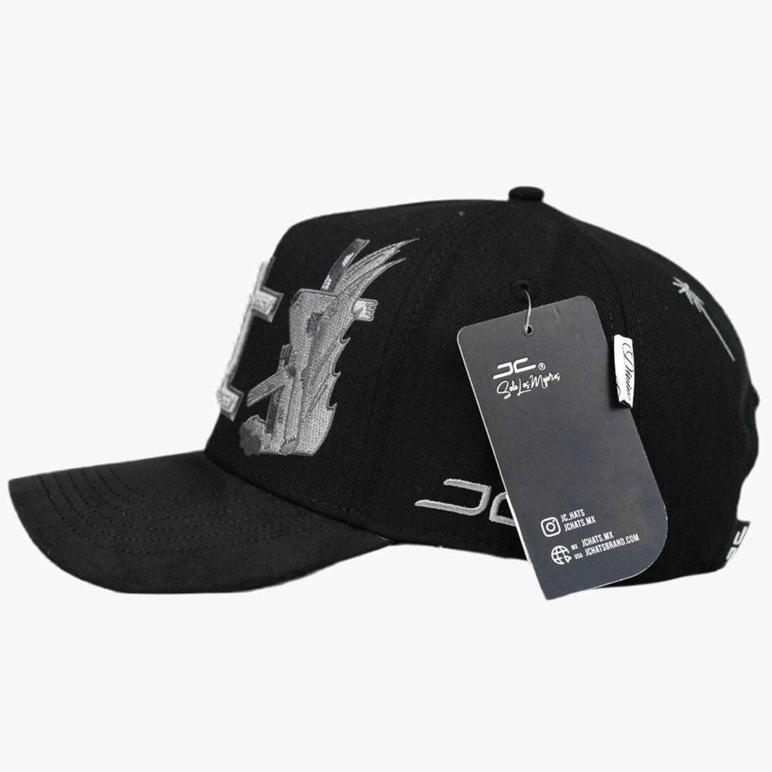 Gorra negra con logo "JC" bordado en gris al frente, adornada con piedras brillantes. A la izquierda, un ángel volteado gris aporta un toque dinámico, mientras que a la derecha, un ángel gris complementa el diseño. Este accesorio combina elegancia y simbolismo en un estilo moderno y único.