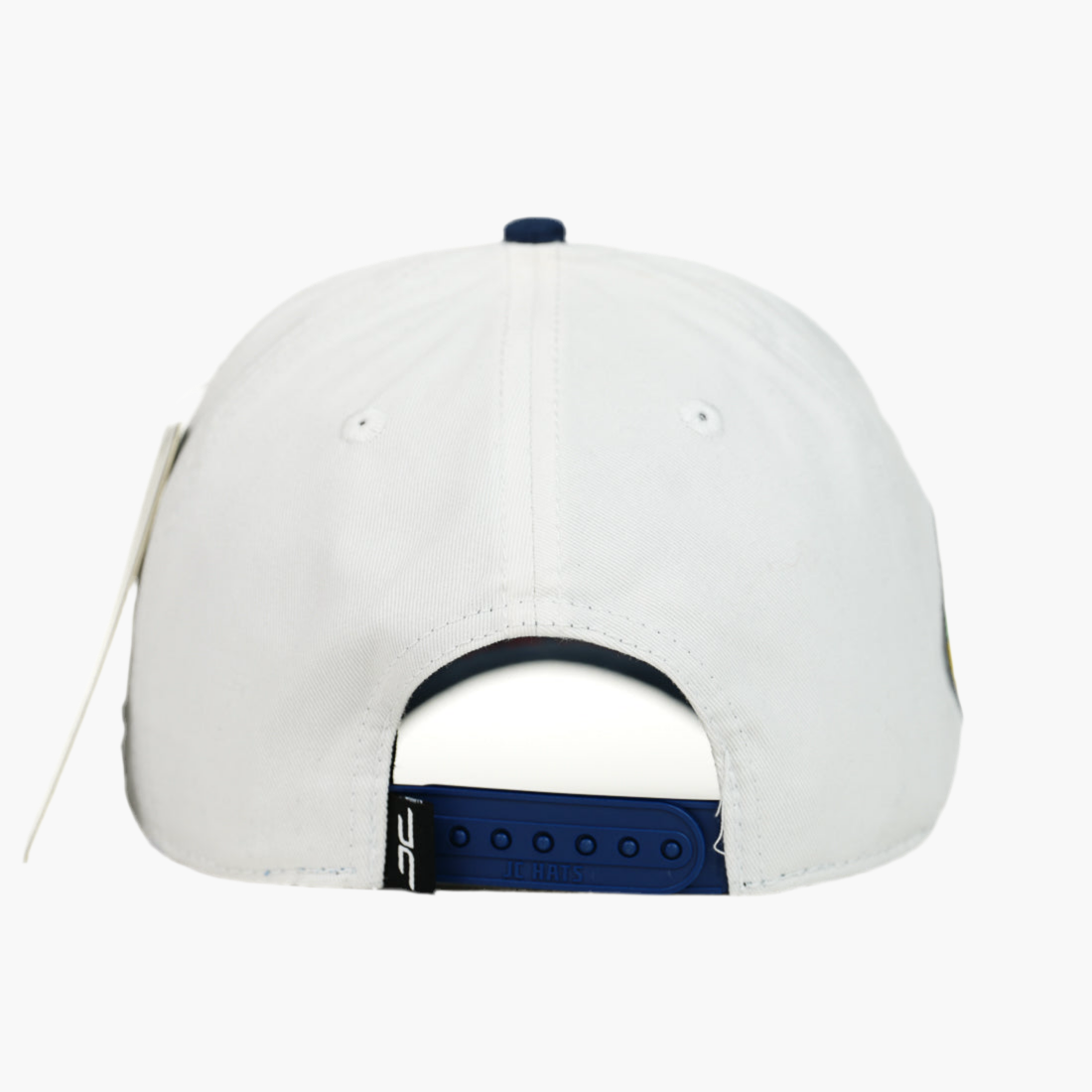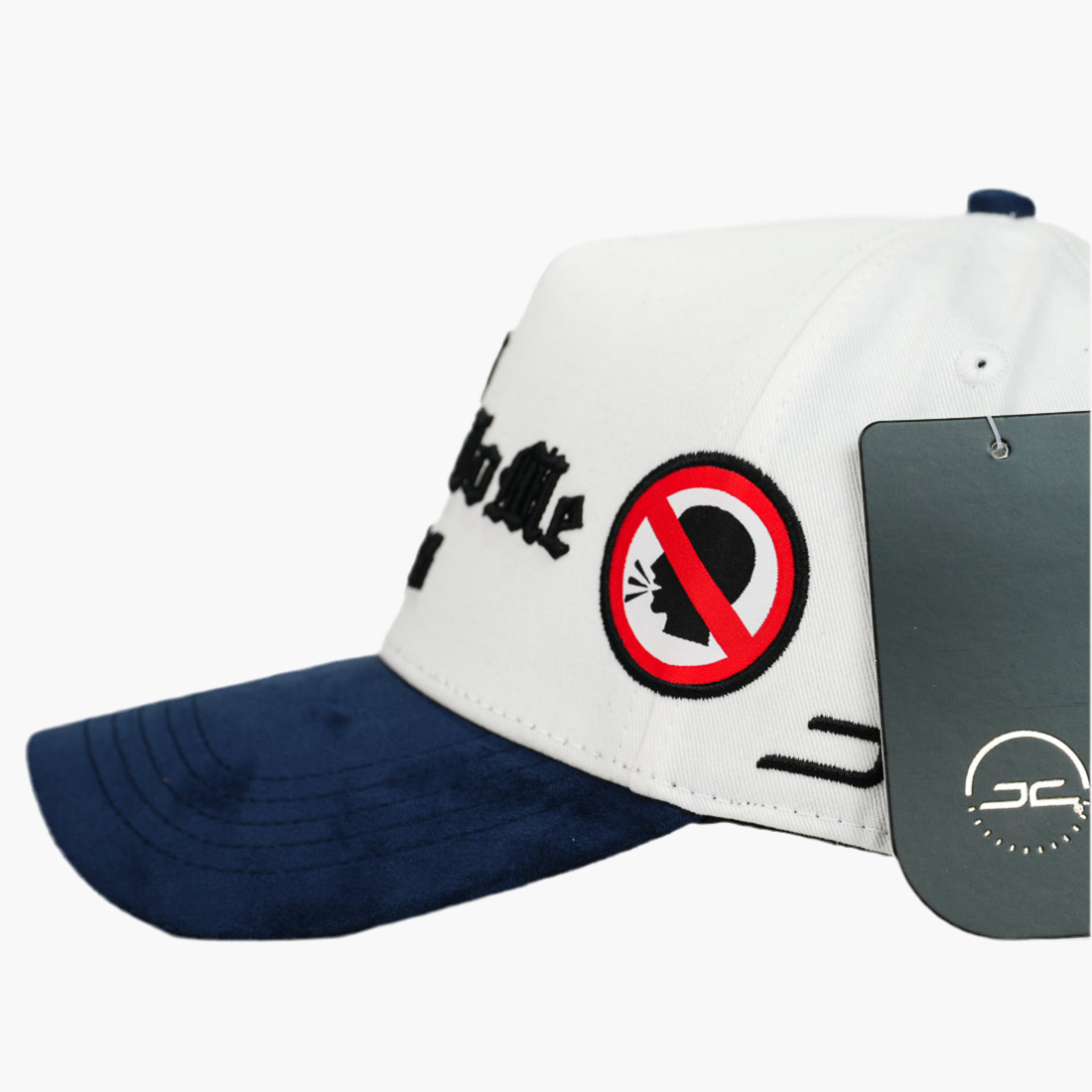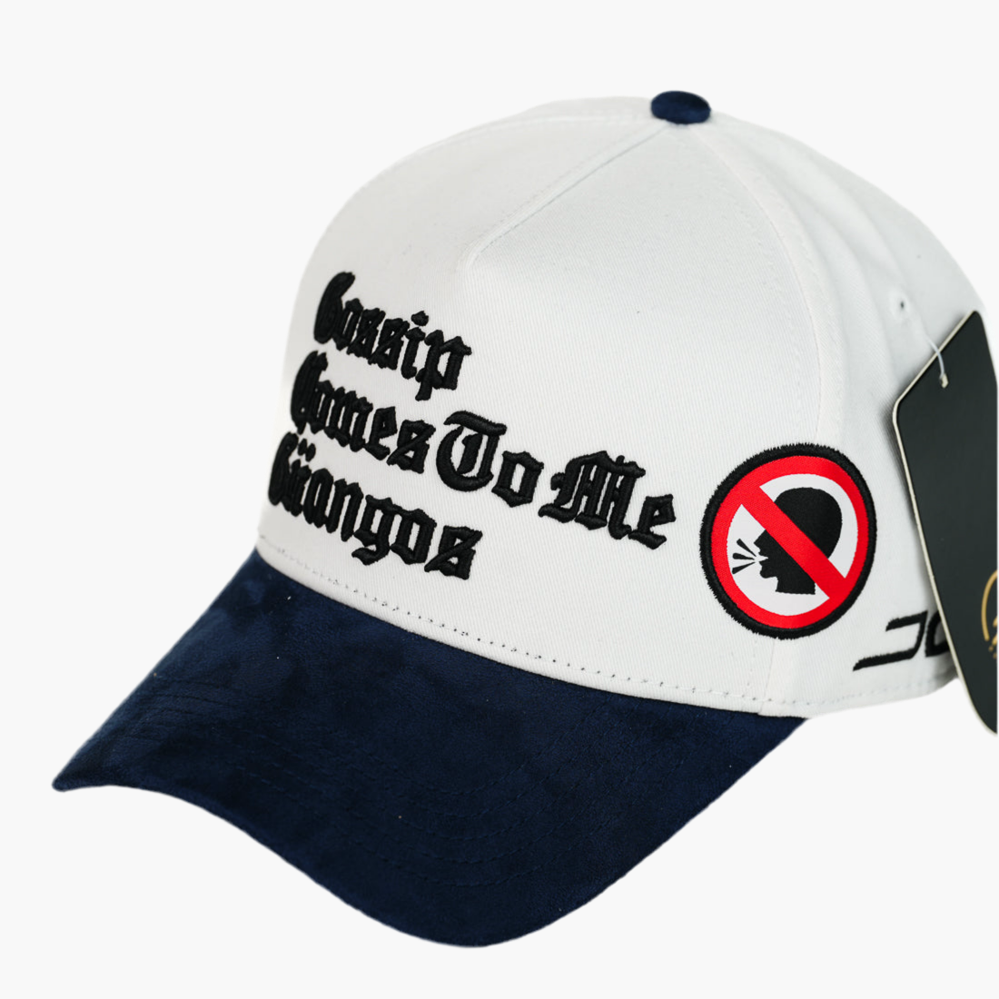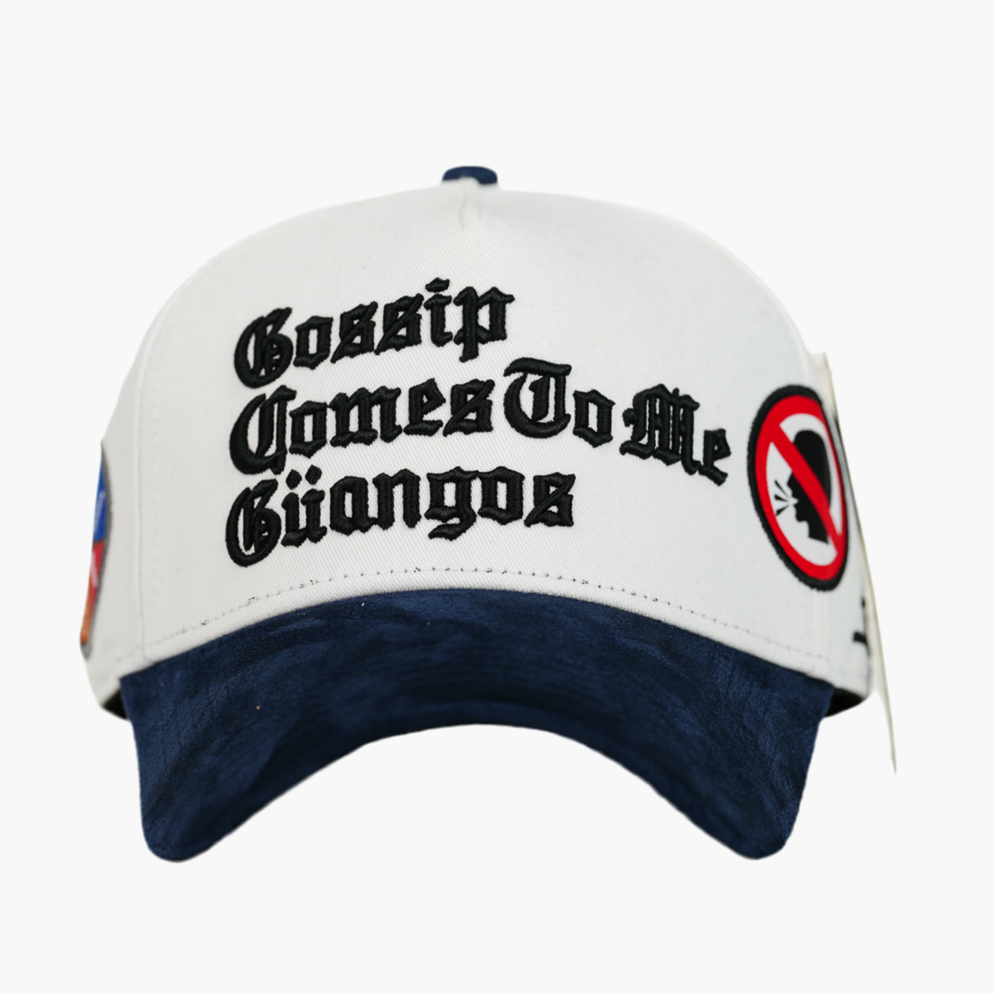 Gorra Blanco con texto bordado en color negro que dice "gossip comes to me guangos" en el frente. La visera azul complementa el diseño, creando un contraste elegante y discreto. Esta gorra ofrece un estilo casual y moderno, perfecta para quienes buscan un toque original en su look diario.