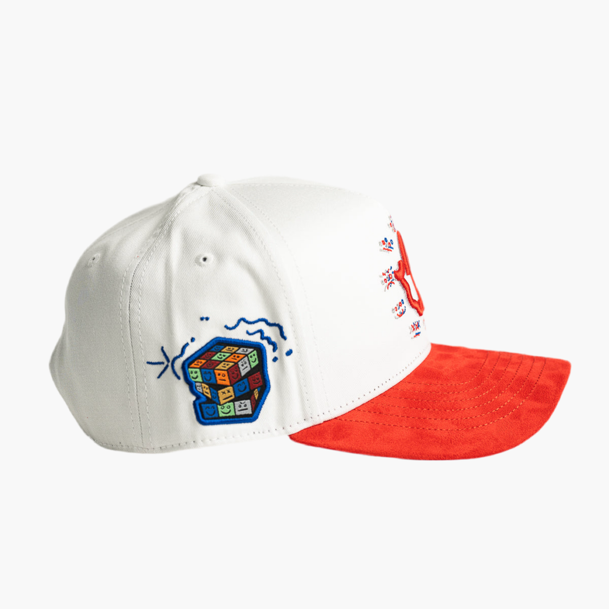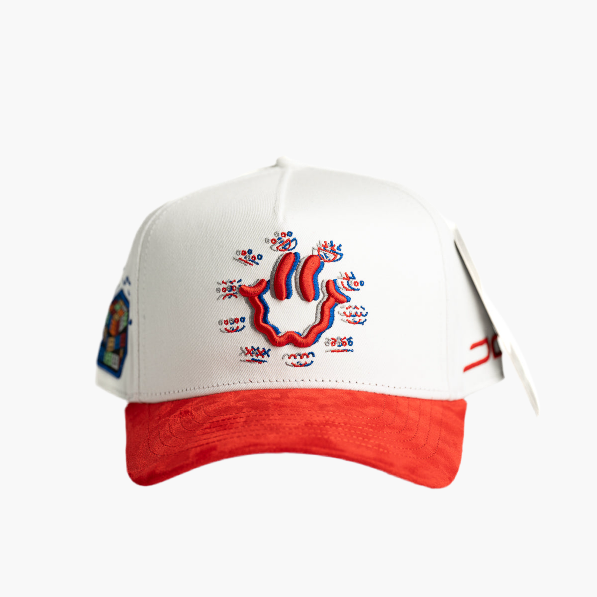Esta gorra blanca destaca por una cara feliz roja en el frente y un cubo Rubik azul en el lado izquierdo. La visera roja añade un contraste vibrante, creando un diseño divertido y moderno. Ideal para quienes buscan un accesorio alegre y llamativo en su estilo diario.
