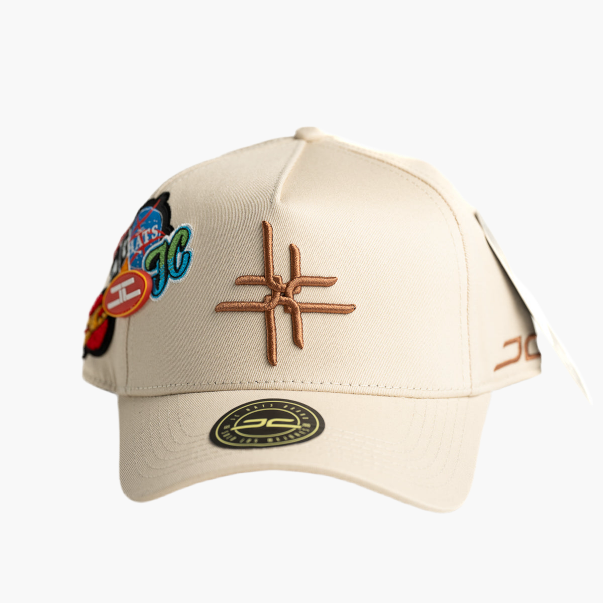Esta gorra beige destaca por su logo "JC" en forma de cruz color café en el centro. En la parte trasera, incluye varios parches variados que añaden un toque único y personalizado. Combina diseño original con materiales de calidad para un estilo moderno y auténtico.