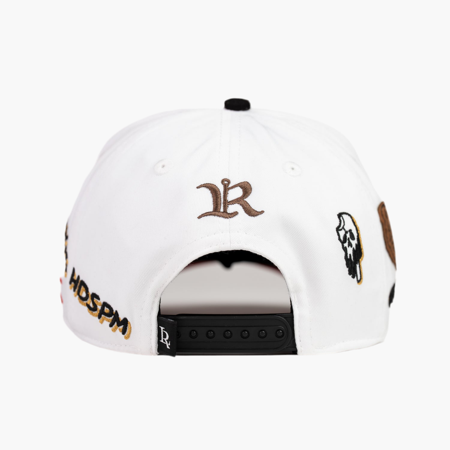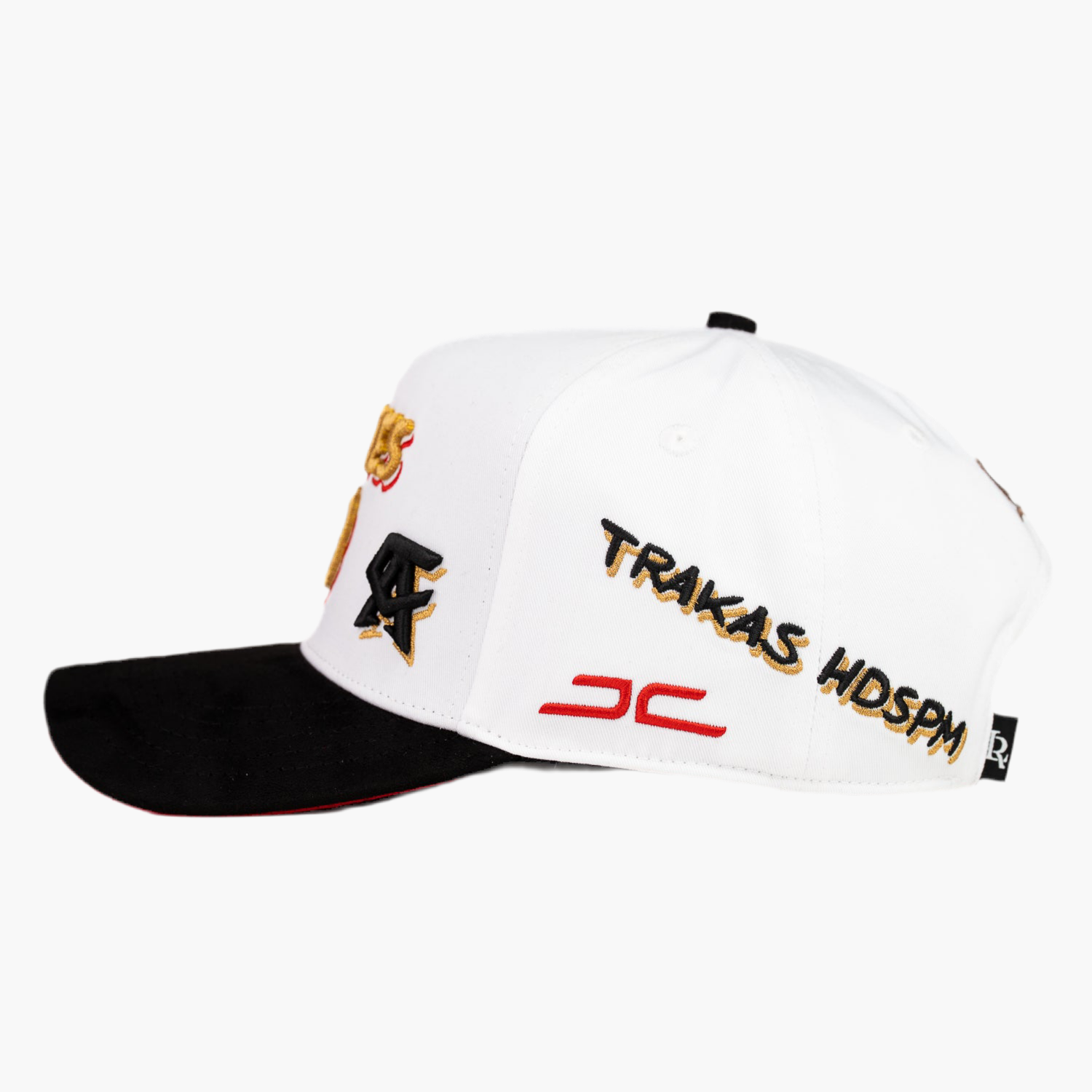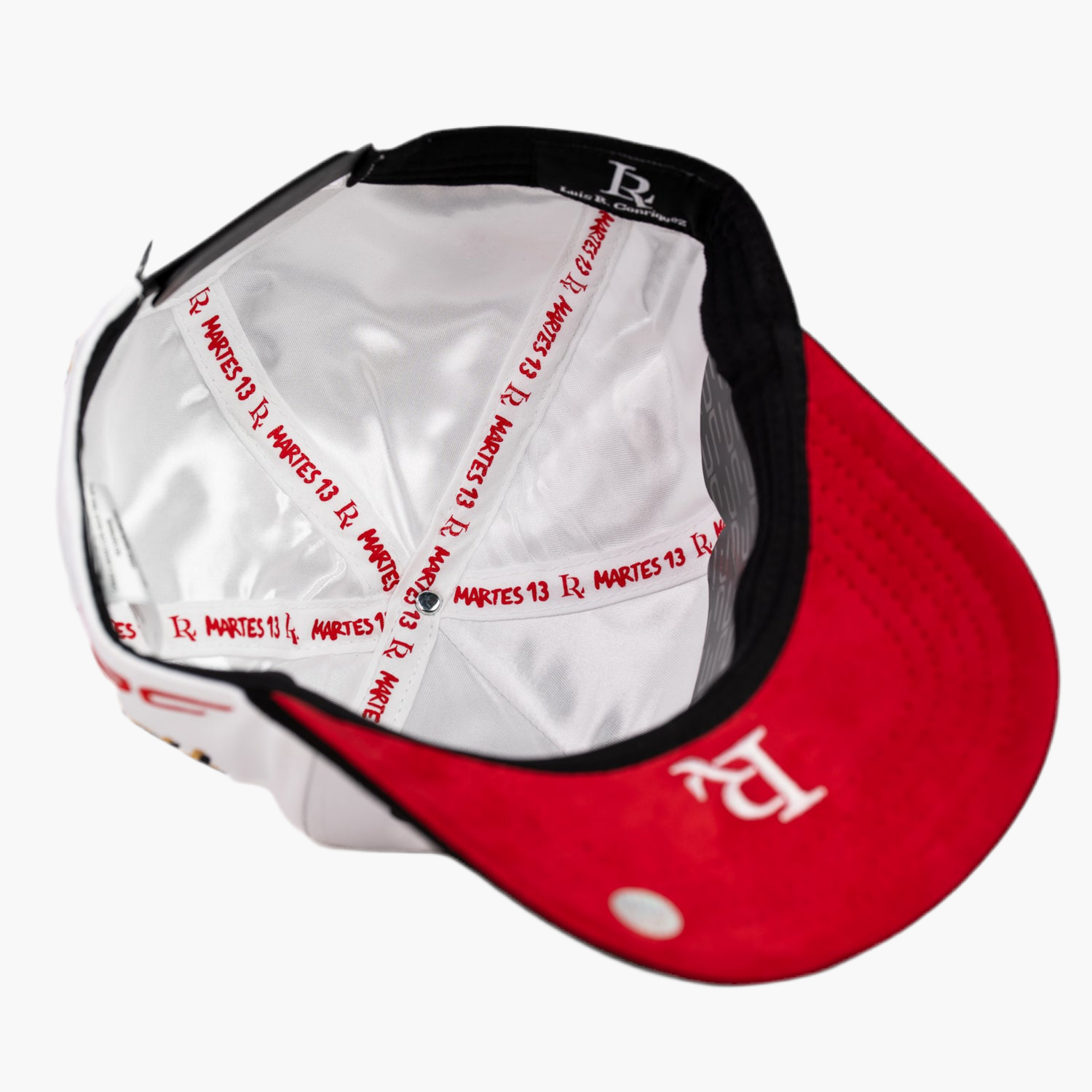 Gorra blanca con el texto "martes 13" bordado en amarillo. En el lado derecho destaca un guante de boxeo, mientras que en la parte trasera aparece el logo LR en amarillo. En la izquierda se lee “Trakas HDSPTM” en el mismo color. Una colaboración exclusiva de LR X CA X JC.