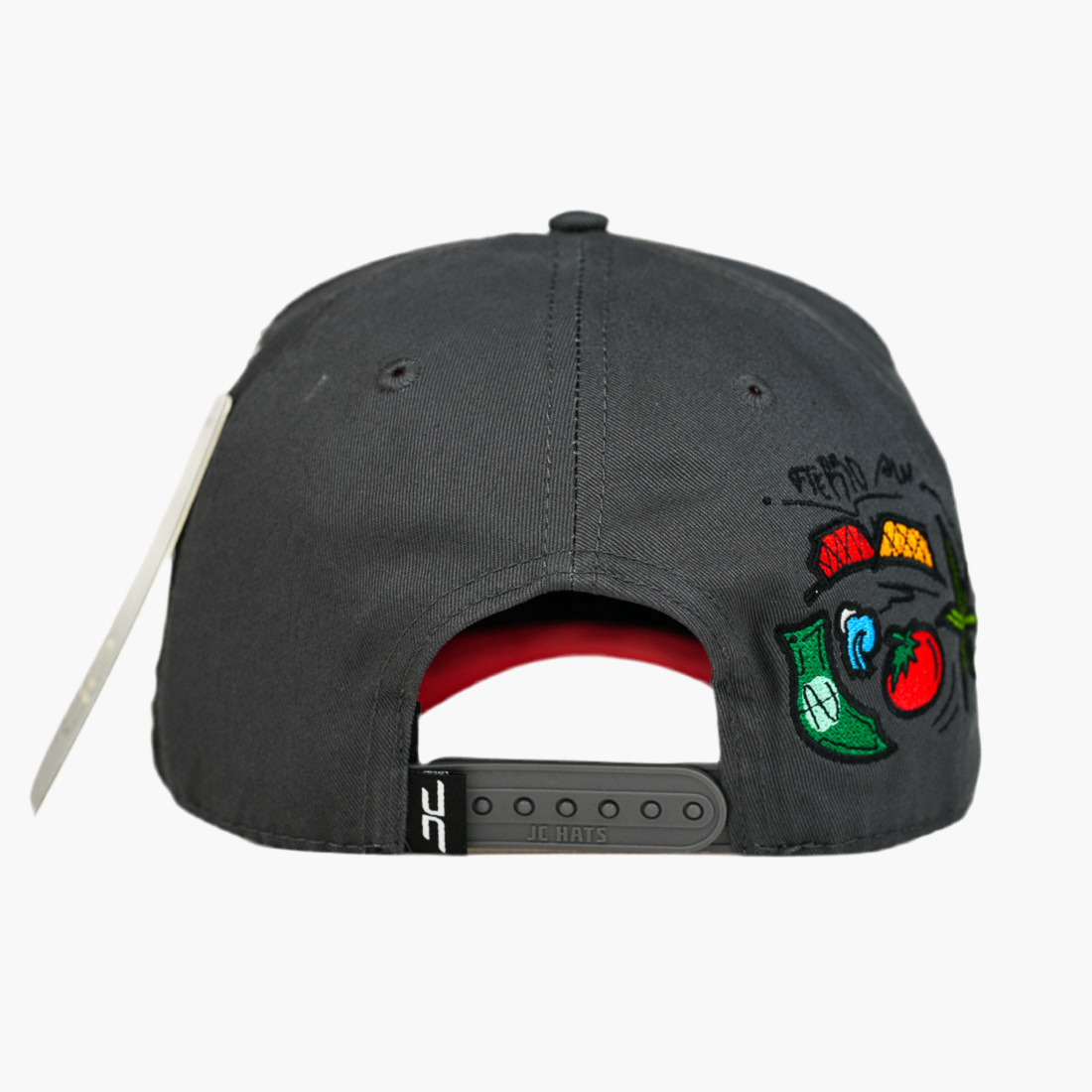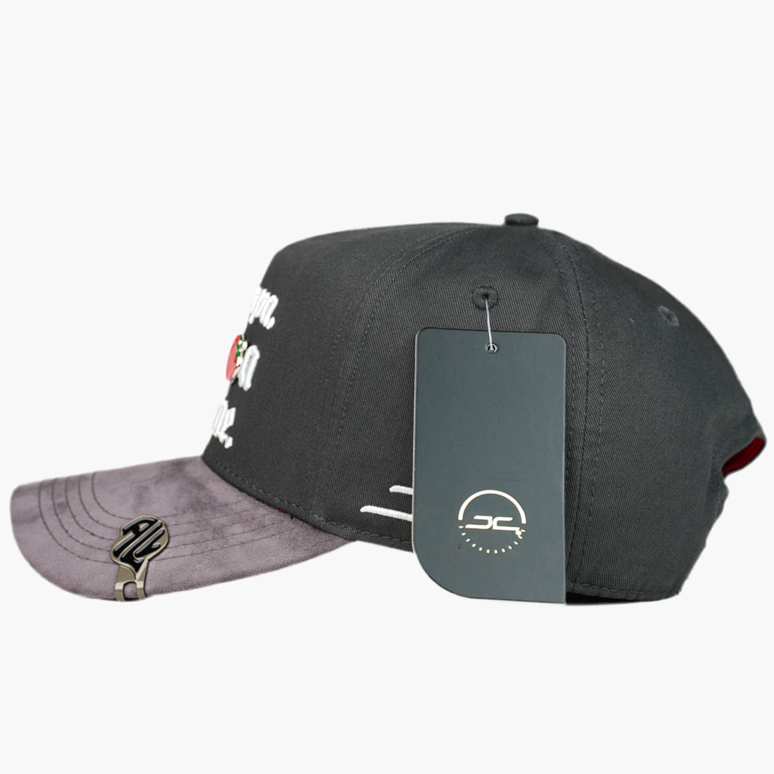 Esta gorra gris presenta en el frente el bordado “no compa Sinaloa is mine”, donde la letra “o” en “Sinaloa” es reemplazada por un pin de tomate, añadiendo un detalle único. A la izquierda, luce el bordado “La Otras JC” en blanco, completando un diseño original y distintivo.