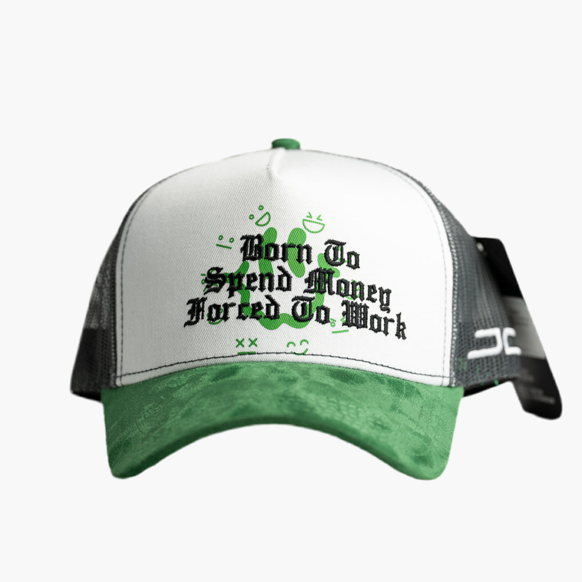 Esta gorra de malla negra combina estilo y ventilación, con un texto bordado en negro en el frente. Detrás del texto destaca una cara feliz verde que añade un toque divertido. La visera verde completa el diseño, haciendo de esta gorra un accesorio fresco y moderno para cualquier ocasión.