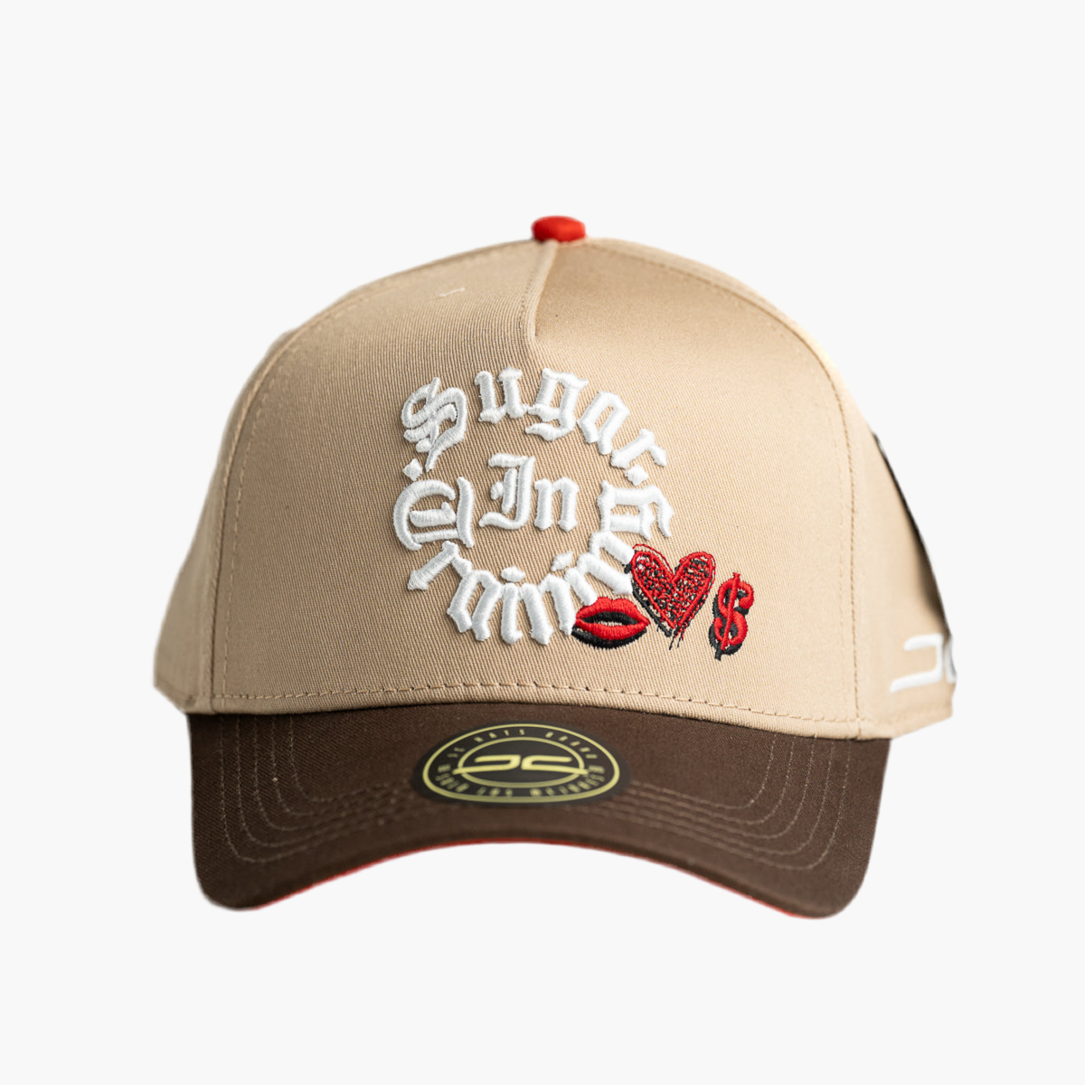 Esta gorra cafe presenta el texto "sugar in TRAINING" en blanco , dispuesto en forma circular en la parte central. Su visera cafe ofrece un contraste elegante, combinando estilo y comodidad para cualquier ocasión casual. Ideal para quienes buscan un accesorio moderno y versátil.
