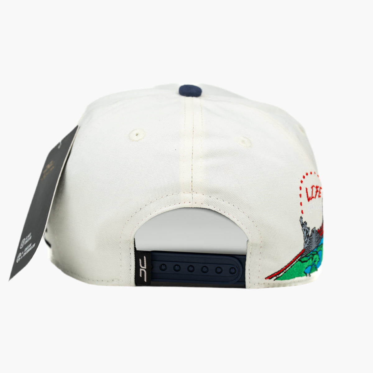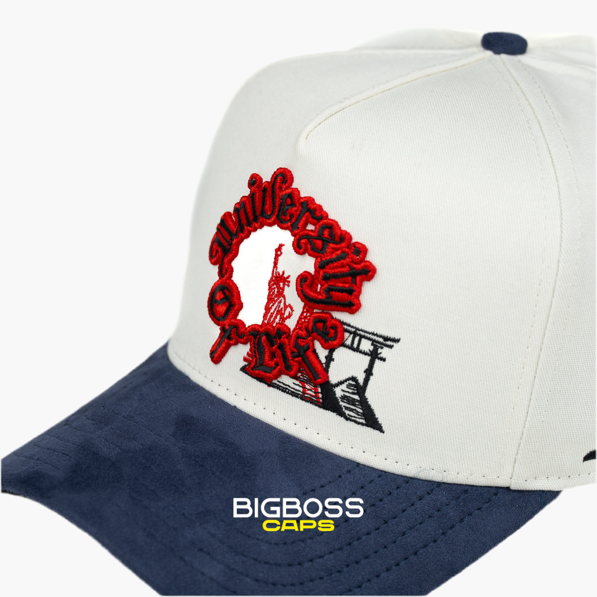 Esta gorra beige presenta en el centro un bordado rojo con la inscripción "University of Life" formando un círculo, en cuyo interior destaca una miniatura de la Estatua de la Libertad. Su diseño combina elegancia y simbolismo, ideal para quienes buscan un estilo significativo y moderno.