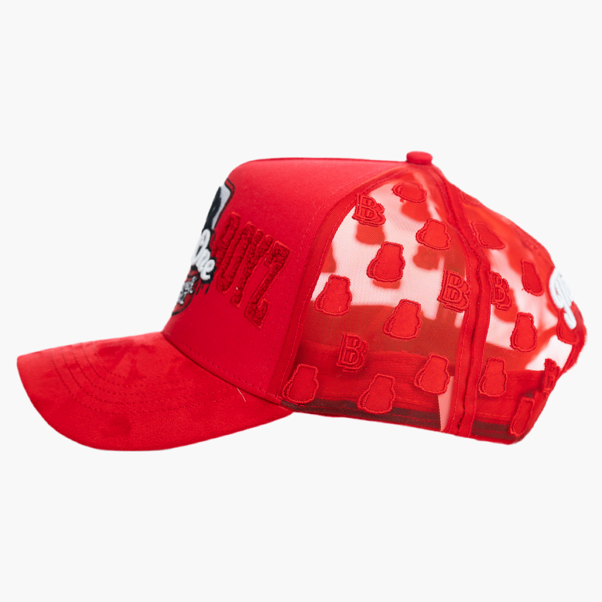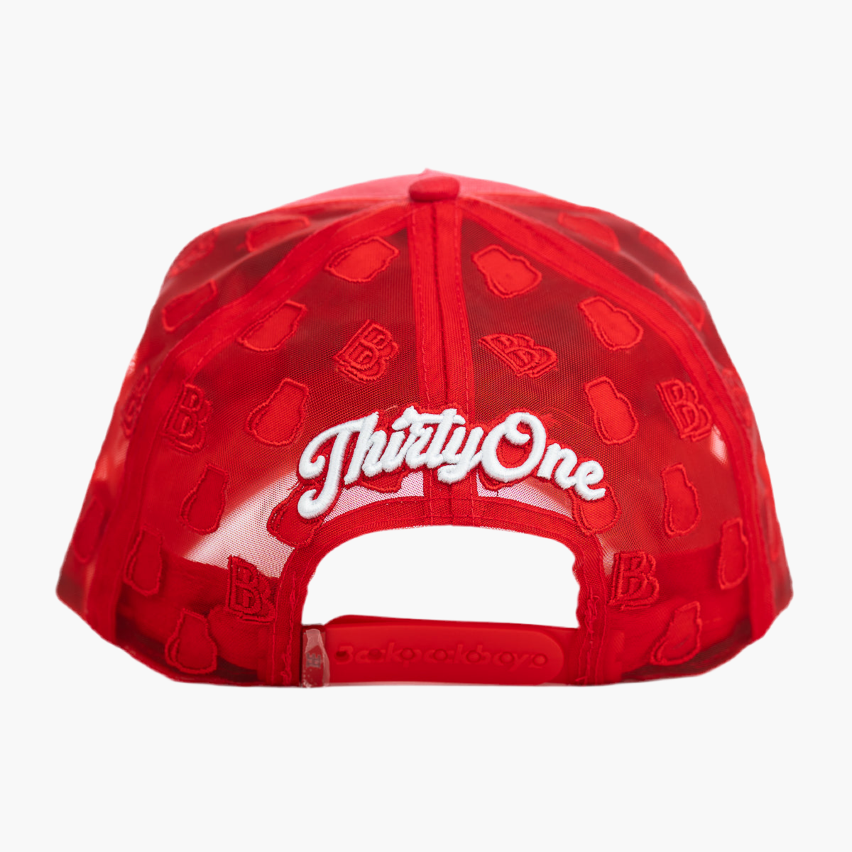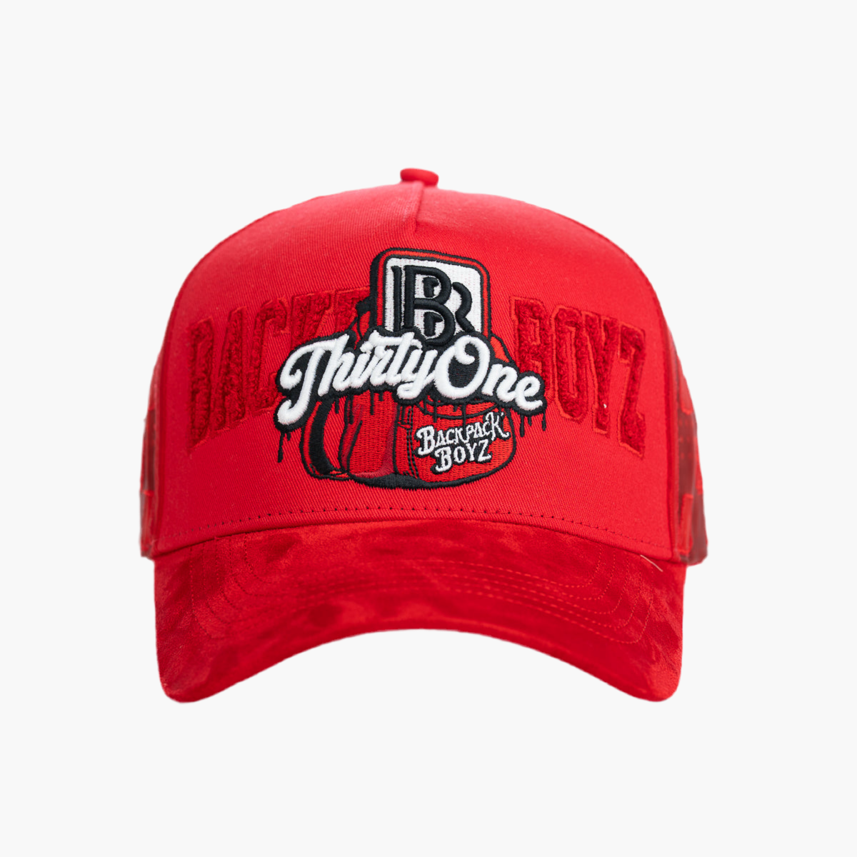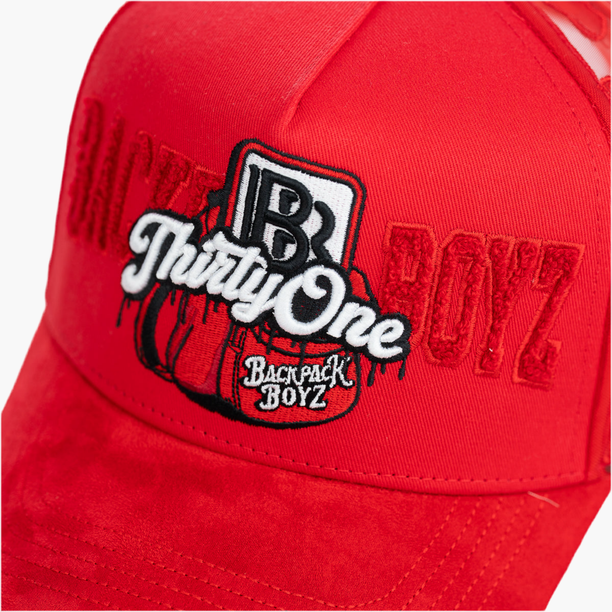 Esta gorra roja de malla muestra en la parte frontal una mochila abierta del mismo color, con un bordado blanco que dice "thirty one". En la parte trasera, destaca en rojo y textura peluda la palabra "Back Boyz", aportando un diseño moderno y con detalles únicos que llaman la atención.