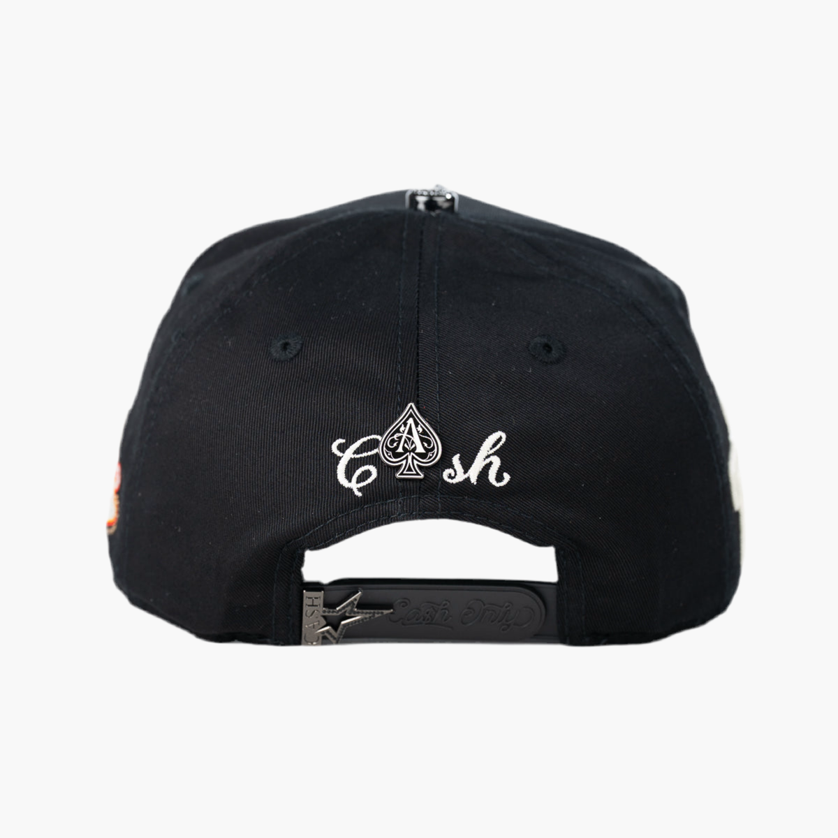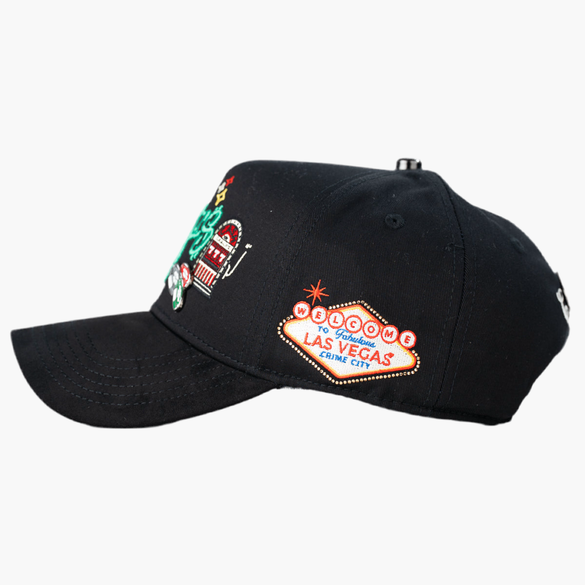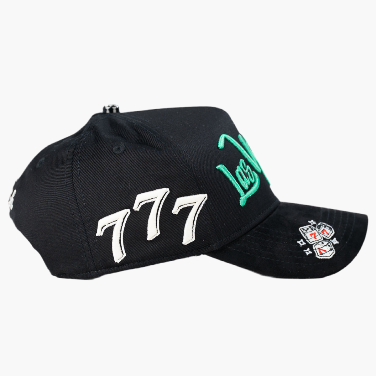 La gorra LAS VEGAS en color negro presenta el texto “Las Vegas” en verde vibrante, con un diseño único: una máquina de casino a un lado y el distintivo 777 al otro. Combina estilo y detalle, ideal para quienes quieren reflejar el espíritu y emoción de la ciudad del juego.